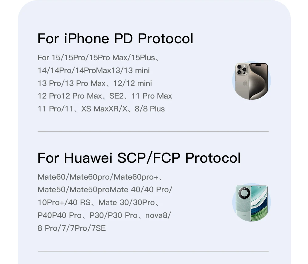 – PD and QC Compatibility: Supports Power Delivery (PD) and Quick Charge (QC) technologies, ensuring broad compatibility with a wide range of modern electronic devices.