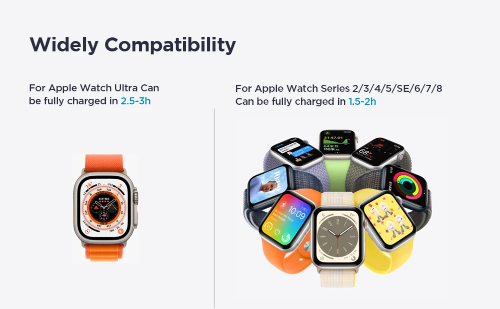 – Compatible with a wide range of Apple Watch models including Series 2 through 8, Ultra, and SE.