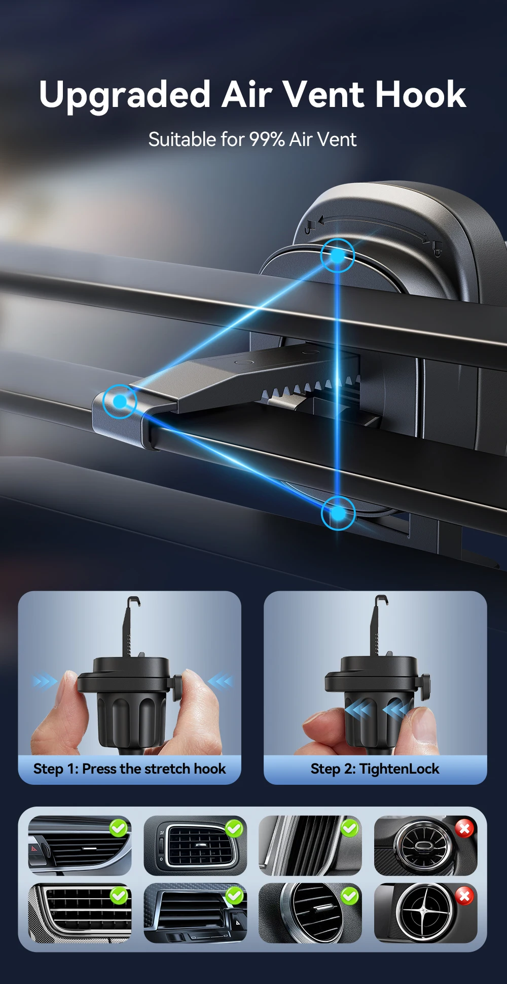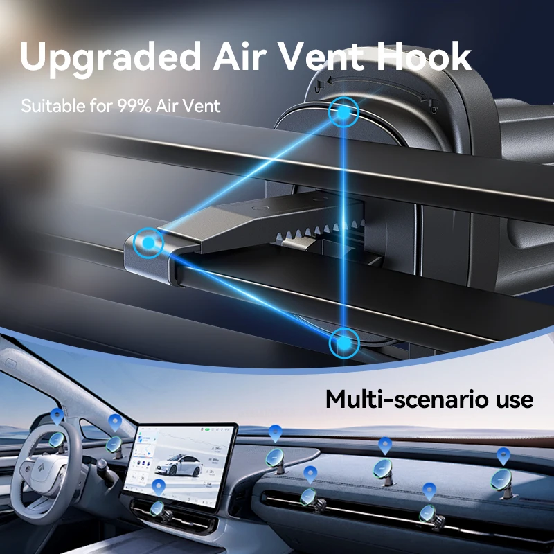 – Dual mounting options for air vent and dashboard installation provide flexible positioning to suit your vehicle interior.