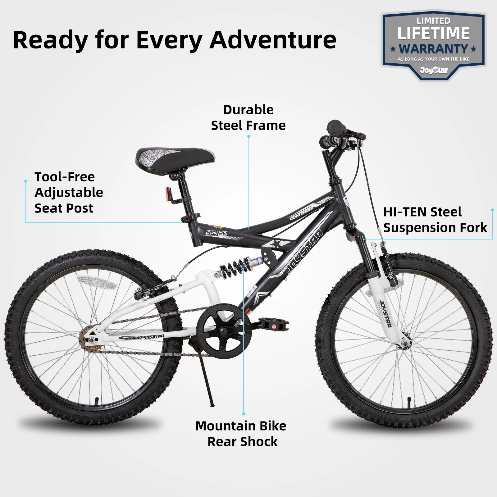 The JOYSTAR 20 Inch Kids’ Bike is expertly designed to provide children aged 5 to 13 years old with a safe, comfortable, and exciting cycling experience. Perfect for beginners and young enthusiasts alike, this dual-suspension mountain bike combines durability with style, encouraging active play and outdoor exploration. Available in four vibrant colors—Blue, Black, Pink, and Green—this bike is ready to inspire adventure wherever it goes.