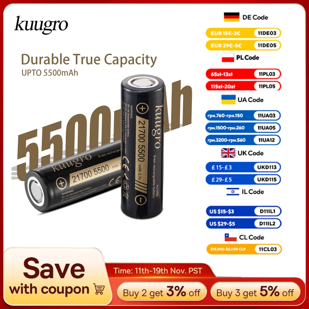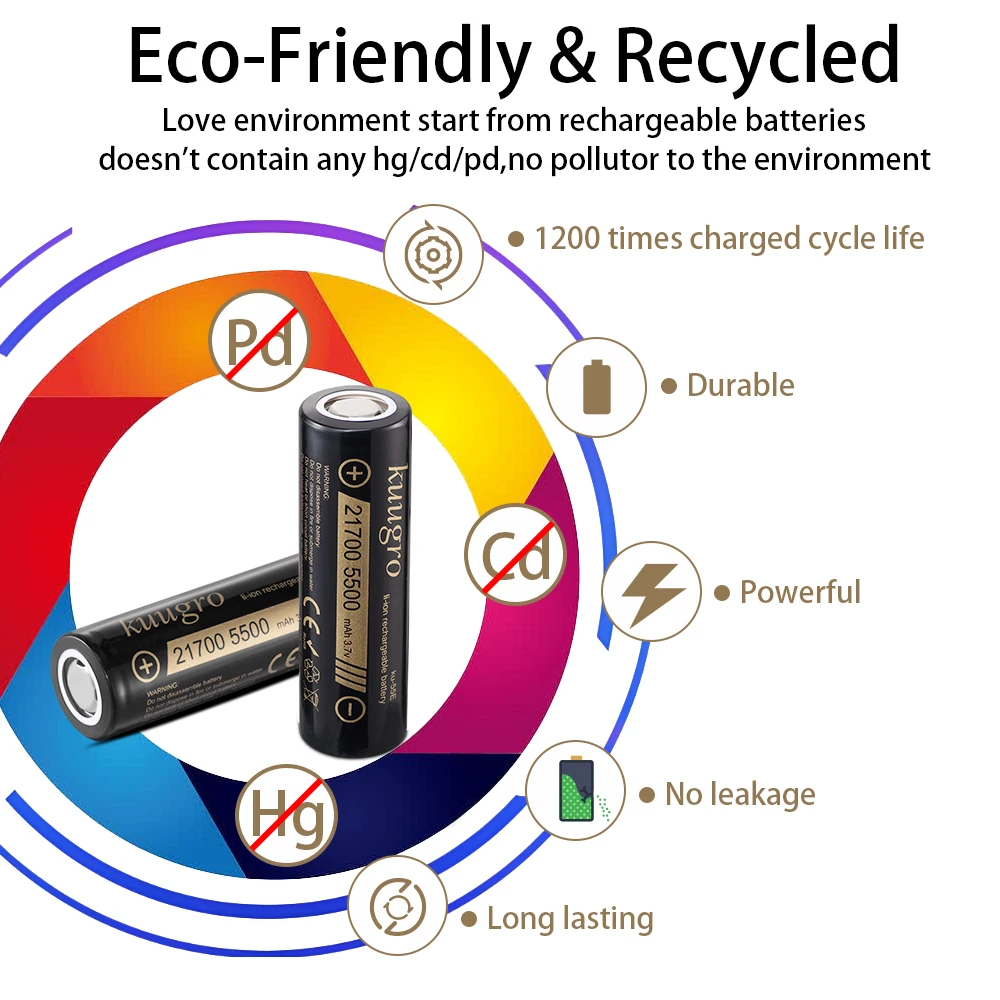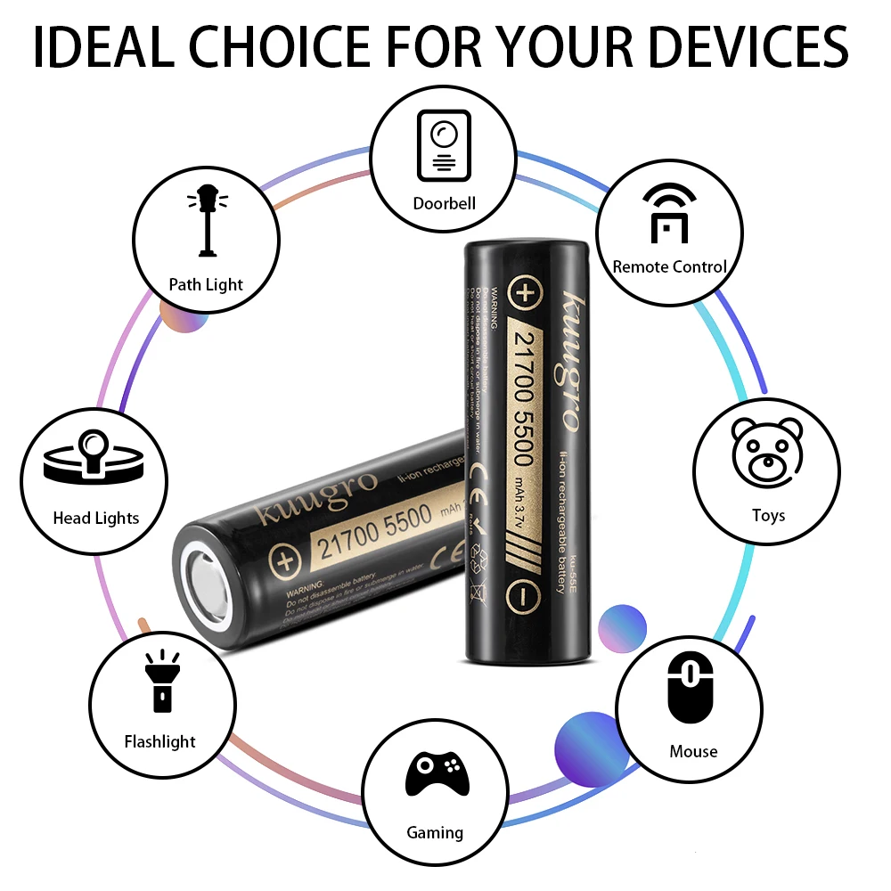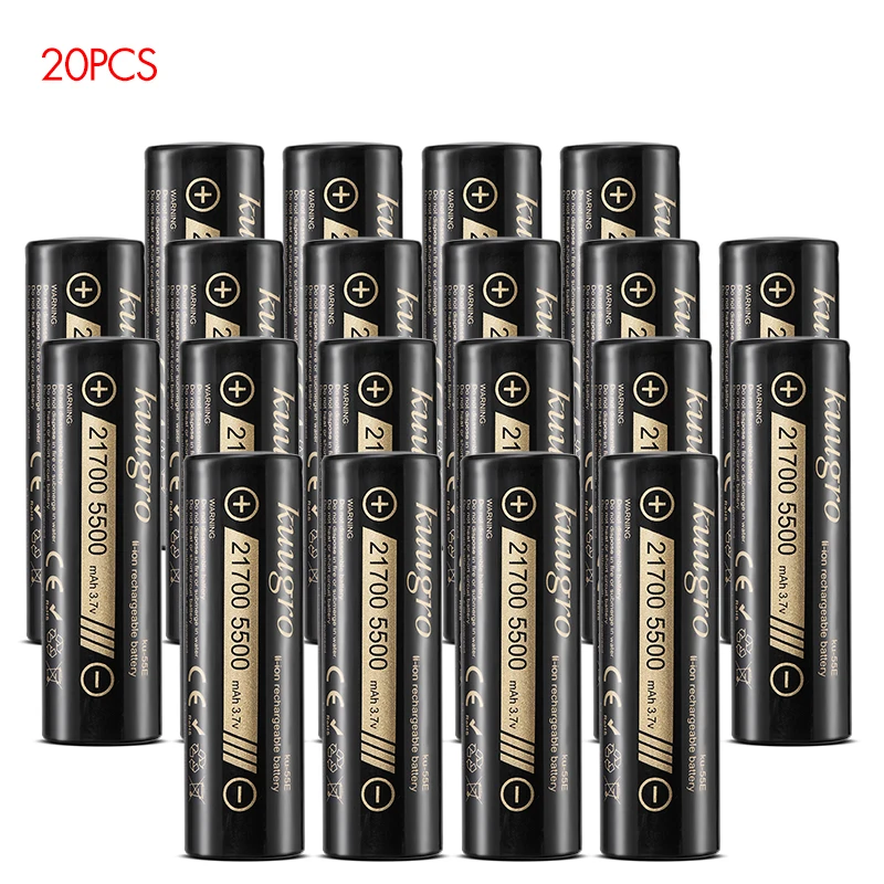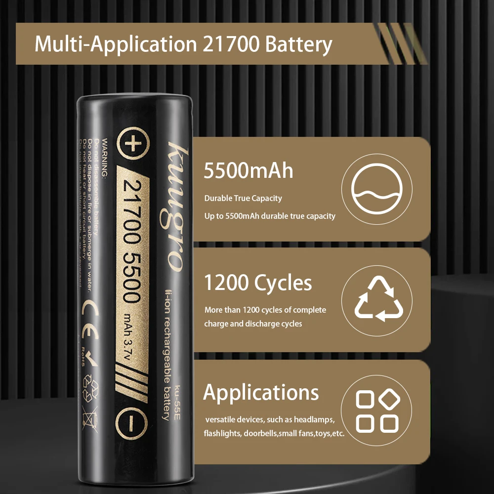Power your high-demand devices with Kuugro ku-55 E 21700 rechargeable lithium batteries. Featuring 5500mAh capacity, 3.7V nominal voltage, and 2C discharge rate, these high-power cells deliver reliable, long-lasting energy. Available in multiple pack sizes to suit your needs.