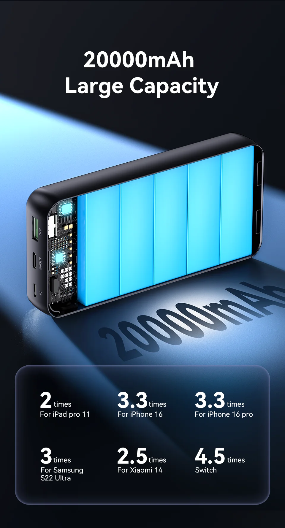 – High-capacity 20000mAh battery delivers multiple full charges for smartphones and tablets.