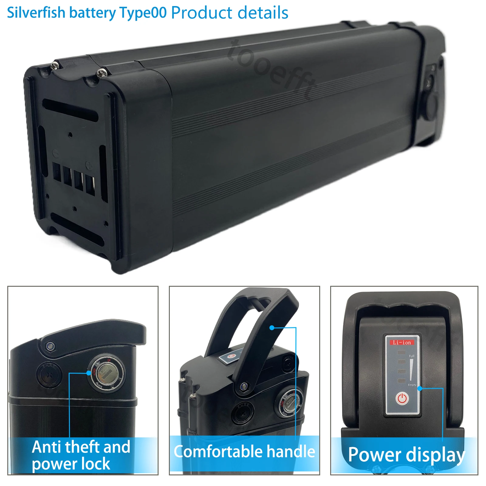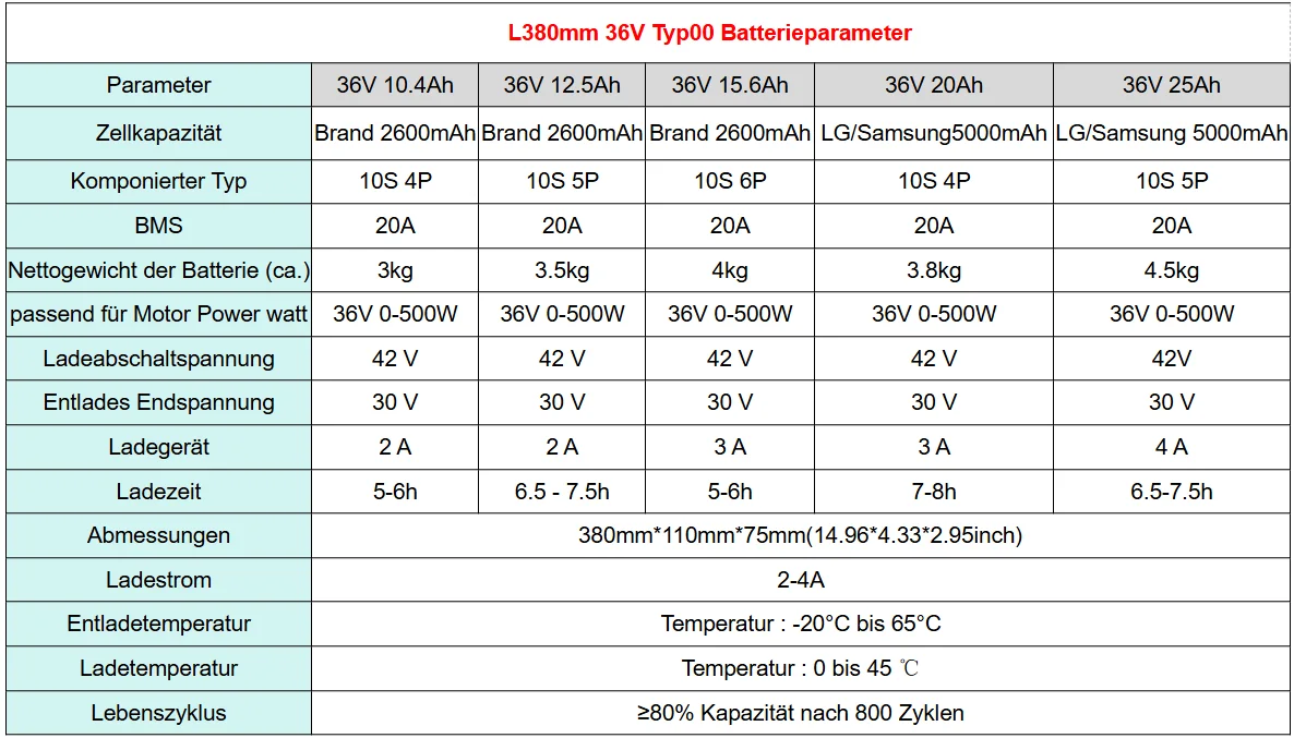 – Available in multiple voltage and capacity configurations: 36 V (10.4 Ah, 12.5 Ah, 15.6 Ah, 20 Ah, 25 Ah) and 48 V (15.6 Ah, 20 Ah) to suit various e-bike models and rider needs.