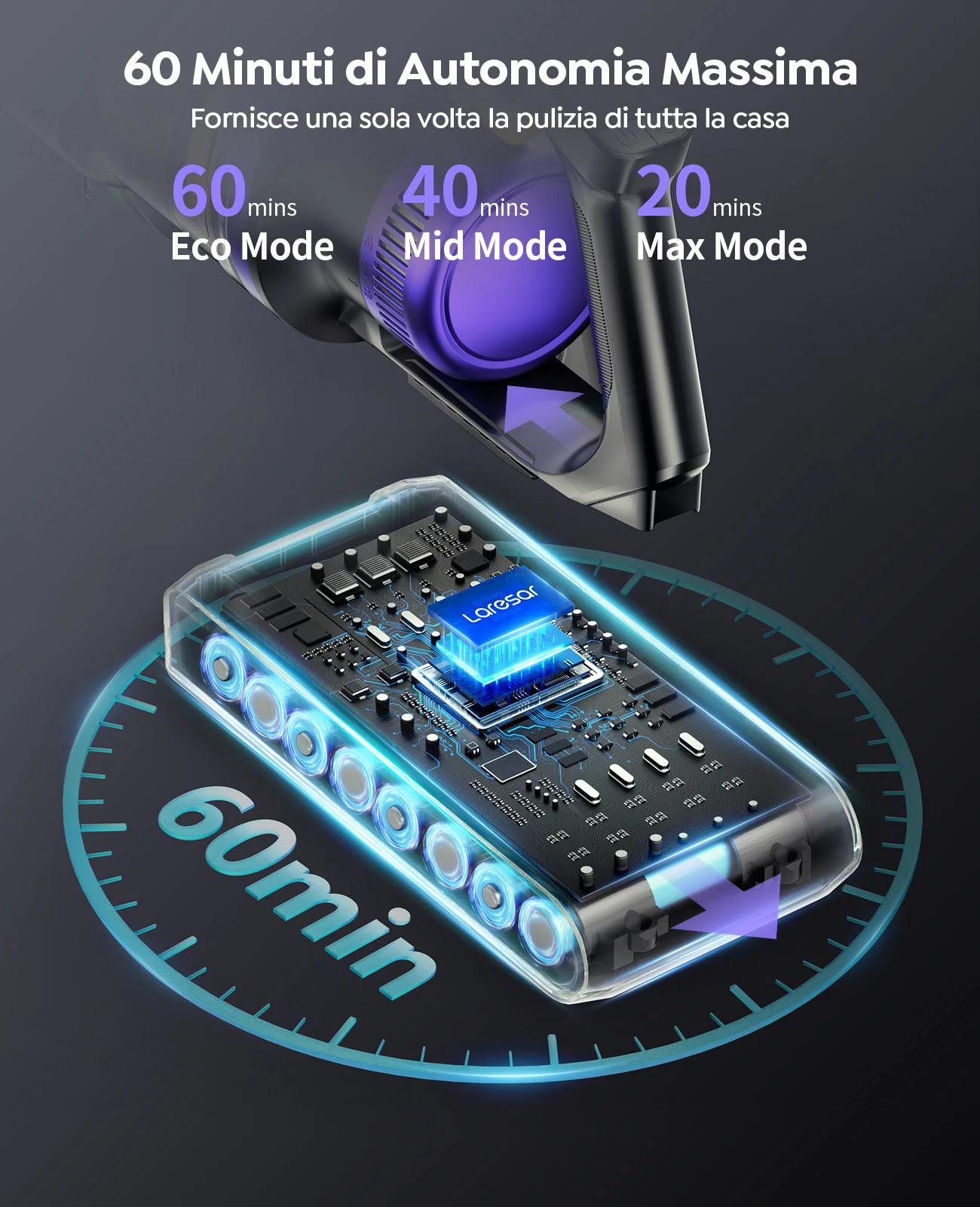 Imagine a home that is consistently spotless with minimal effort. The Laresar X11 makes this a reality. Its extended 60-minute runtime ensures you can clean your entire home on a single charge, eliminating the need for frequent recharges. The included 3-piece filter set captures 99.9% of allergens and fine dust particles, contributing to a healthier living environment for you and your family. Whether it's daily tidying or deep cleaning, this vacuum adapts to your needs.