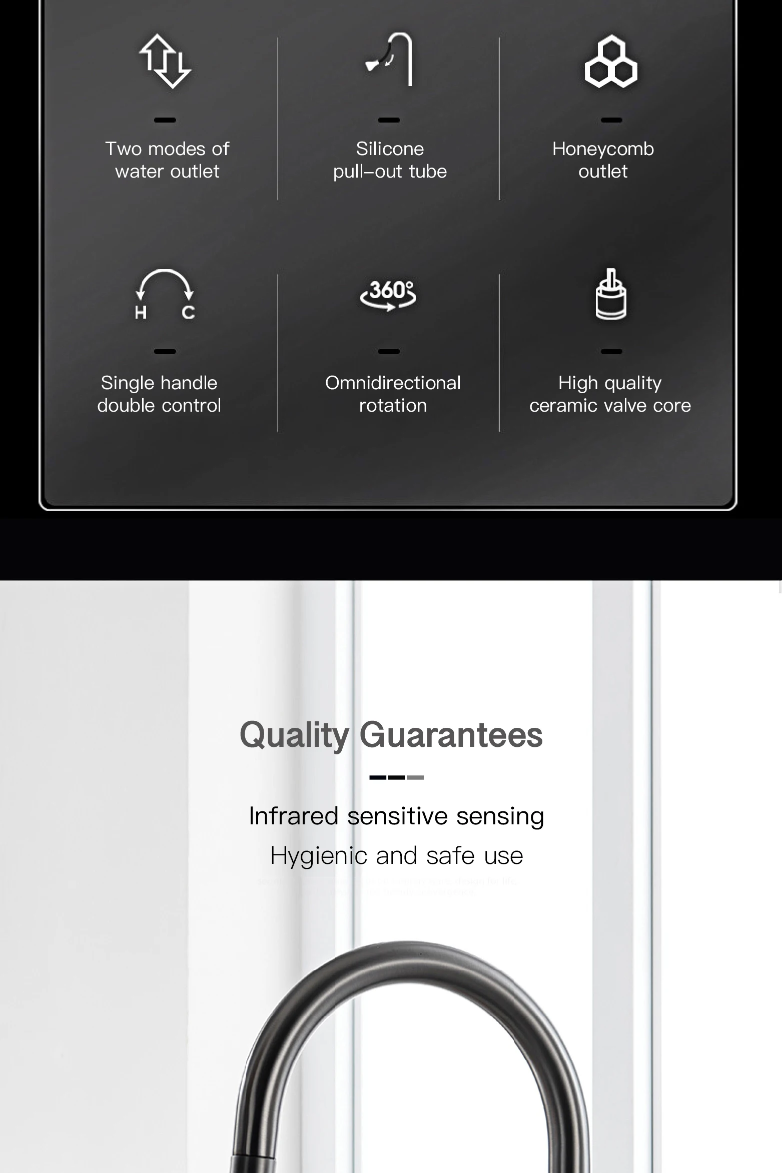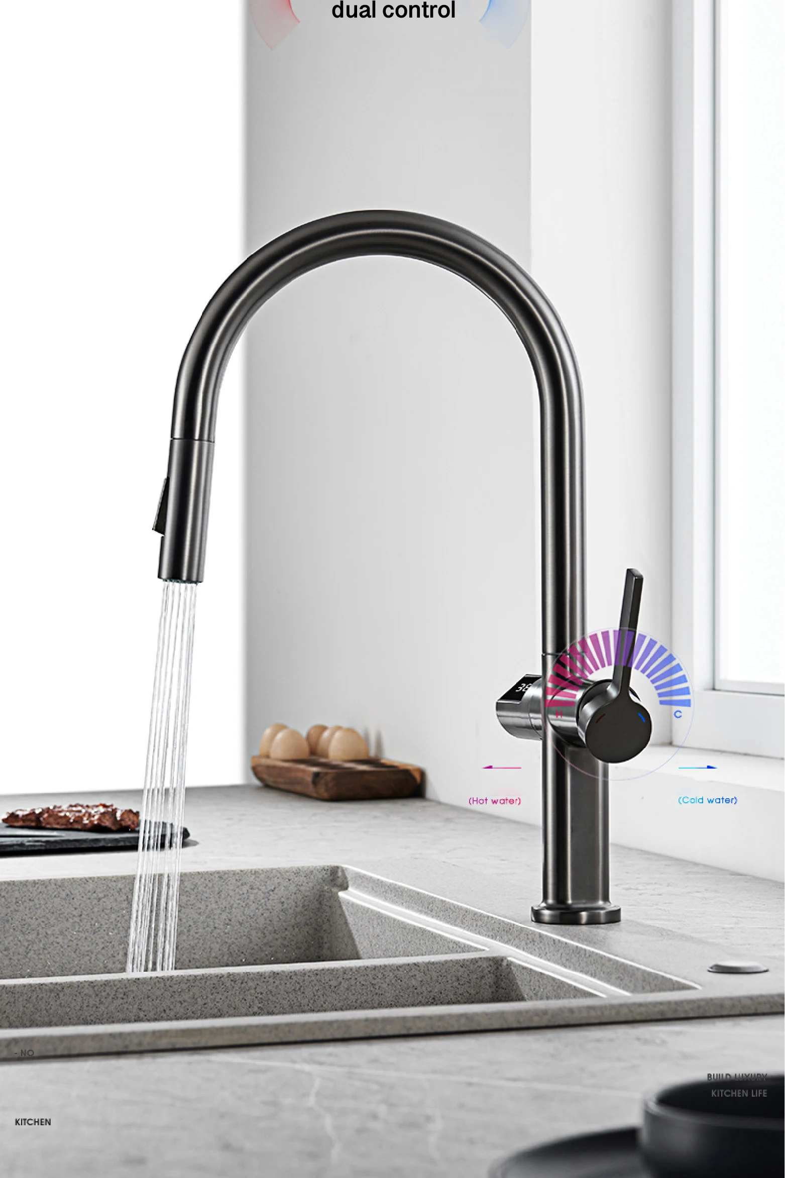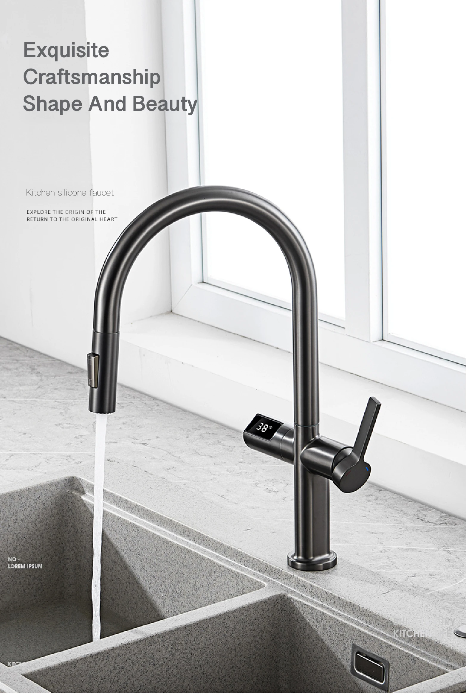 Transform your kitchen into a hub of modern convenience and sophisticated style with our Light Luxury Gun Gray Brass Kitchen Faucet. This isn’t just a faucet; it’s an intelligent addition to your culinary space, blending cutting-edge technology with premium craftsmanship. Designed for the discerning homeowner, it offers unparalleled control over your water temperature and flow, all presented with an elegant, minimalist aesthetic.