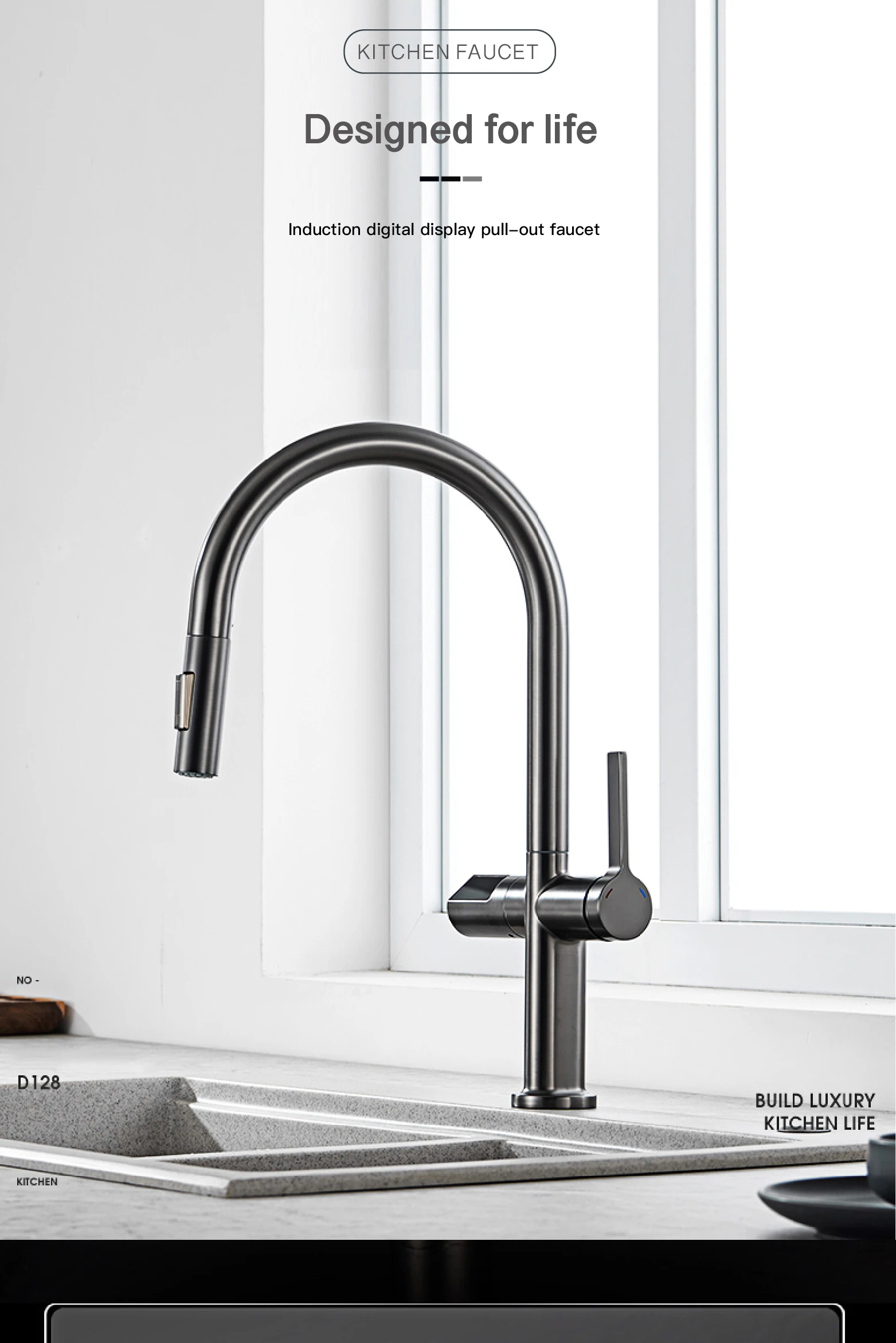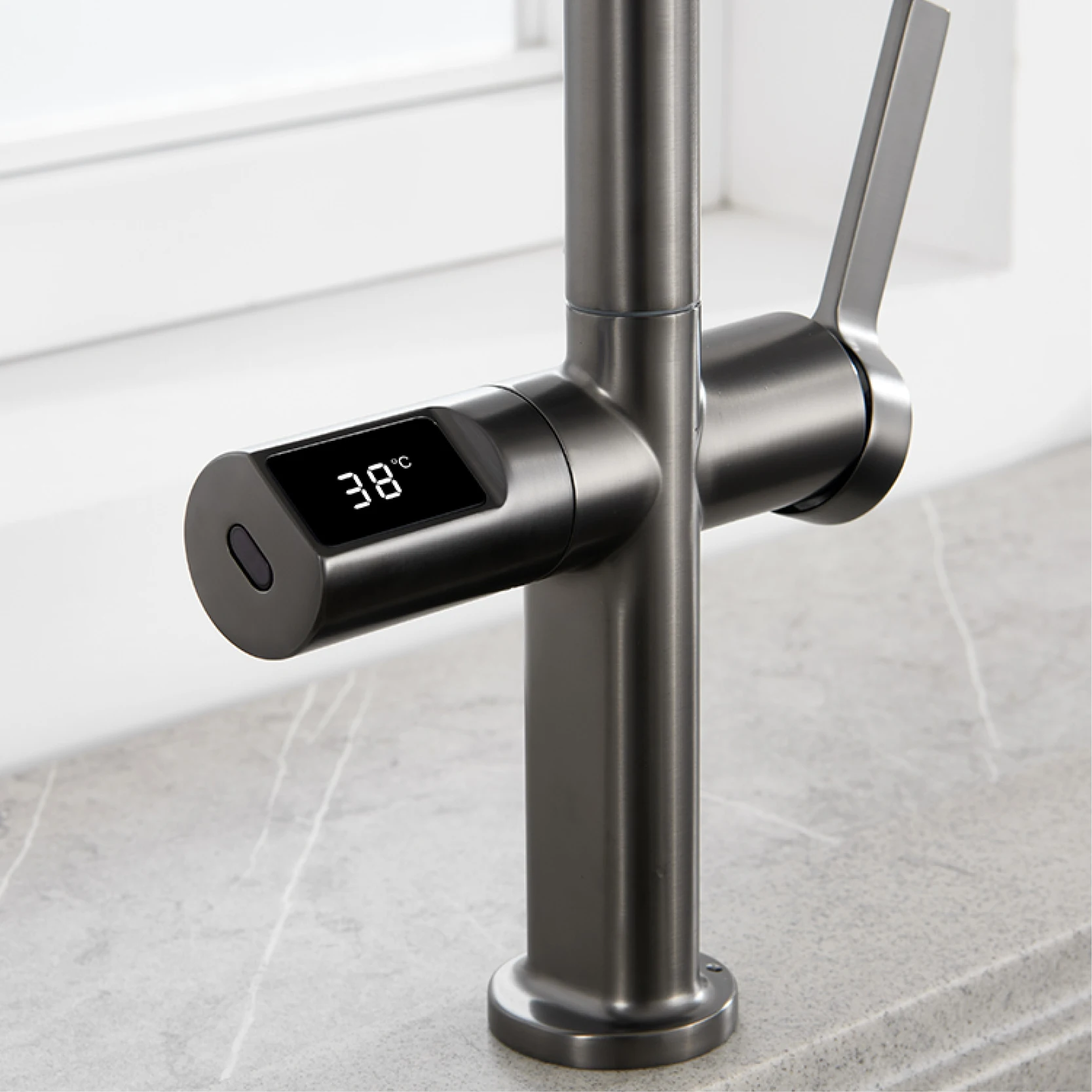 Light Luxury Gun Gray Brass Kitchen Faucet with Digital Display