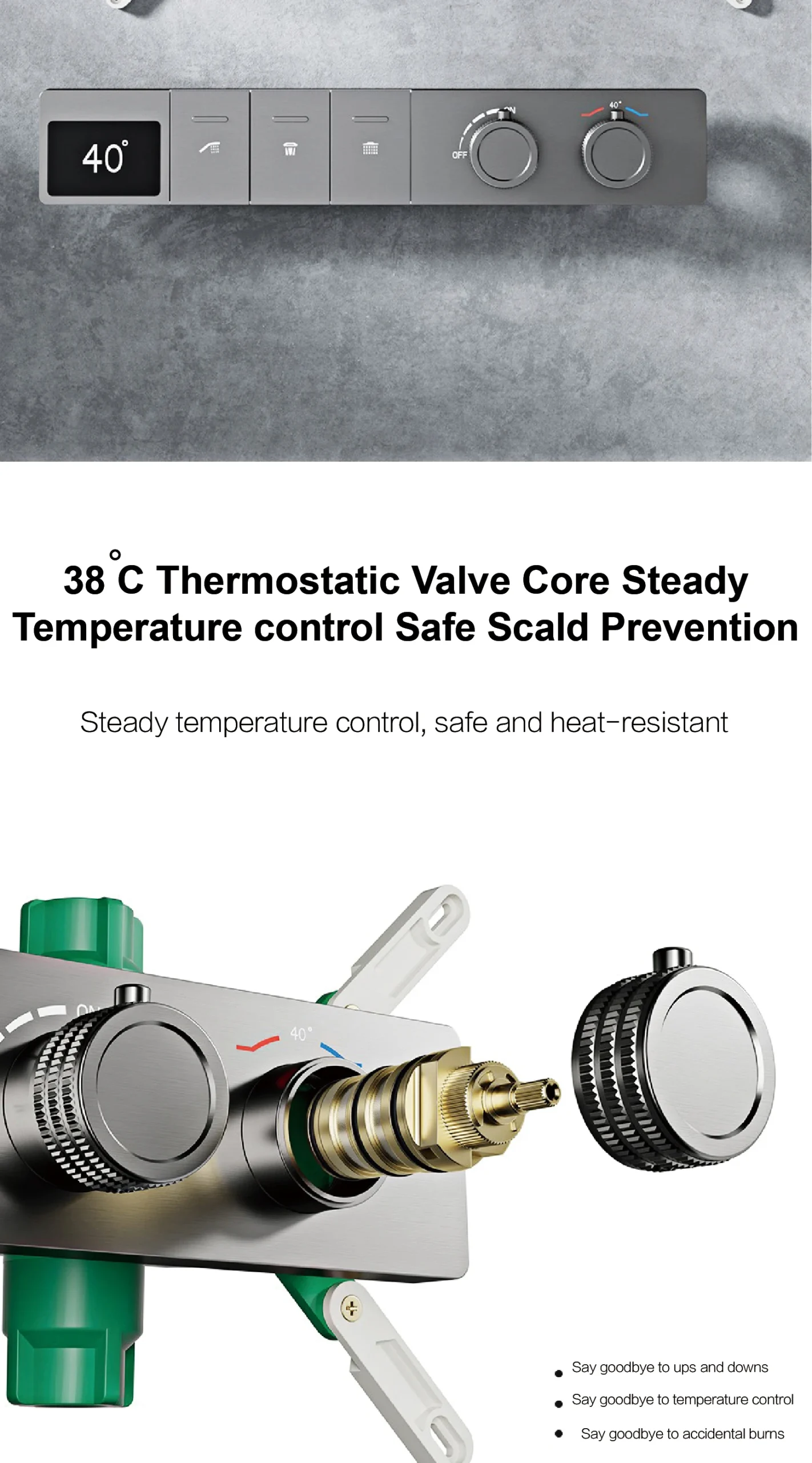 – Constant Temperature Control: Advanced thermostatic technology maintains your desired water temperature precisely, preventing scalding or cold shocks.