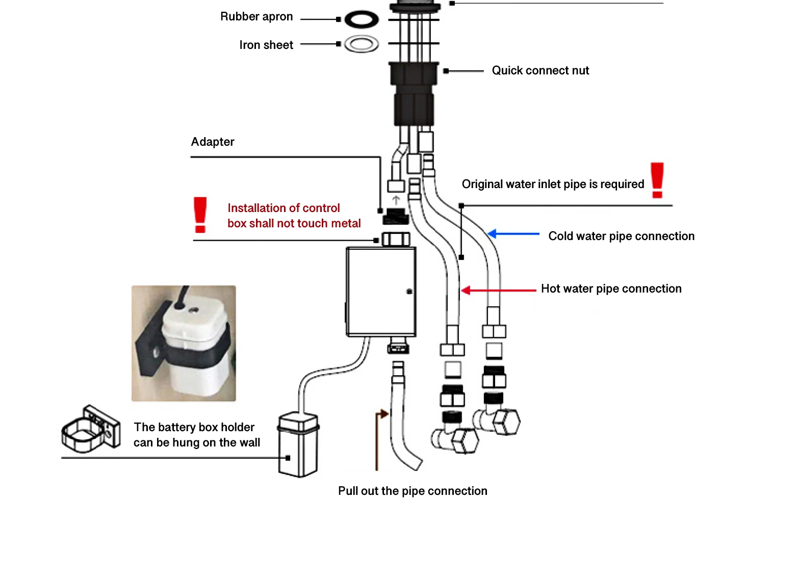 - Included: Faucet, mounting hardware, hot and cold water supply lines.