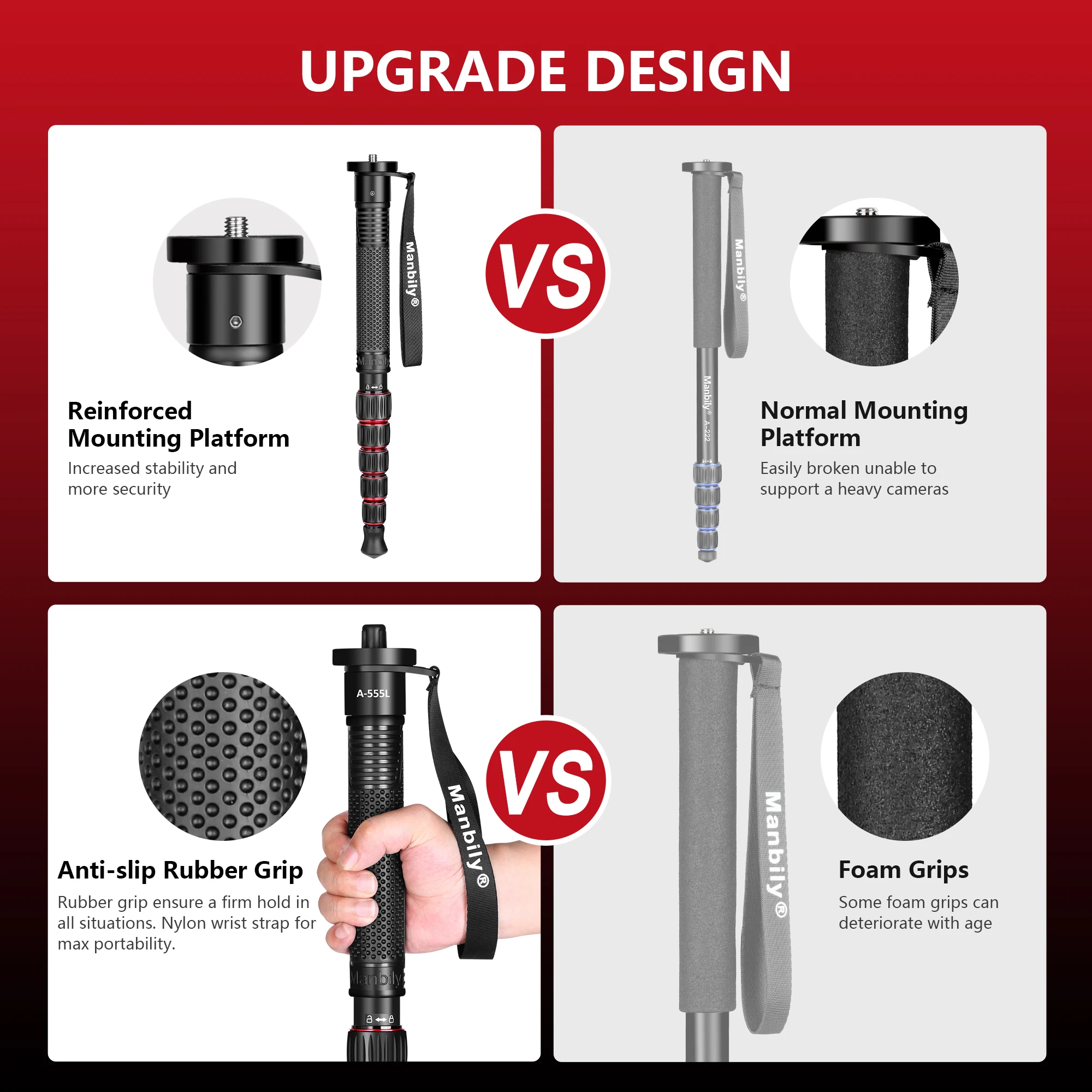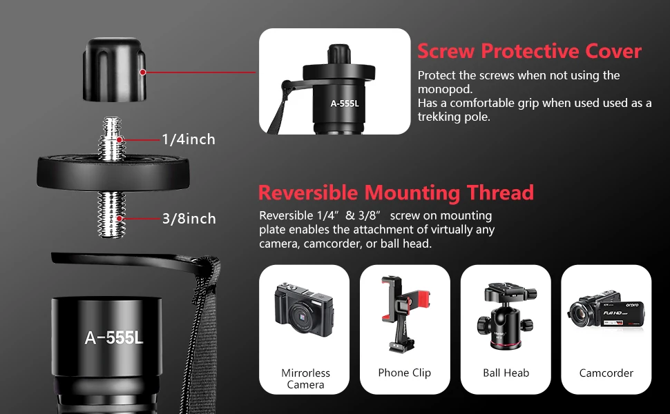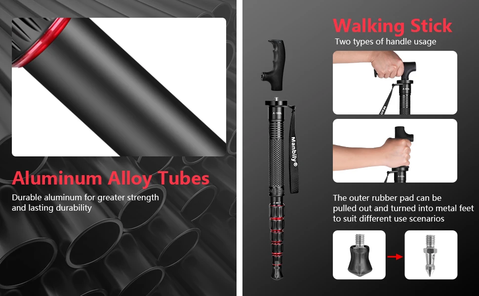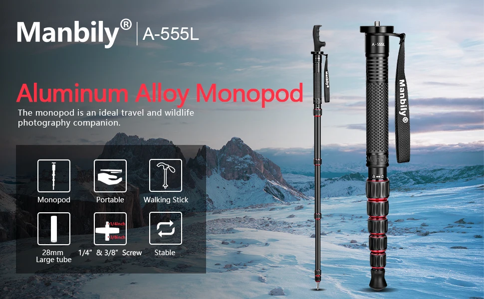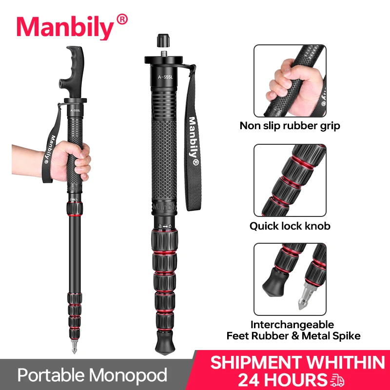 Manbily A555 L 155 cm Aluminum Monopod offers lightweight, durable support for your Canon or Nikon DSLR. Portable and easy to carry, it doubles as a walking stick, perfect for travel and outdoor photography. Choose from red, green, or gray to match your style.