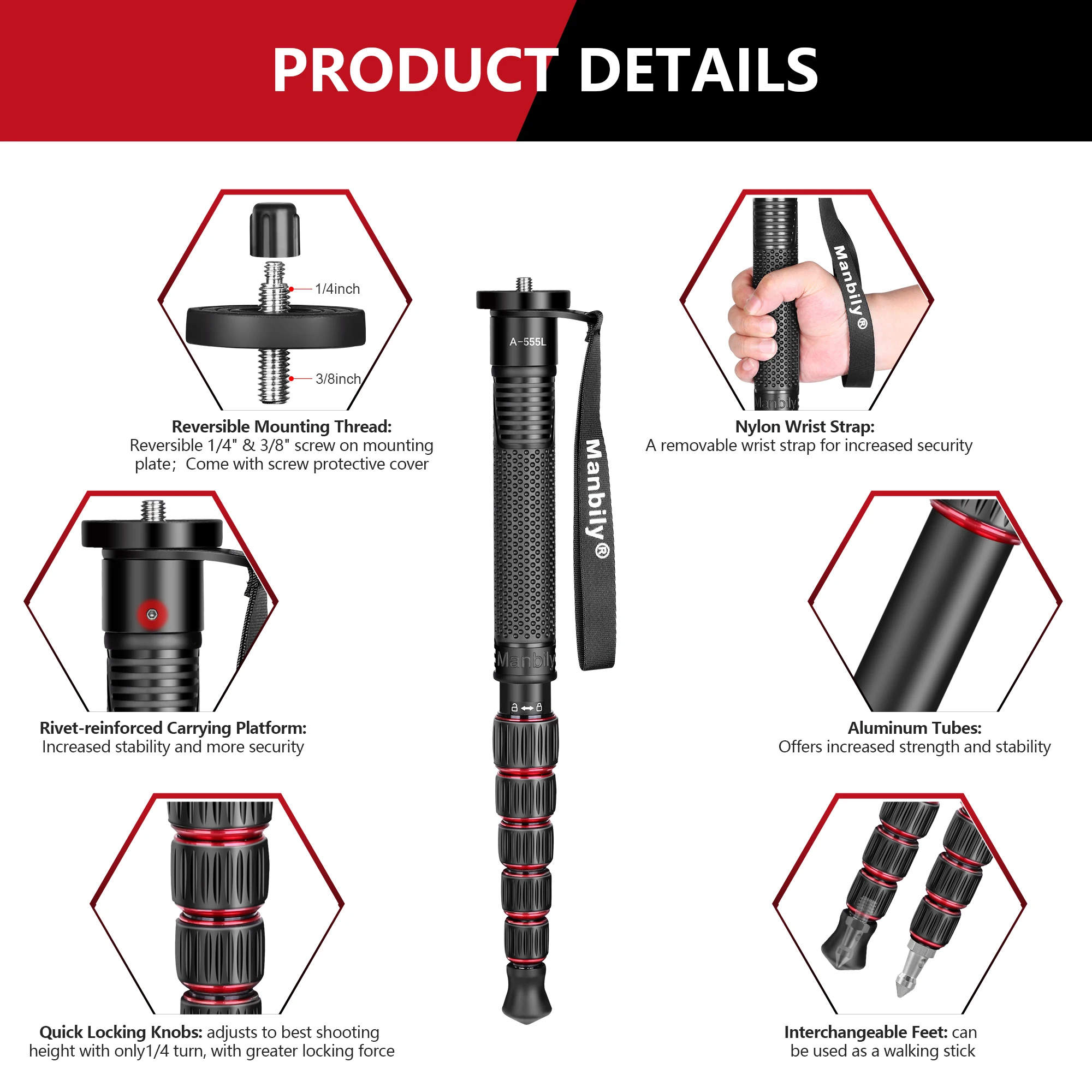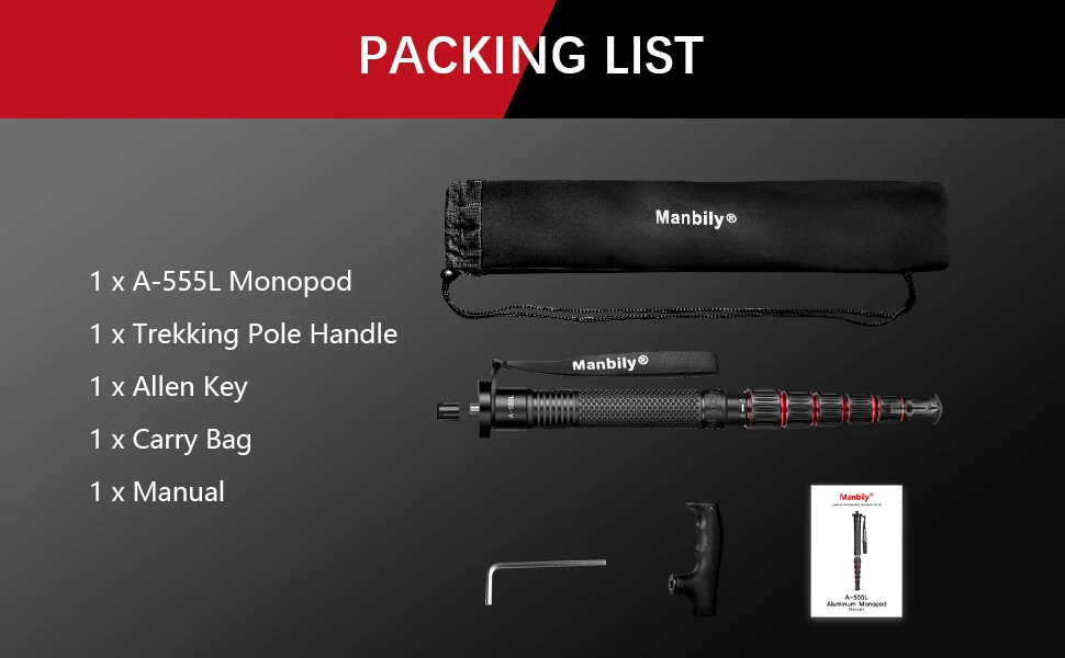 Crafted from premium aluminum, the monopod is resistant to corrosion and built to withstand rigorous use. To maintain optimal performance, clean the monopod with a dry cloth after use and avoid exposure to extreme moisture. Its ergonomic design ensures ease of use and quick adjustments. Whether you’re a professional photographer or a passionate hobbyist, the Manbily A555 L monopod is an indispensable accessory that combines functionality, portability, and style.