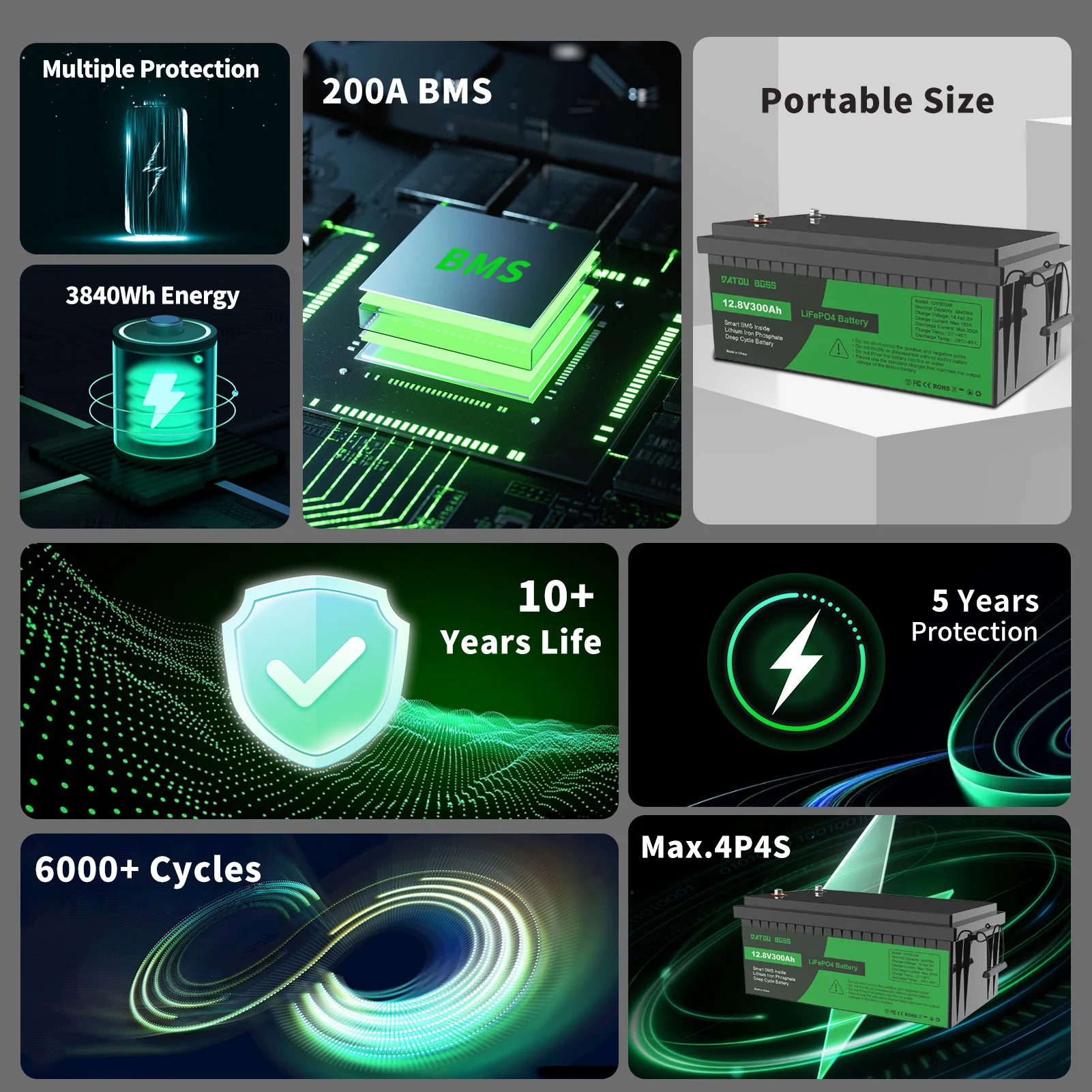 – Exceptional cycle life of up to 8000 cycles, significantly outlasting traditional batteries.