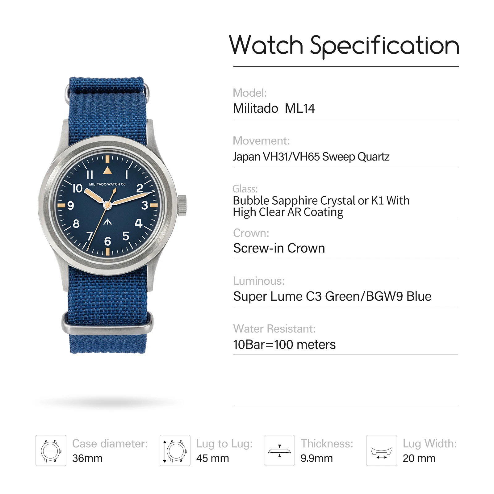 Crafted with meticulous attention to detail, the Militado ML14 features a durable case and a comfortable strap designed for long-lasting wear. The combination of the sapphire crystal and the advanced lume technology sets this watch apart, offering a luxurious experience at an accessible price point. To maintain its pristine condition, we recommend cleaning with a soft, dry cloth and avoiding prolonged exposure to extreme temperatures or harsh chemicals. This timepiece is a testament to our commitment to quality and sophisticated design.