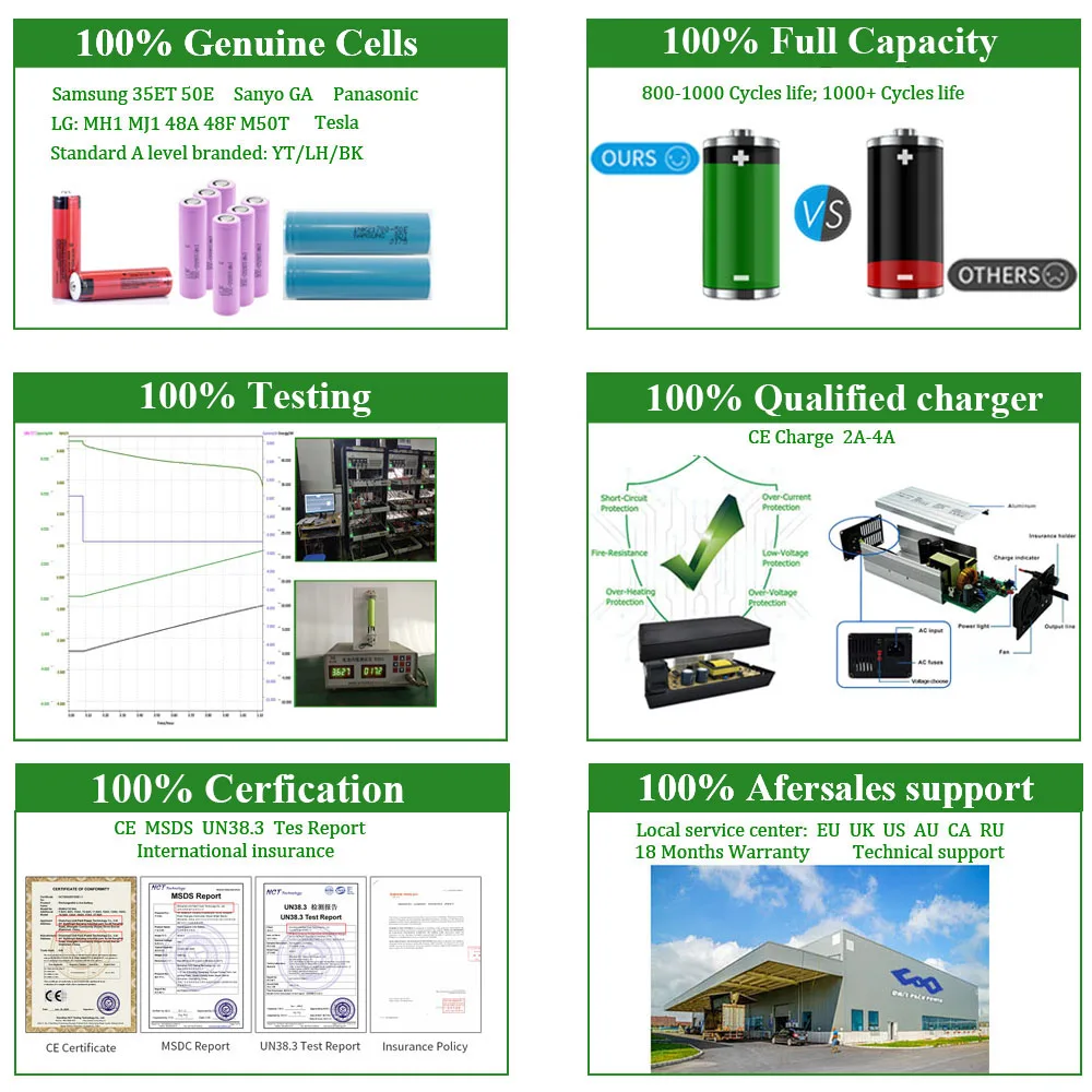 – High-quality 18650 lithium-ion cells sourced from reputable manufacturers such as Sanyo, LG, and Samsung for enhanced safety and longevity