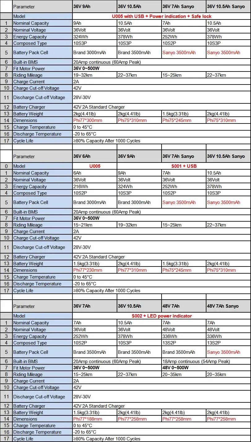 – Multiple voltage and capacity options including 36 V (7 Ah, 10.5 Ah, 14 Ah) and 48 V (7 Ah) to suit different ebike power requirements