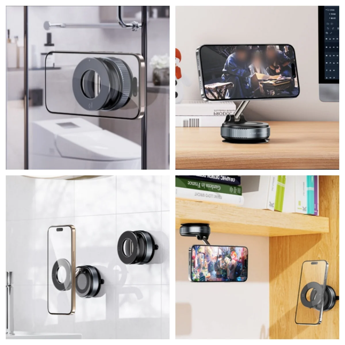 – Powerful vacuum suction base adheres securely to various smooth surfaces including car dashboards, desks, and bathroom tiles.