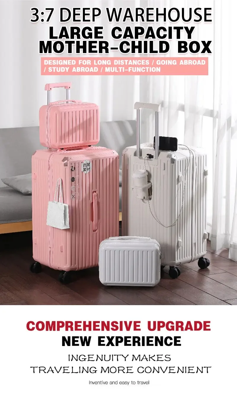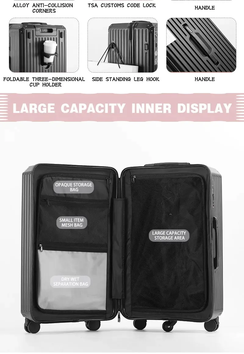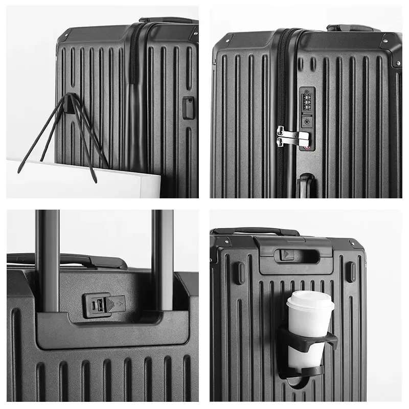 This Multifunction Spinner Luggage is more than just a suitcase; it's your indispensable travel partner. The integrated USB port means you can power up your phone or tablet without searching for an outlet, keeping you connected and productive. The clever cup holder transforms your travel experience, allowing you to enjoy your coffee or water bottle hands-free, a true game-changer during busy travel days. The robust aluminum frame and hard-shell exterior offer unparalleled protection, ensuring your delicate items arrive safely, no matter the journey's challenges. Effortlessly navigate crowded airports and hotel lobbies with the ultra-smooth spinner wheels, making every movement feel light and agile.