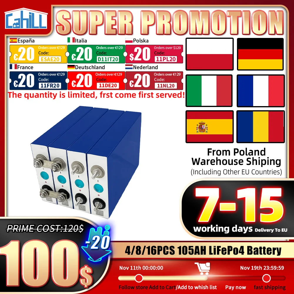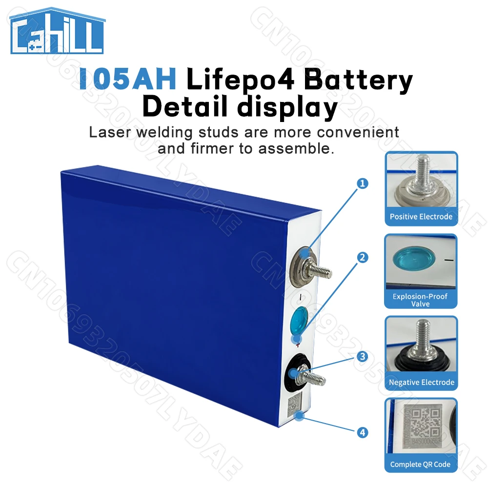 Introducing the New 105 Ah LiFePO4 battery cells, designed to provide a robust, efficient, and long-lasting power source for your DIY projects and energy needs. These high-quality 3.2 V Lithium Iron Phosphate rechargeable cells are perfect for assembling 12 V or 24 V battery packs, ideally suited for motorcycles, recreational vehicles (RVs), solar energy systems, and camping adventures. With EU stock availability and shipment from China, these batteries combine superior technology with accessibility.