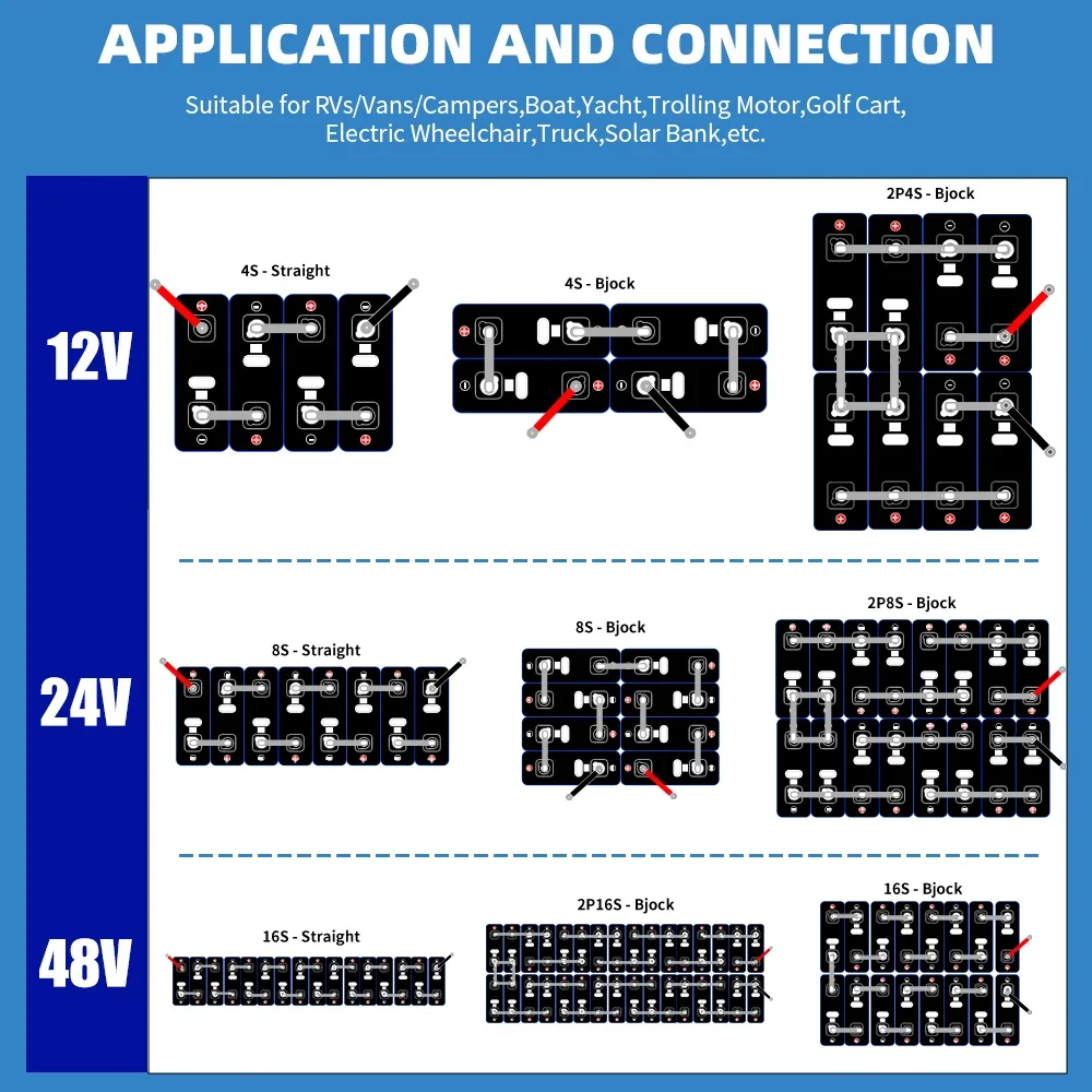 – Voltage: 3.2 V nominal per cell, ideal for assembling custom 12 V or 24 V battery systems