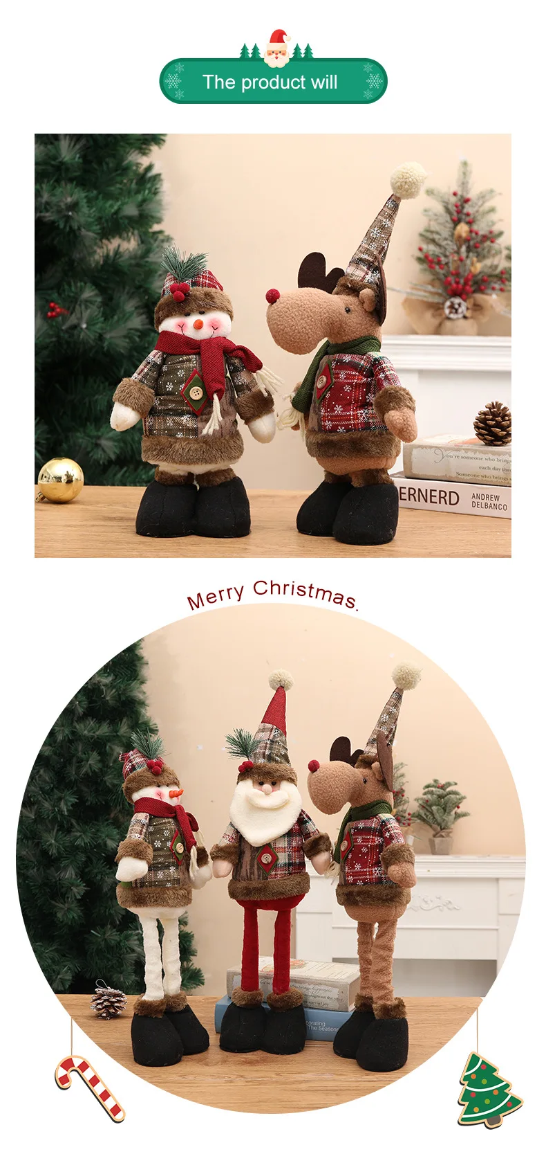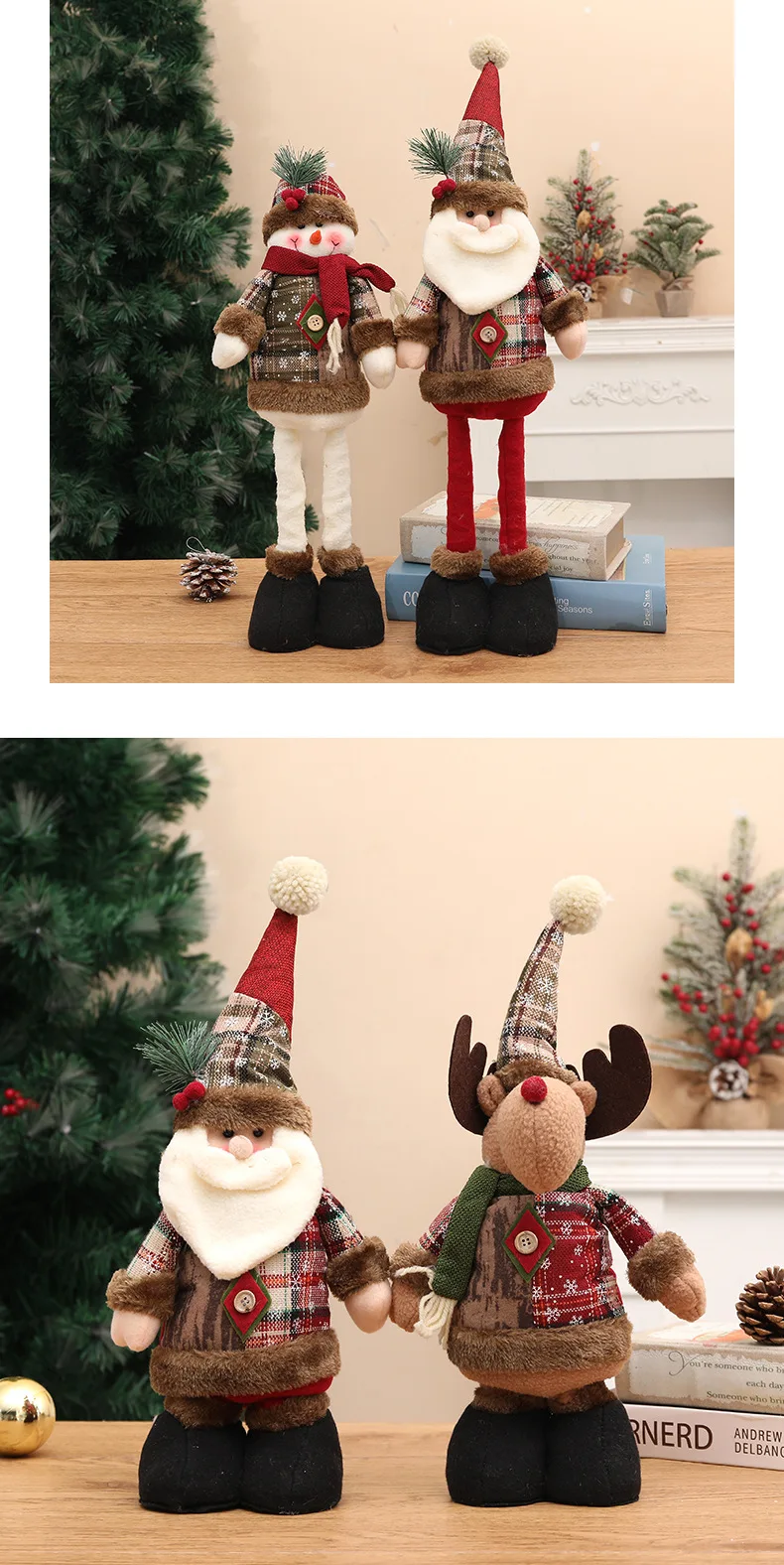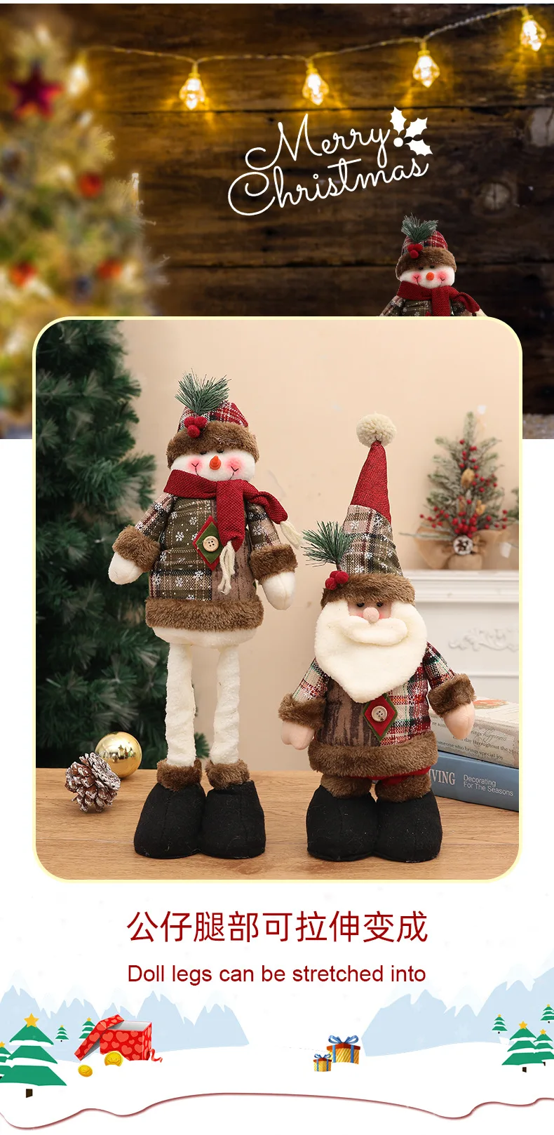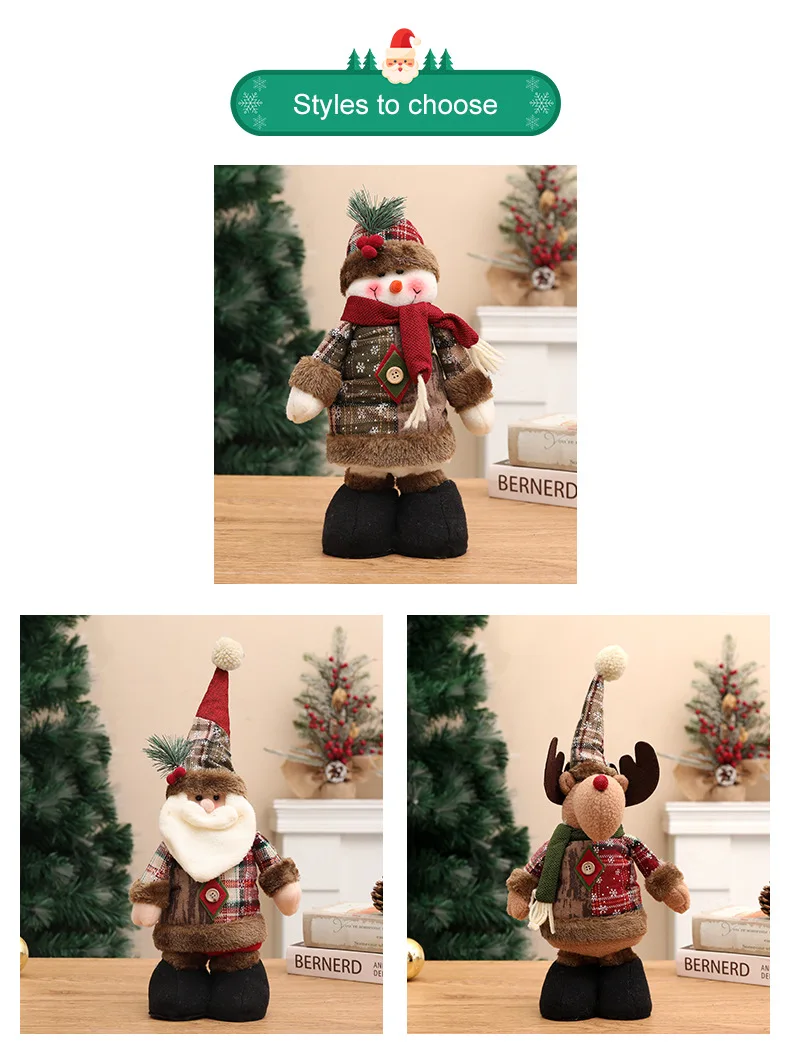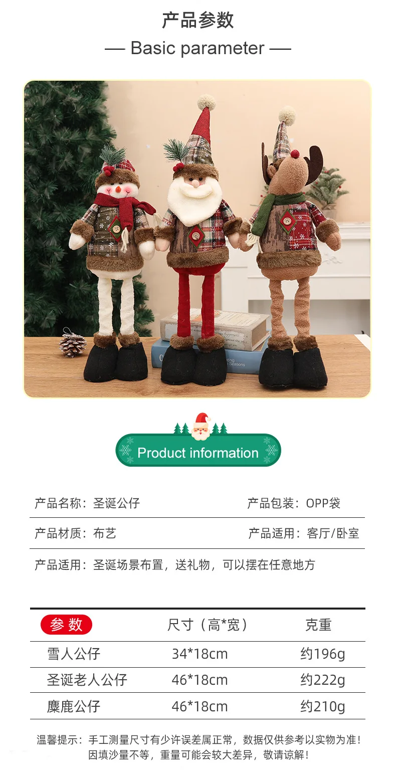 Each doll is meticulously crafted to embody the spirit of Christmas. Choose from our classic Santa Claus, the ever-popular Elk model, or the jolly Snowman. Their unique retractable leg design allows for versatile display options, easily adjusting to fit your desired space and adding a whimsical element that will delight both children and adults alike. These ornaments are more than just decorations; they are storytellers, bringing warmth and joy to every corner of your home.