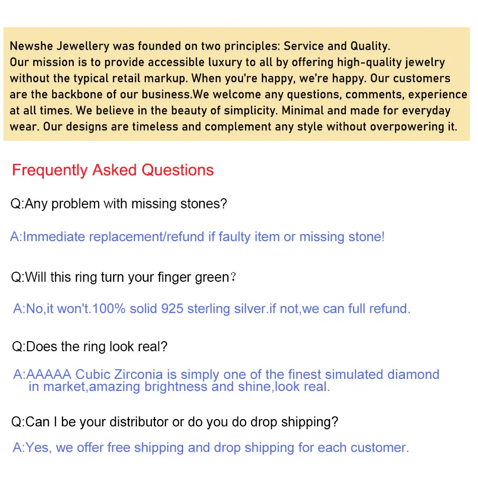 Each Newshe 925 Silver Engagement Ring is a testament to meticulous craftsmanship, fashioned from genuine 925 Sterling Silver for superior quality and longevity. The high-grade cubic zirconia is selected for its exceptional clarity and intense sparkle, offering a visual impact comparable to the finest diamonds. To preserve the exquisite beauty of your ring, we recommend avoiding exposure to harsh chemicals, perfumes, and lotions. Clean gently with a soft, dry cloth after wear and store it in a protective jewelry box away from direct sunlight and moisture. With proper care, this magnificent ring will continue to sparkle as brightly as your love for years to come.