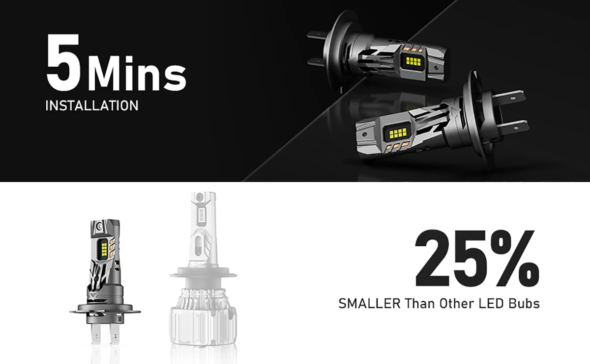 – True 1:1 size mini headlamp design for seamless fit and compatibility with H7 sockets