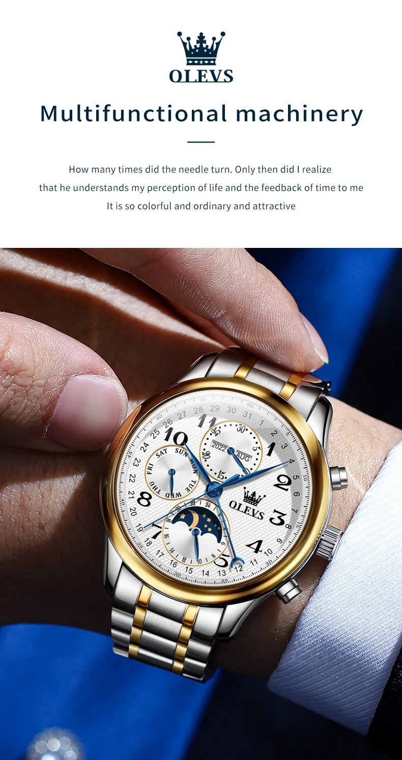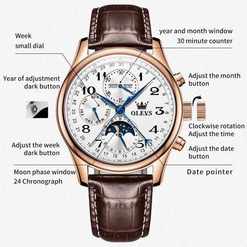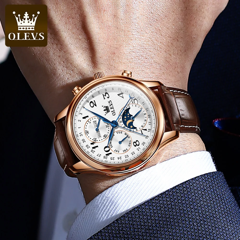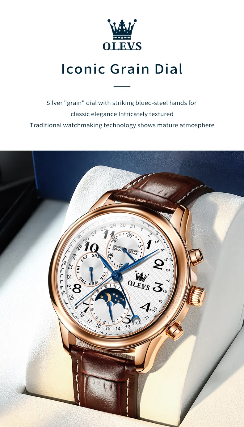 The OLEVS Automatic Watch is designed to enhance your daily life. The automatic movement eliminates the need for battery replacements, offering a sustainable and classic watchkeeping experience. The intuitive moon phase, week, and calendar complications provide practical utility without compromising the watch’s clean and sophisticated aesthetic. Whether you’re attending a business meeting, a formal event, or simply enjoying a casual outing, this watch adds an undeniable touch of class. The comfortable leather strap ensures all-day wearability, while the waterproof feature makes it a reliable companion for everyday adventures. Its luminous elements ensure you can always tell the time with a glance, day or night.