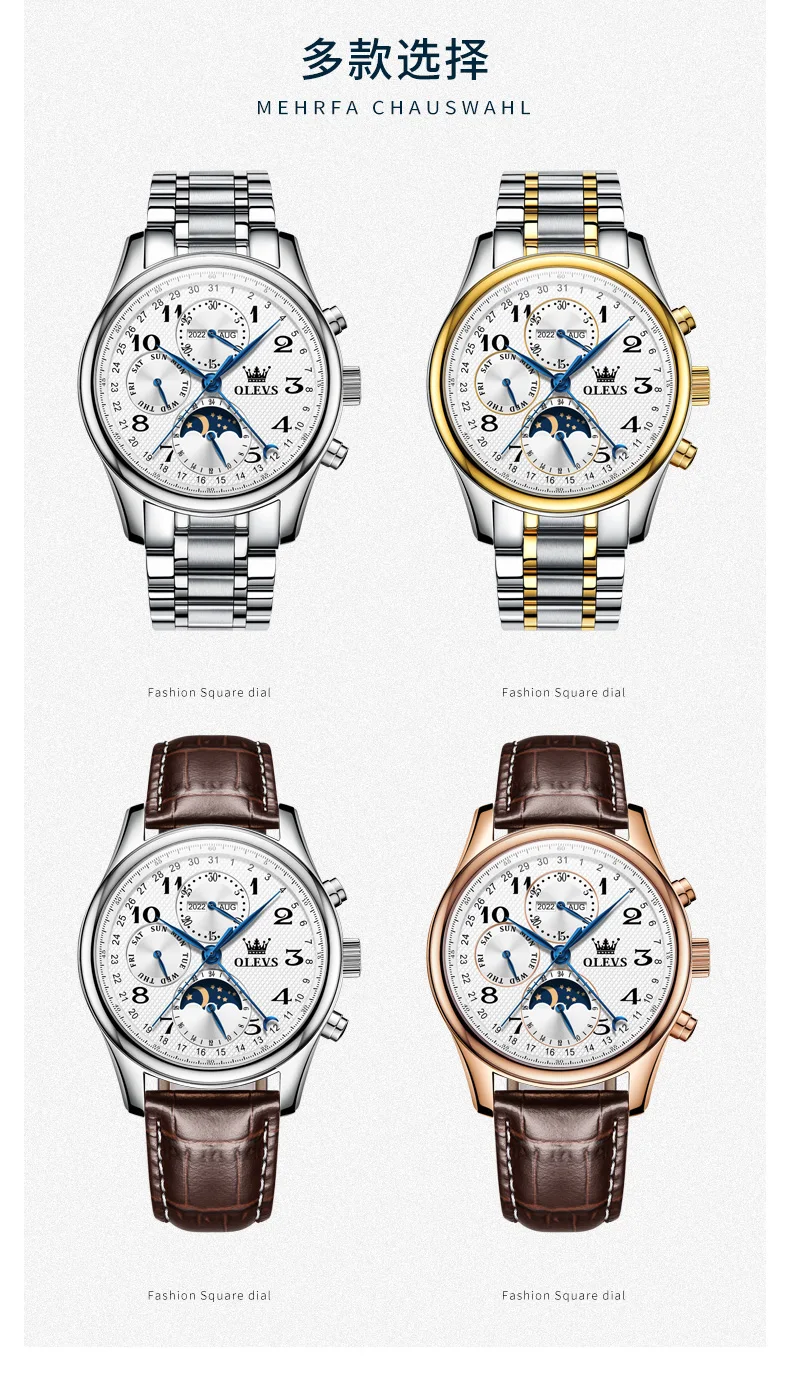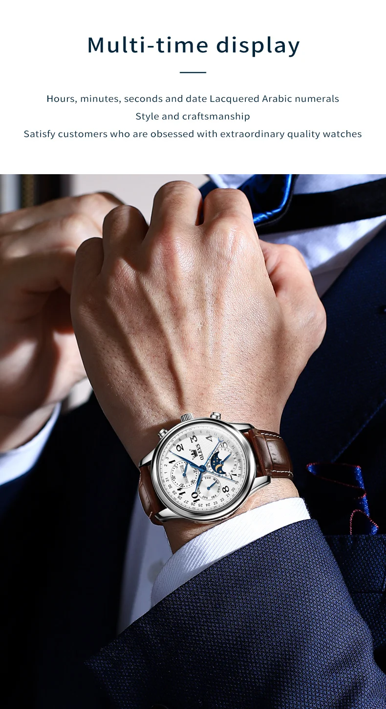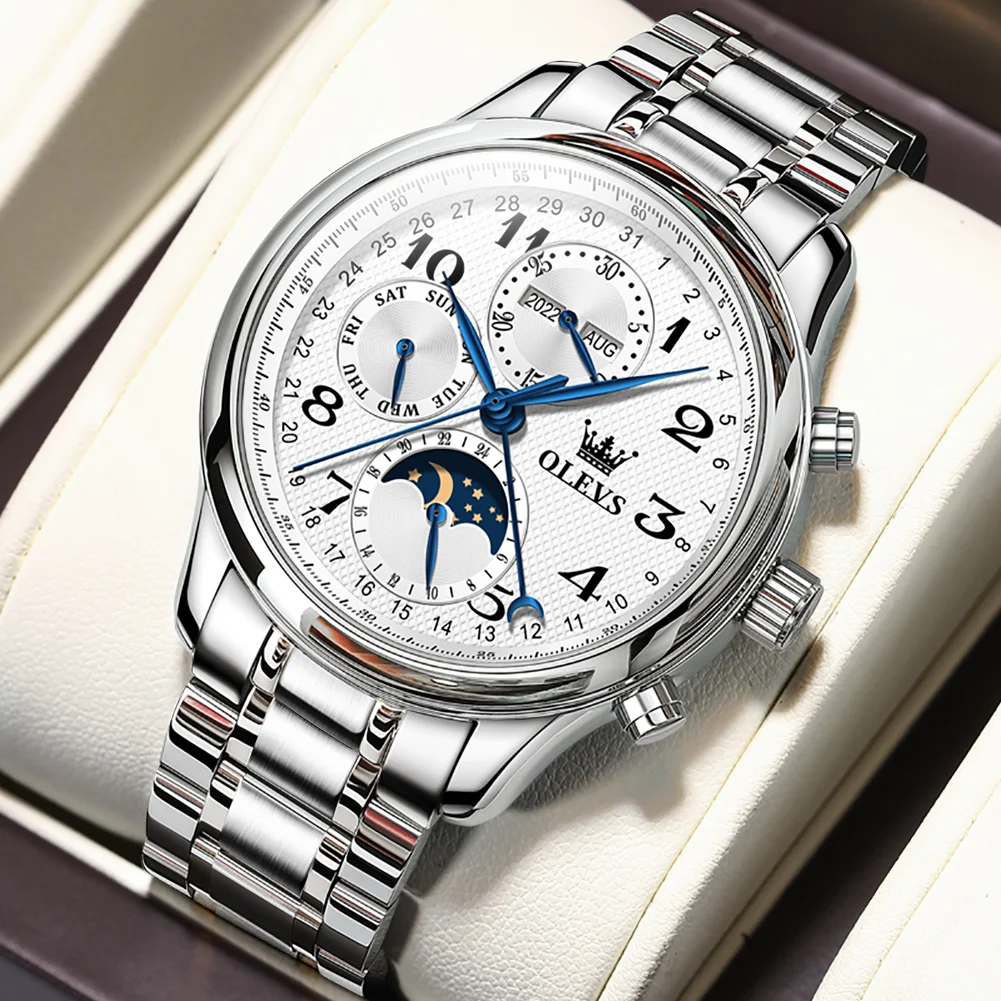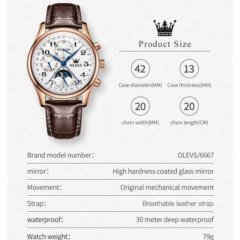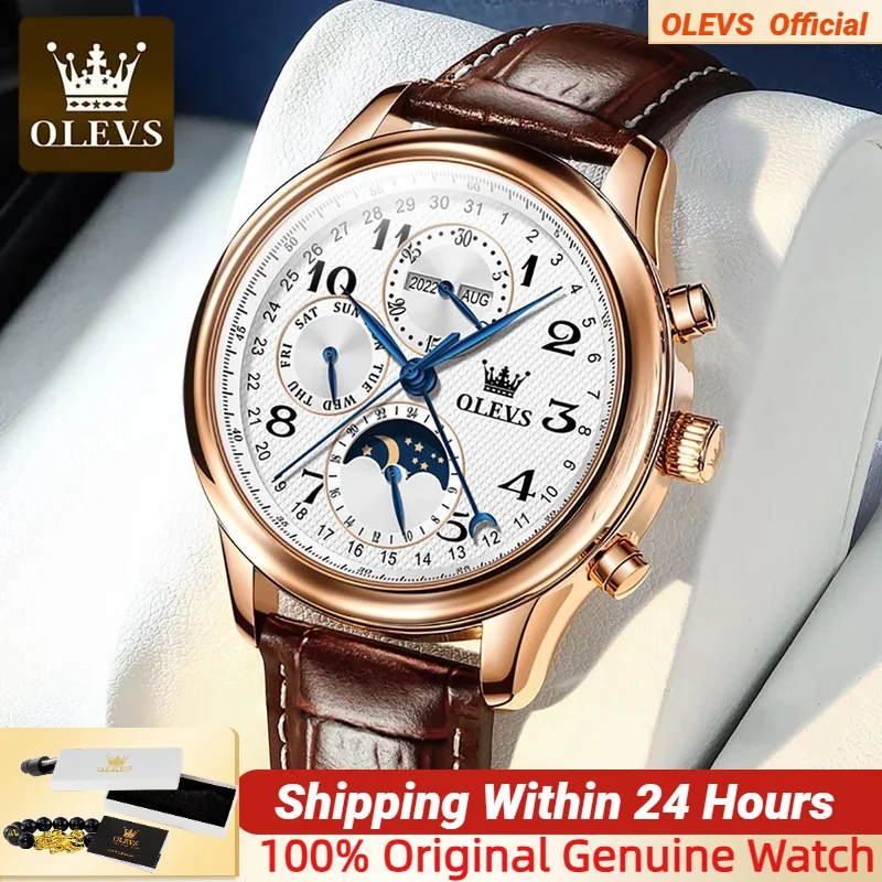 The OLEVS Automatic Watch is designed to enhance your daily life. The automatic movement eliminates the need for battery replacements, offering a sustainable and classic watchkeeping experience. The intuitive moon phase, week, and calendar complications provide practical utility without compromising the watch’s clean and sophisticated aesthetic. Whether you’re attending a business meeting, a formal event, or simply enjoying a casual outing, this watch adds an undeniable touch of class. The comfortable leather strap ensures all-day wearability, while the waterproof feature makes it a reliable companion for everyday adventures. Its luminous elements ensure you can always tell the time with a glance, day or night.