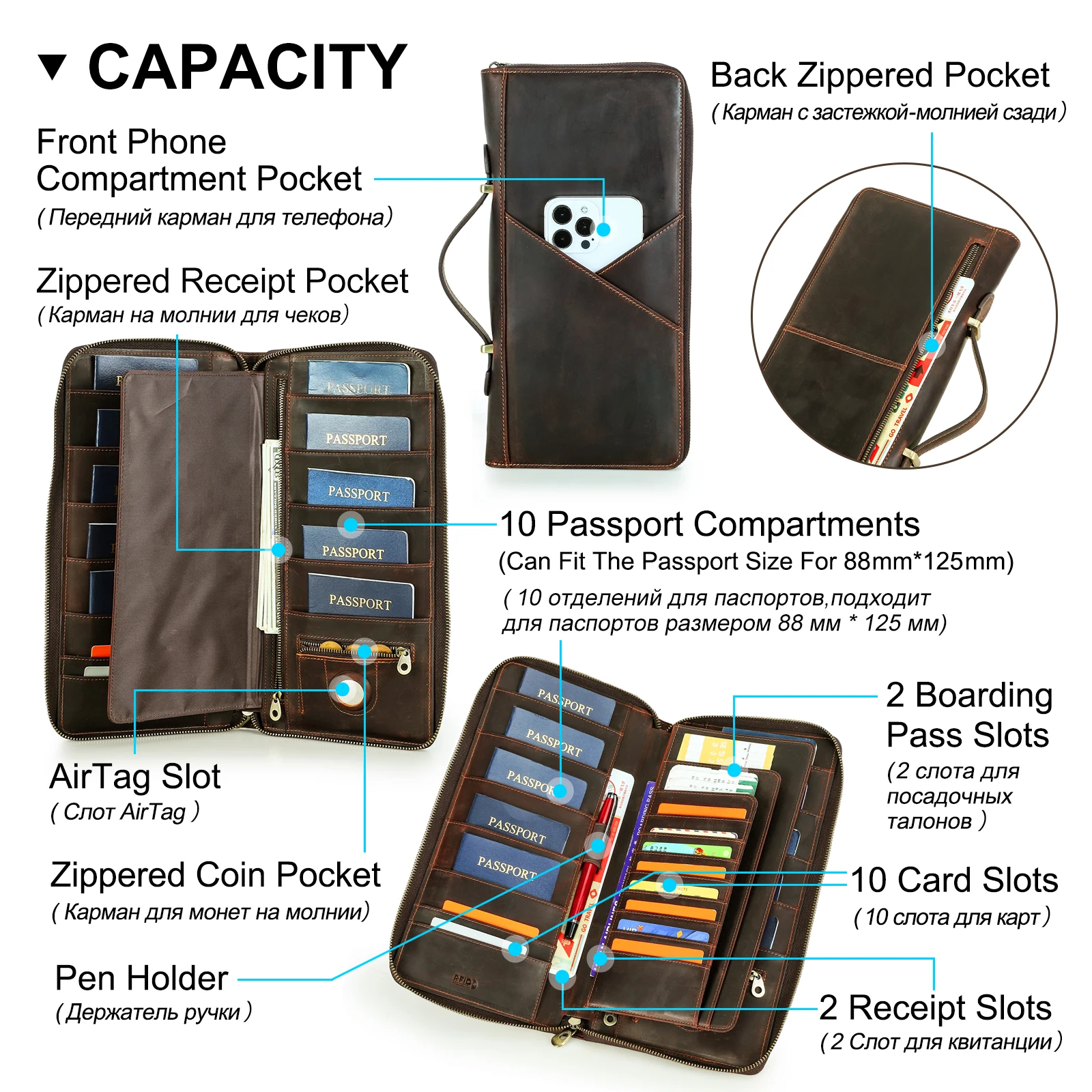 – Multi-compartment design holds passports, boarding passes, credit cards, cash, and other documents neatly