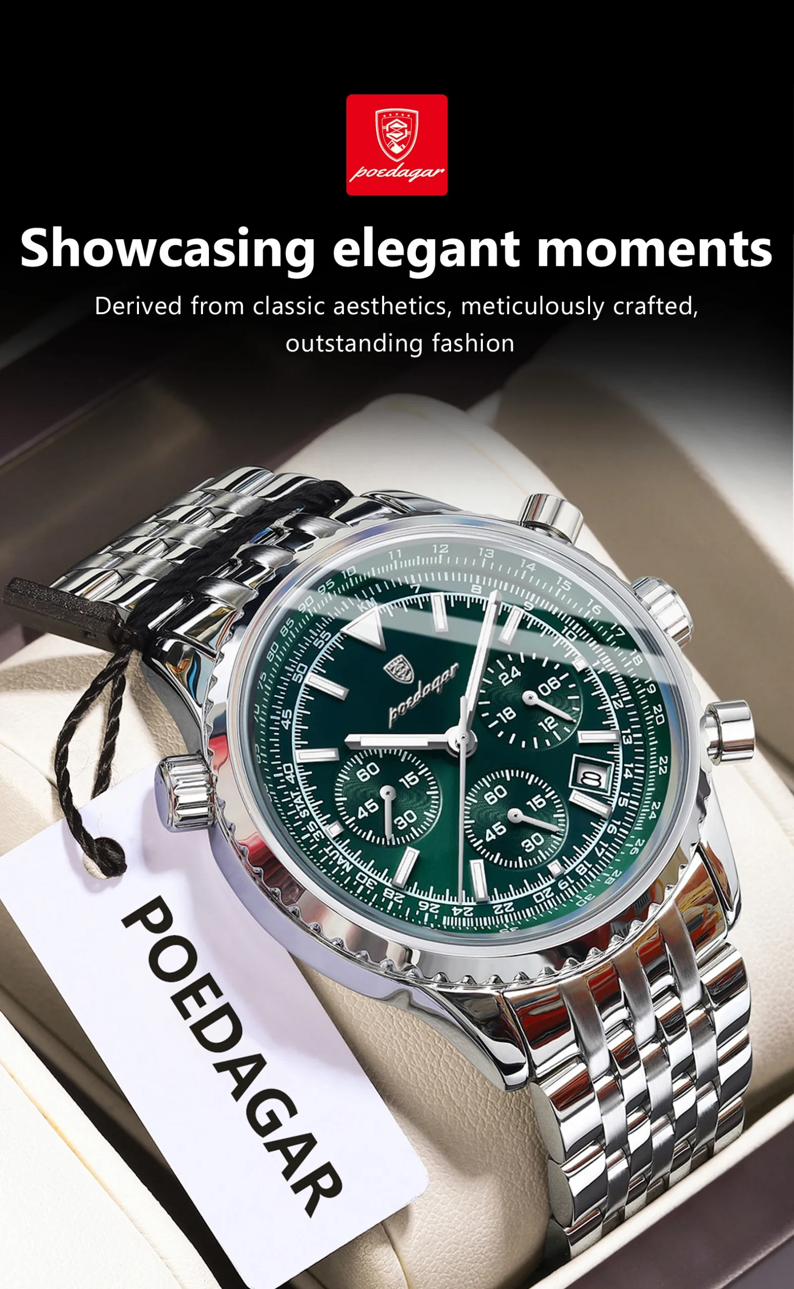 Available in an exclusive range of sophisticated color combinations including 960 Gold Blue, 960 Rose Gold Gold, 960 Silver Blue, 960 Gold Green, 960 Silver Green, and 960 Silver Gun Color, you can select the perfect POEDAGAR watch to match your personal style and wardrobe. Each variant is meticulously finished to reflect a commitment to excellence. To maintain its pristine condition, simply wipe the watch with a soft, dry cloth. Avoid exposure to harsh chemicals. Invest in a timepiece that truly reflects your ambition and refined taste.