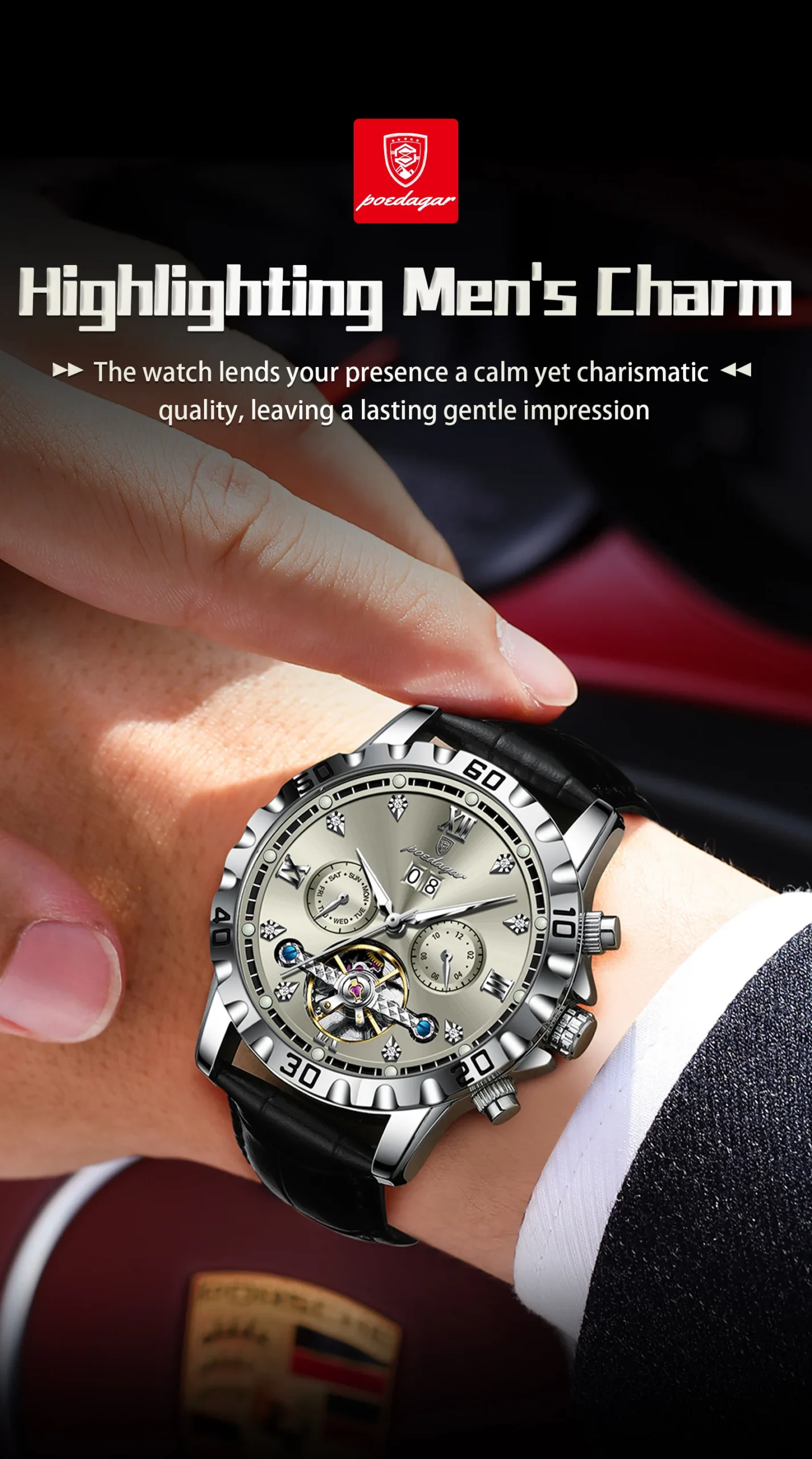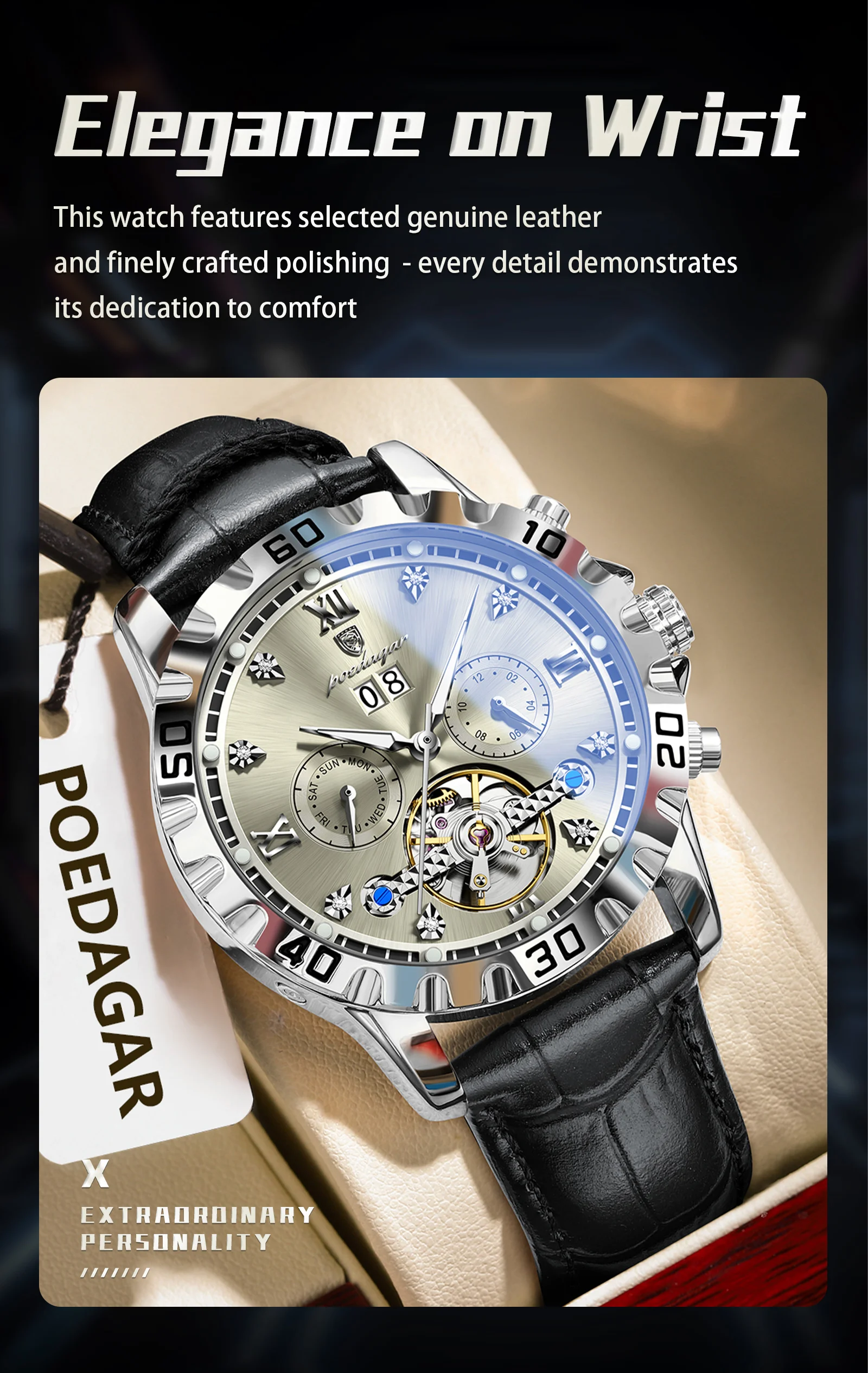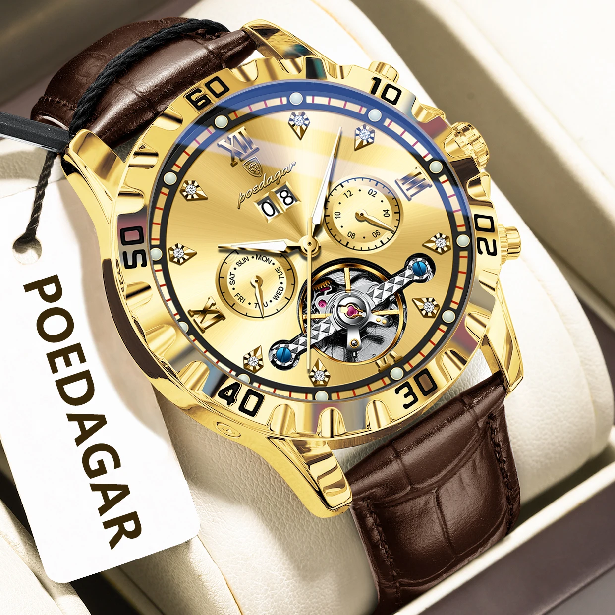 The POEDAGAR Hollow Tourbillon watch is more than just an accessory; it’s a statement of refined taste and an appreciation for meticulous craftsmanship. Its automatic movement ensures you are always powered by your own momentum, offering a seamless and hassle-free ownership experience. The luminous features provide practicality, while the date and week complications enhance its everyday utility. The luxurious leather strap ensures a comfortable and secure fit, making it ideal for both formal occasions and daily wear. This watch is perfect for the modern man who values tradition, innovation, and a touch of opulence.