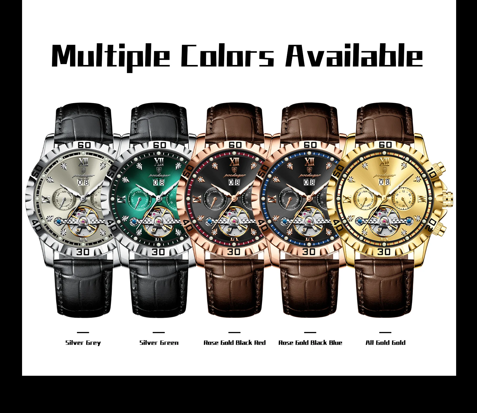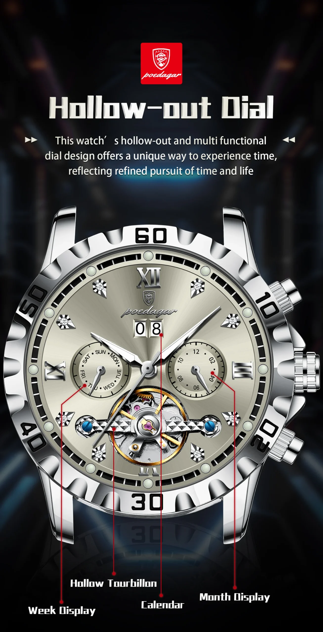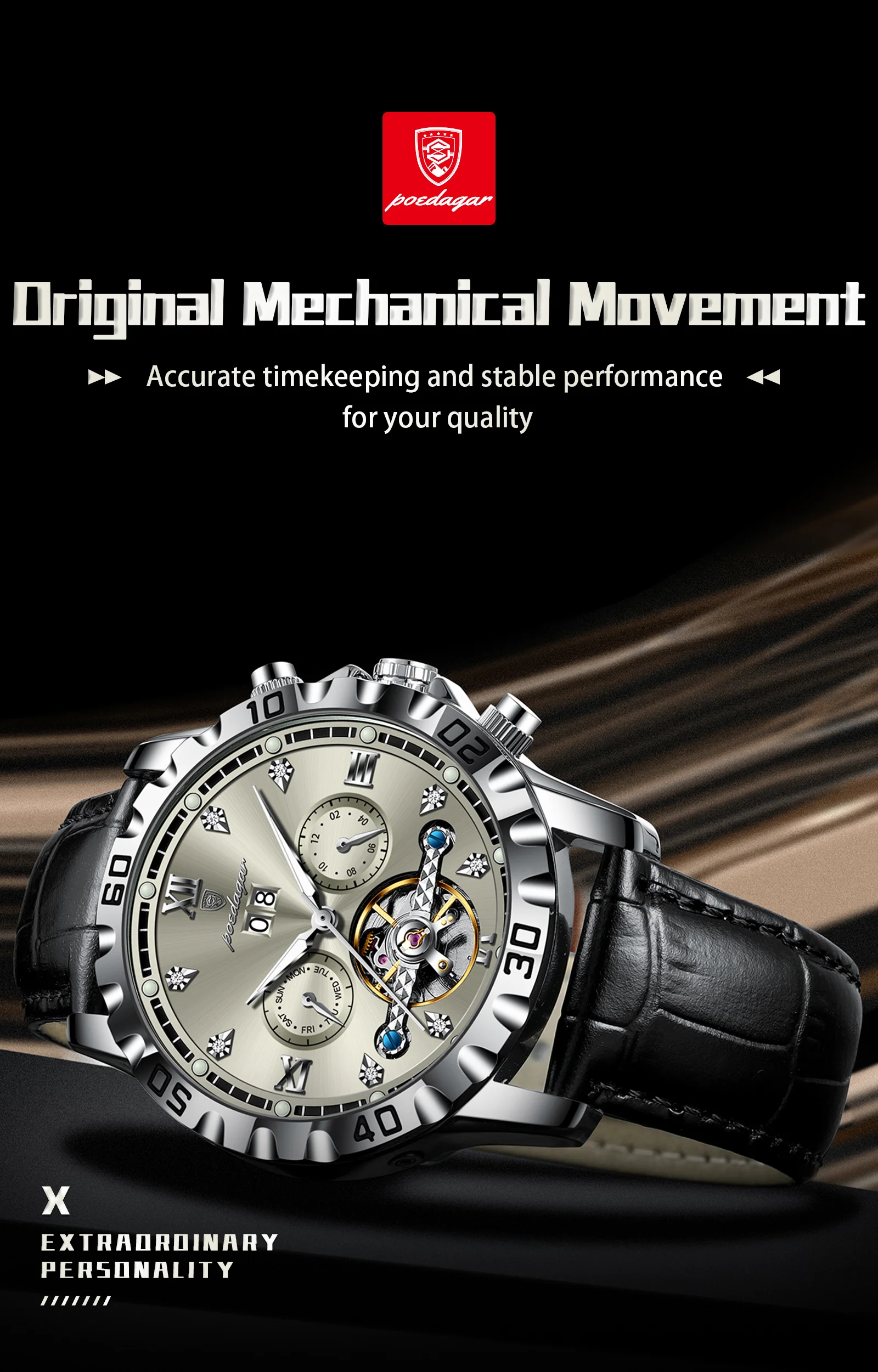 The POEDAGAR Hollow Tourbillon watch is more than just an accessory; it’s a statement of refined taste and an appreciation for meticulous craftsmanship. Its automatic movement ensures you are always powered by your own momentum, offering a seamless and hassle-free ownership experience. The luminous features provide practicality, while the date and week complications enhance its everyday utility. The luxurious leather strap ensures a comfortable and secure fit, making it ideal for both formal occasions and daily wear. This watch is perfect for the modern man who values tradition, innovation, and a touch of opulence.
