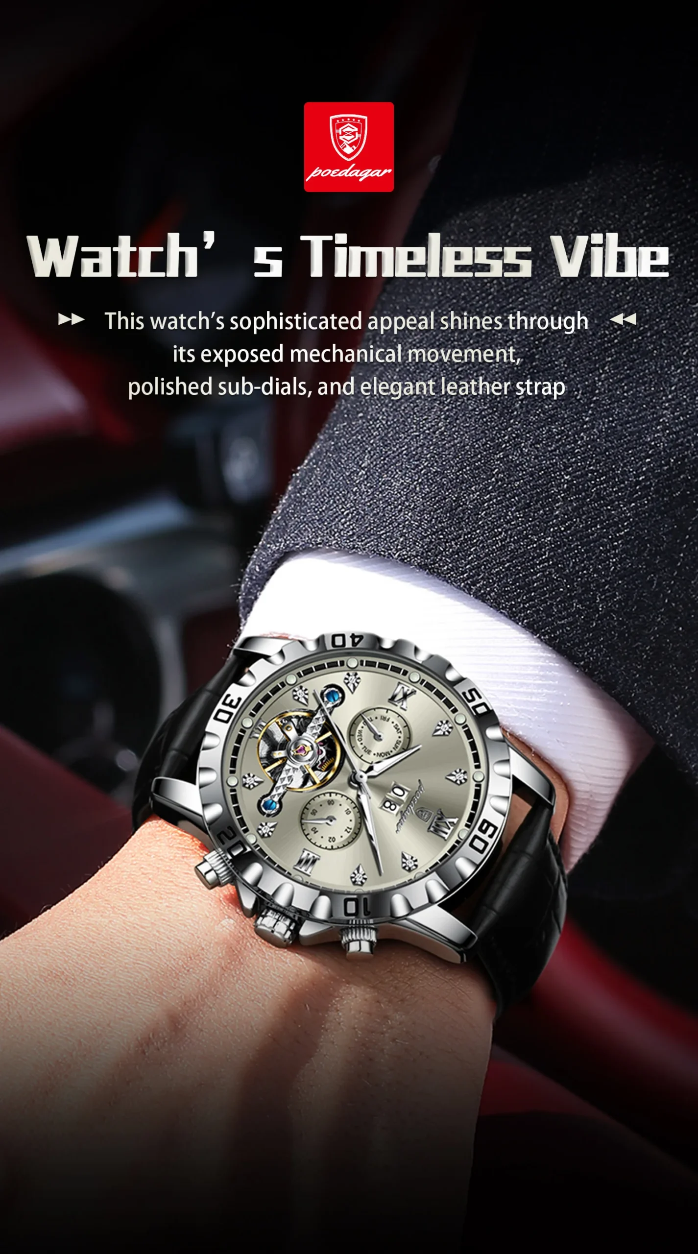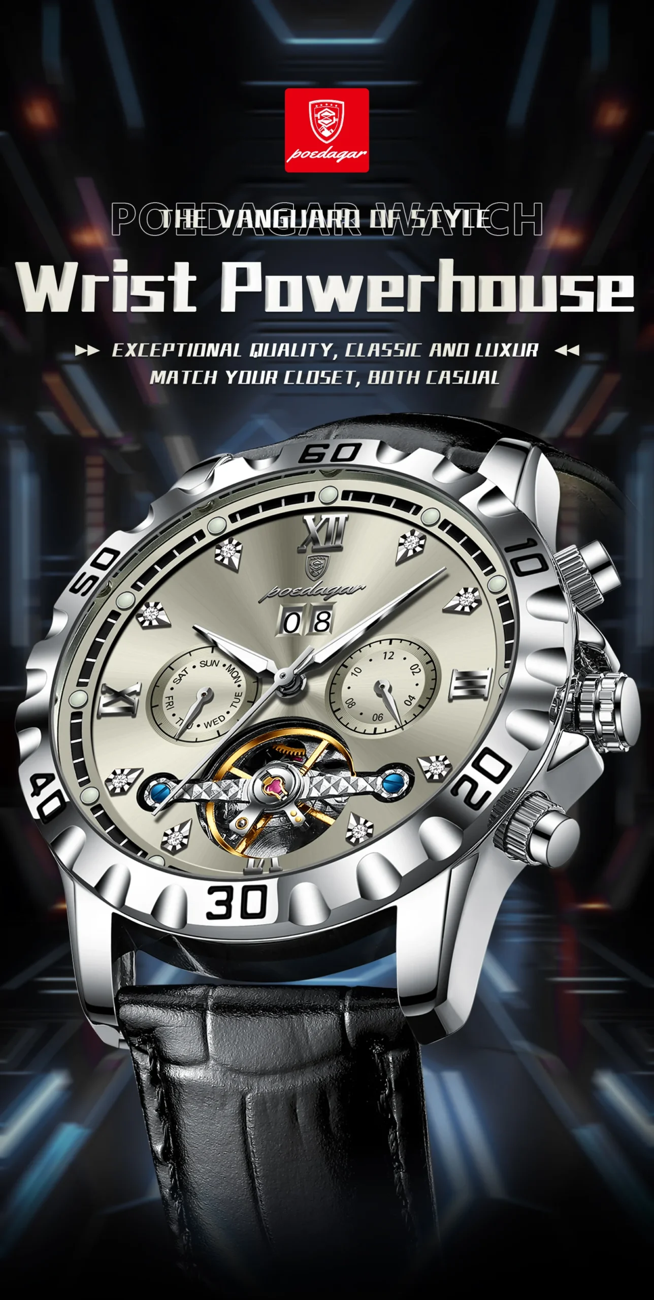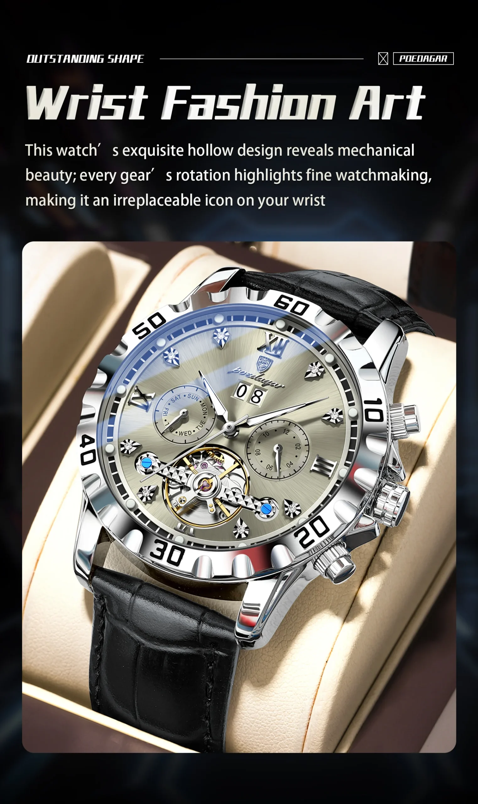 Introducing the POEDAGAR Fashion Men’s Wristwatch, a masterpiece of horological engineering and sophisticated design. This automatic mechanical timepiece is crafted for the discerning gentleman who appreciates both intricate functionality and striking aesthetics. Elevate your style with a watch that transcends mere timekeeping, offering a glimpse into the art of watchmaking itself.