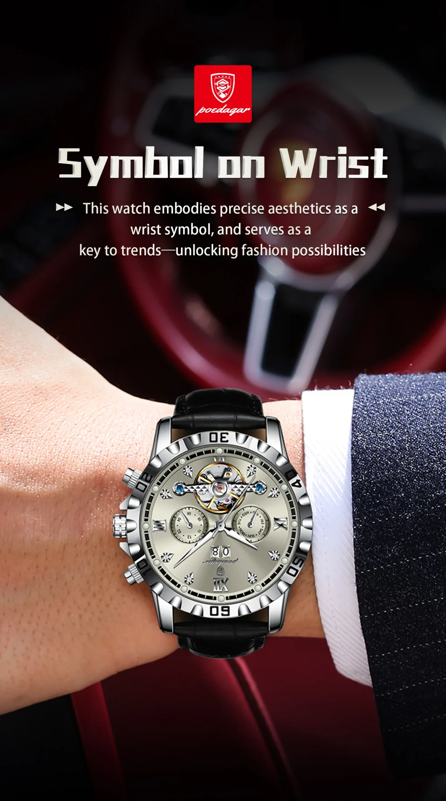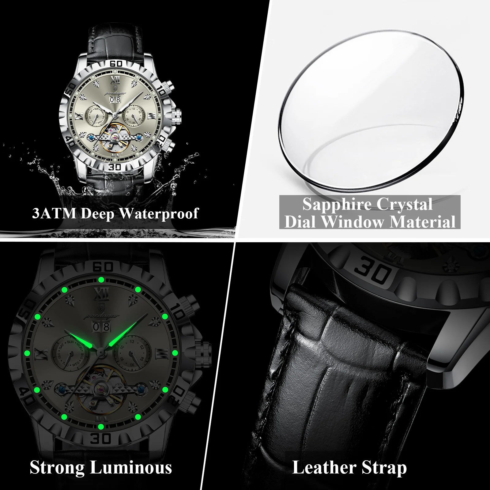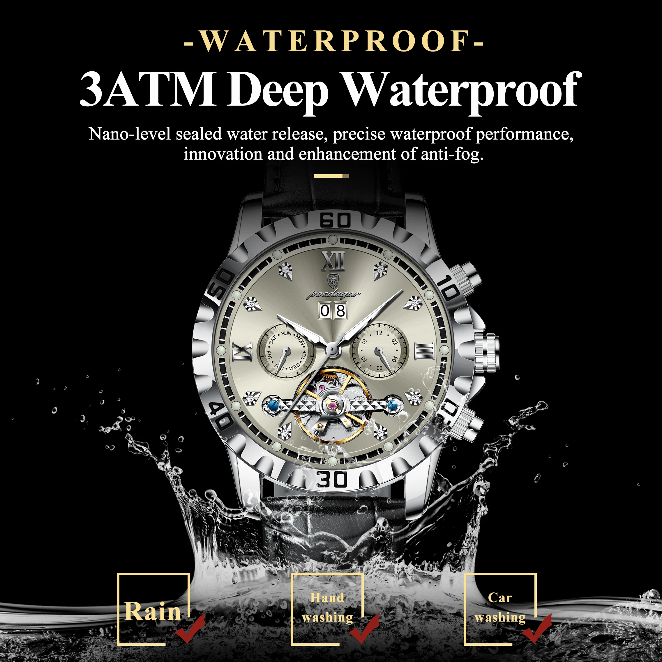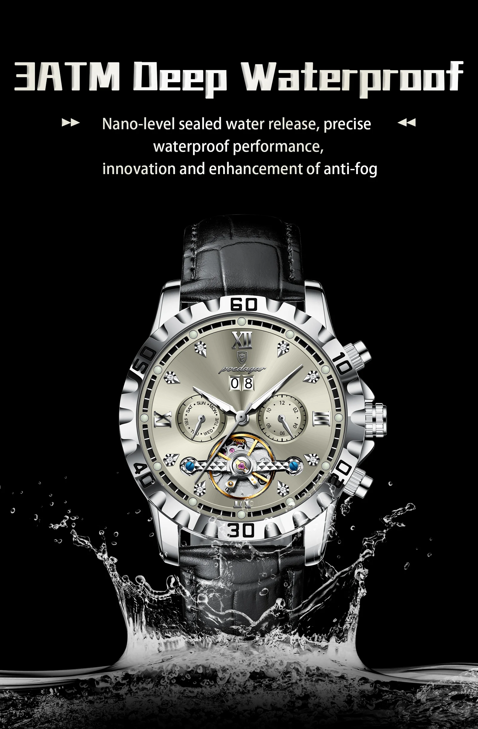 Introducing the POEDAGAR Fashion Men’s Wristwatch, a masterpiece of horological engineering and sophisticated design. This automatic mechanical timepiece is crafted for the discerning gentleman who appreciates both intricate functionality and striking aesthetics. Elevate your style with a watch that transcends mere timekeeping, offering a glimpse into the art of watchmaking itself.