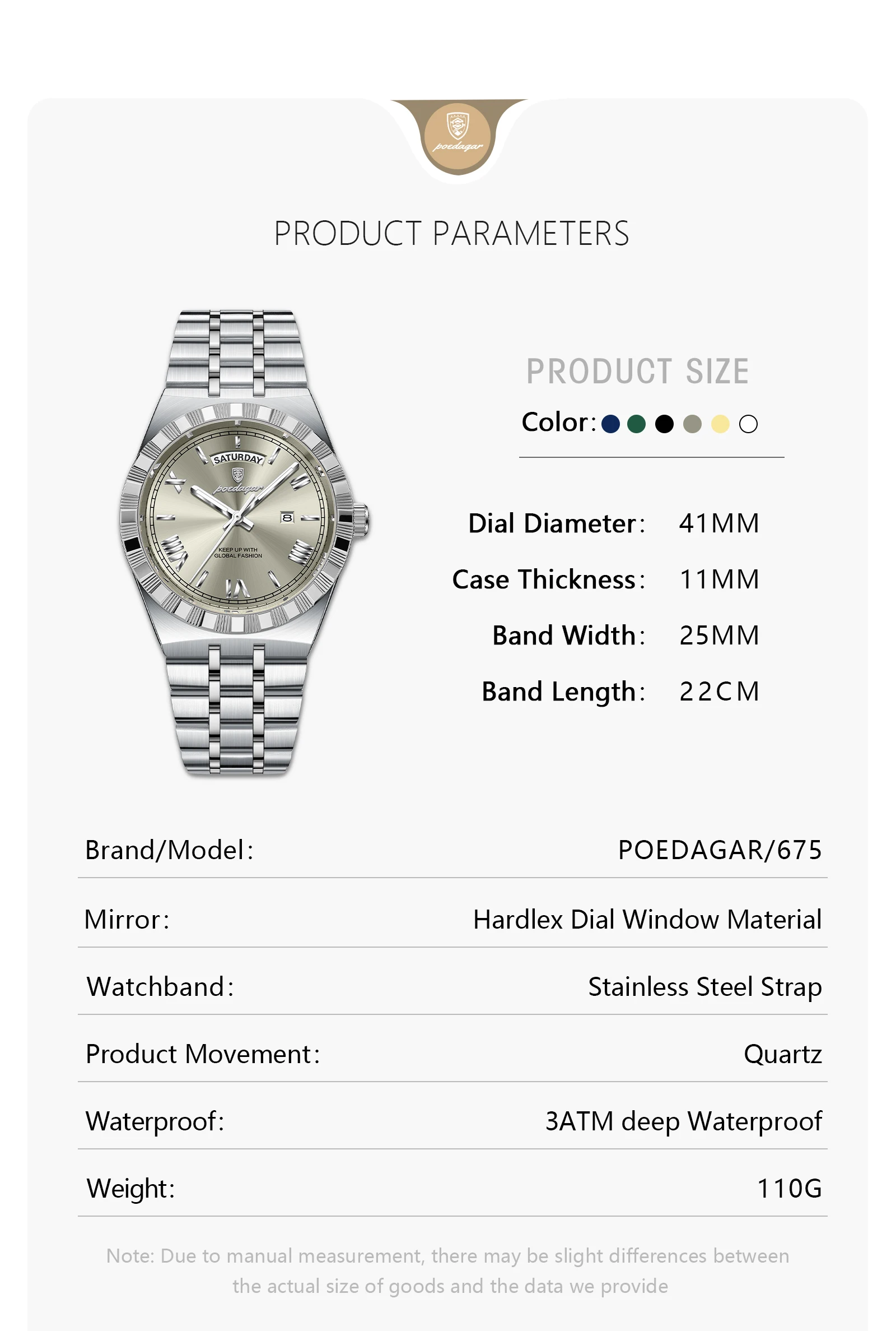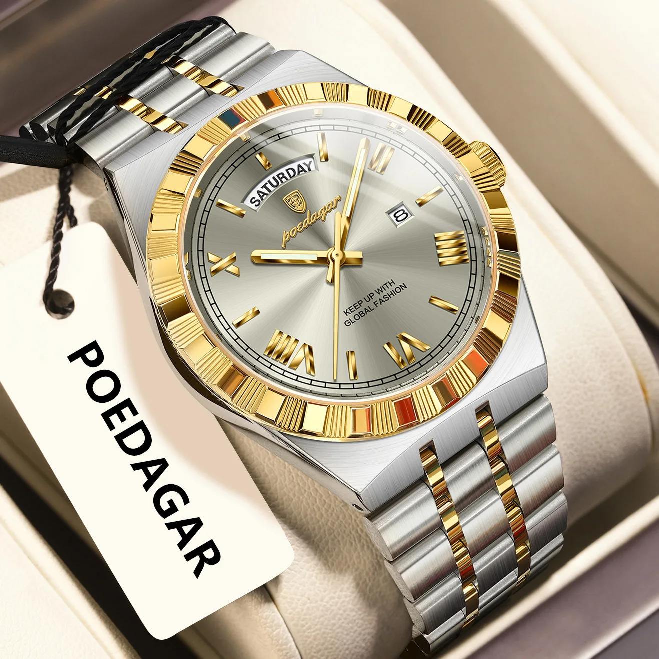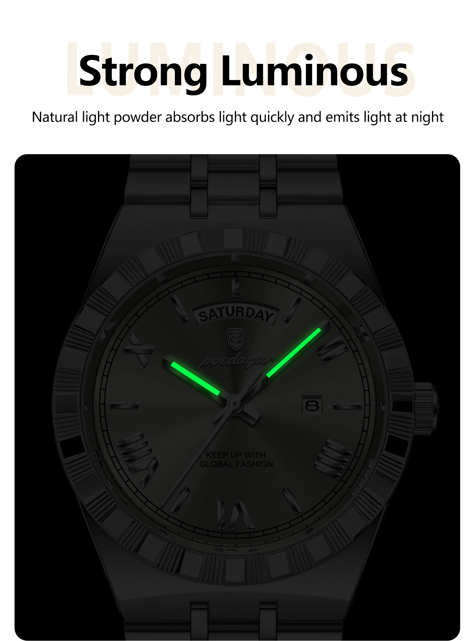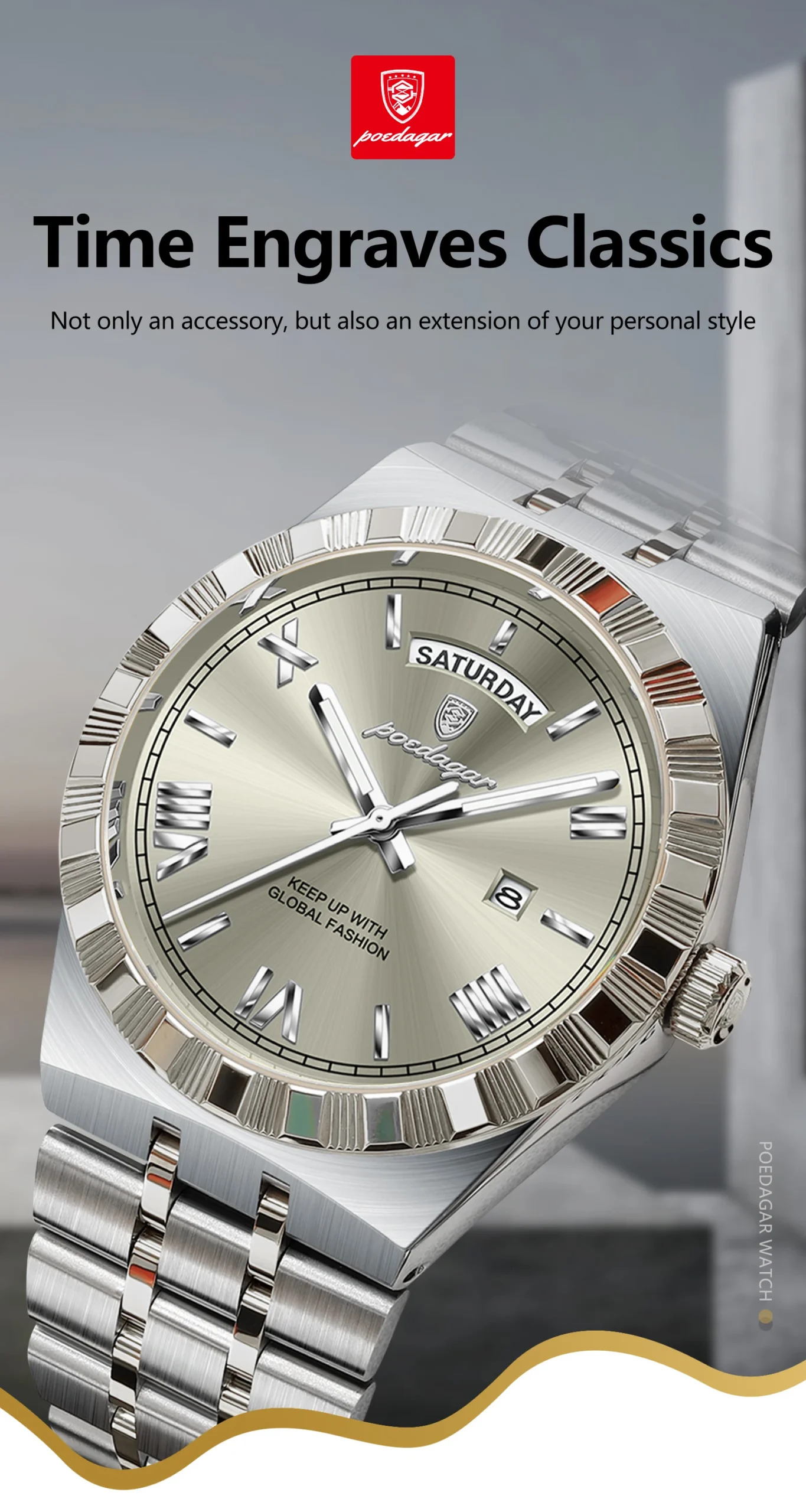 Imagine the confidence you'll exude in every meeting, the subtle nod to sophistication at every social gathering. This POEDAGAR watch seamlessly blends into your professional attire while elevating your casual wear, making it an indispensable accessory for every facet of your life. Its robust construction means it's built to last, while its elegant design ensures you always make a lasting impression. From important business negotiations to weekend leisure, this watch is designed to be your steadfast companion, offering both aesthetic appeal and practical utility.