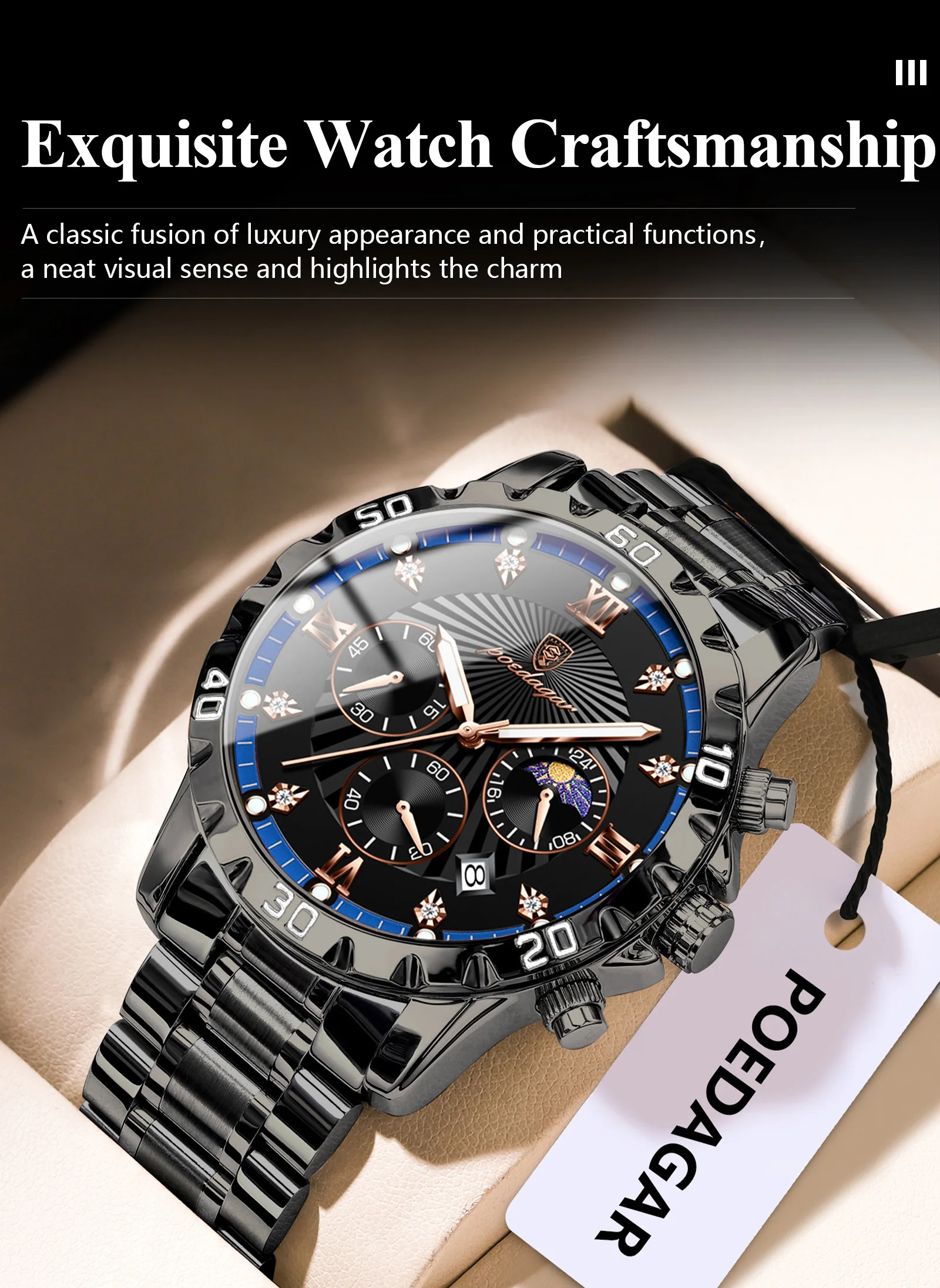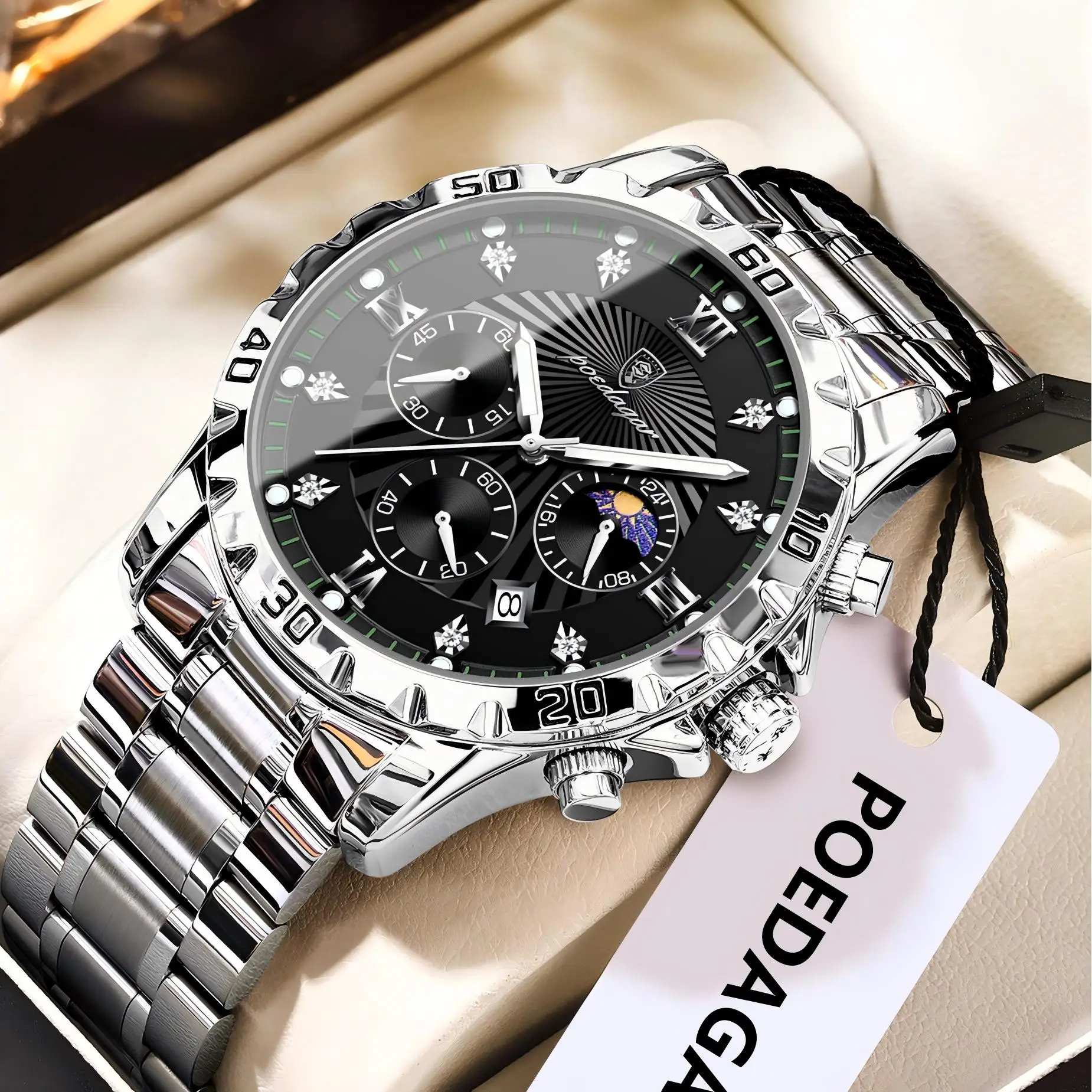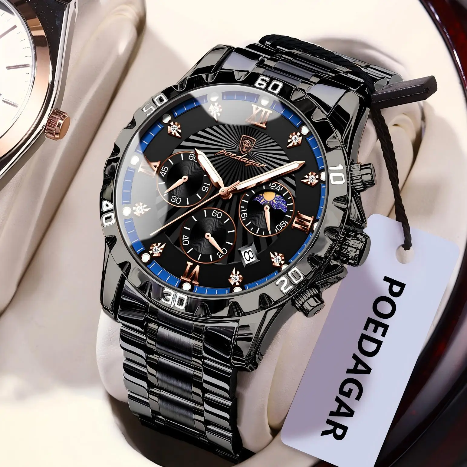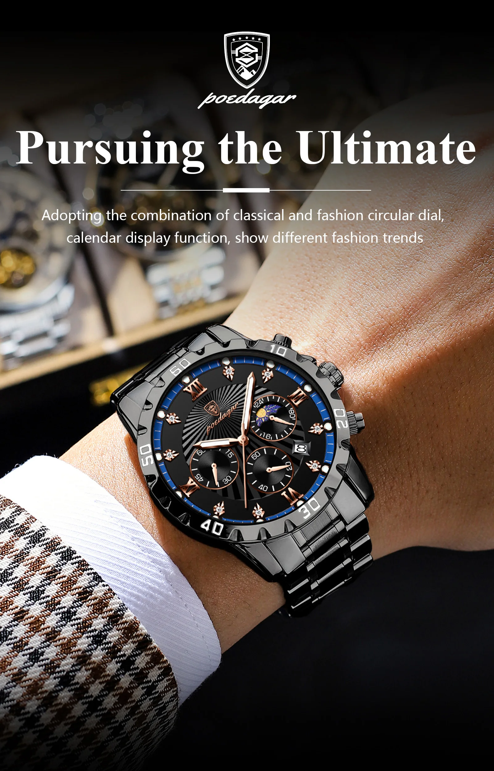POEDAGAR LUXURY MEN'S STAINLESS STEEL CHRONOGRAPH WRISTWATCH
