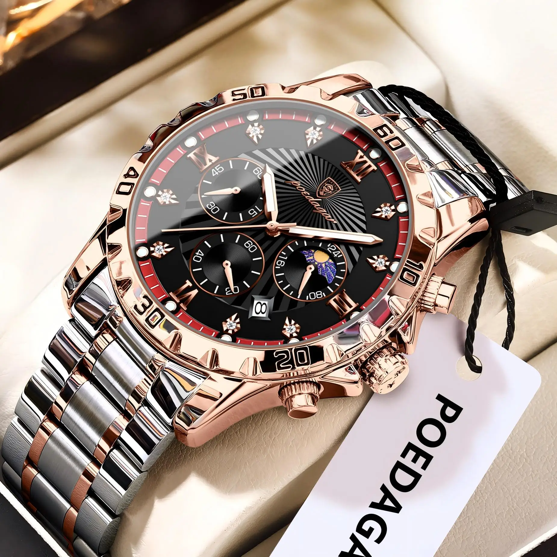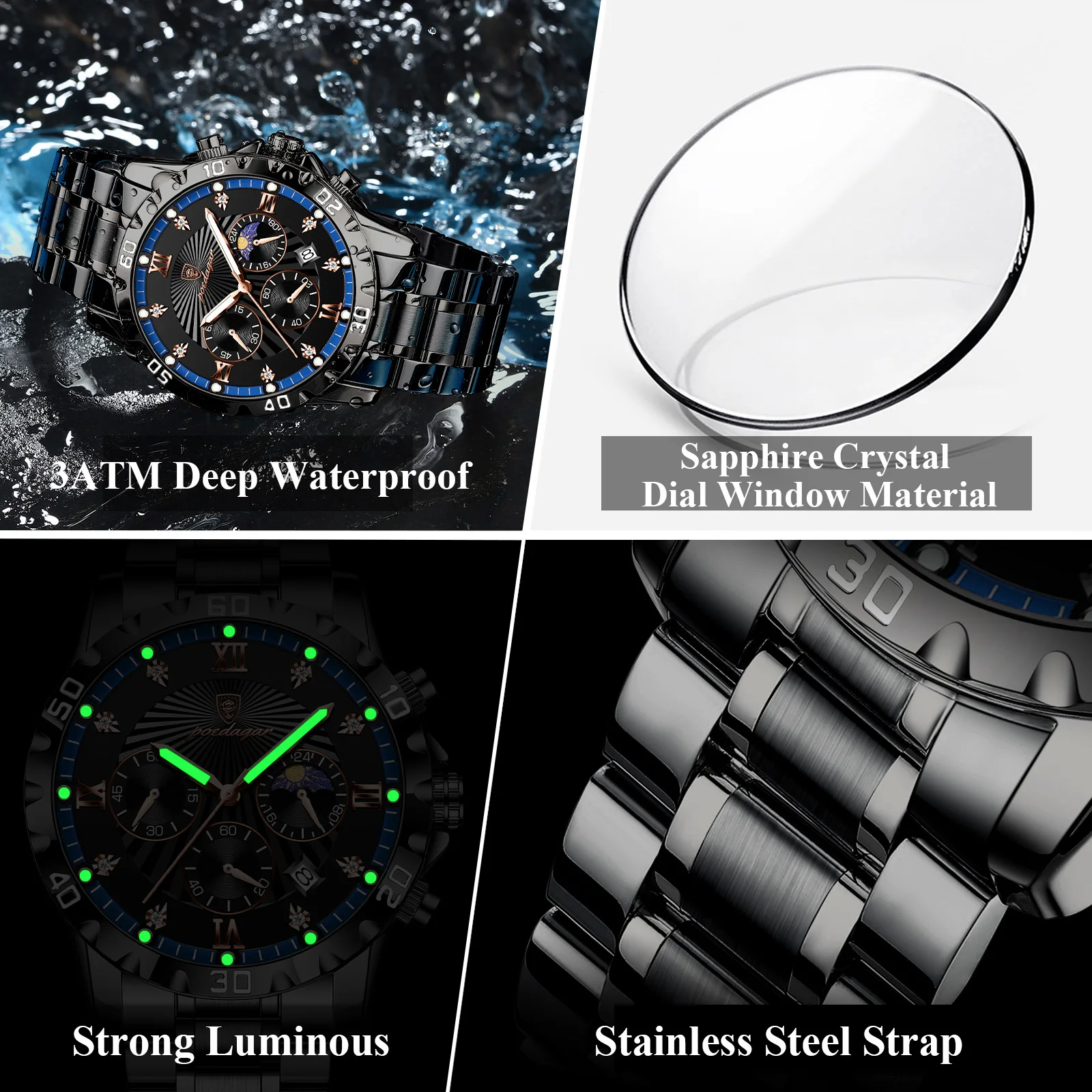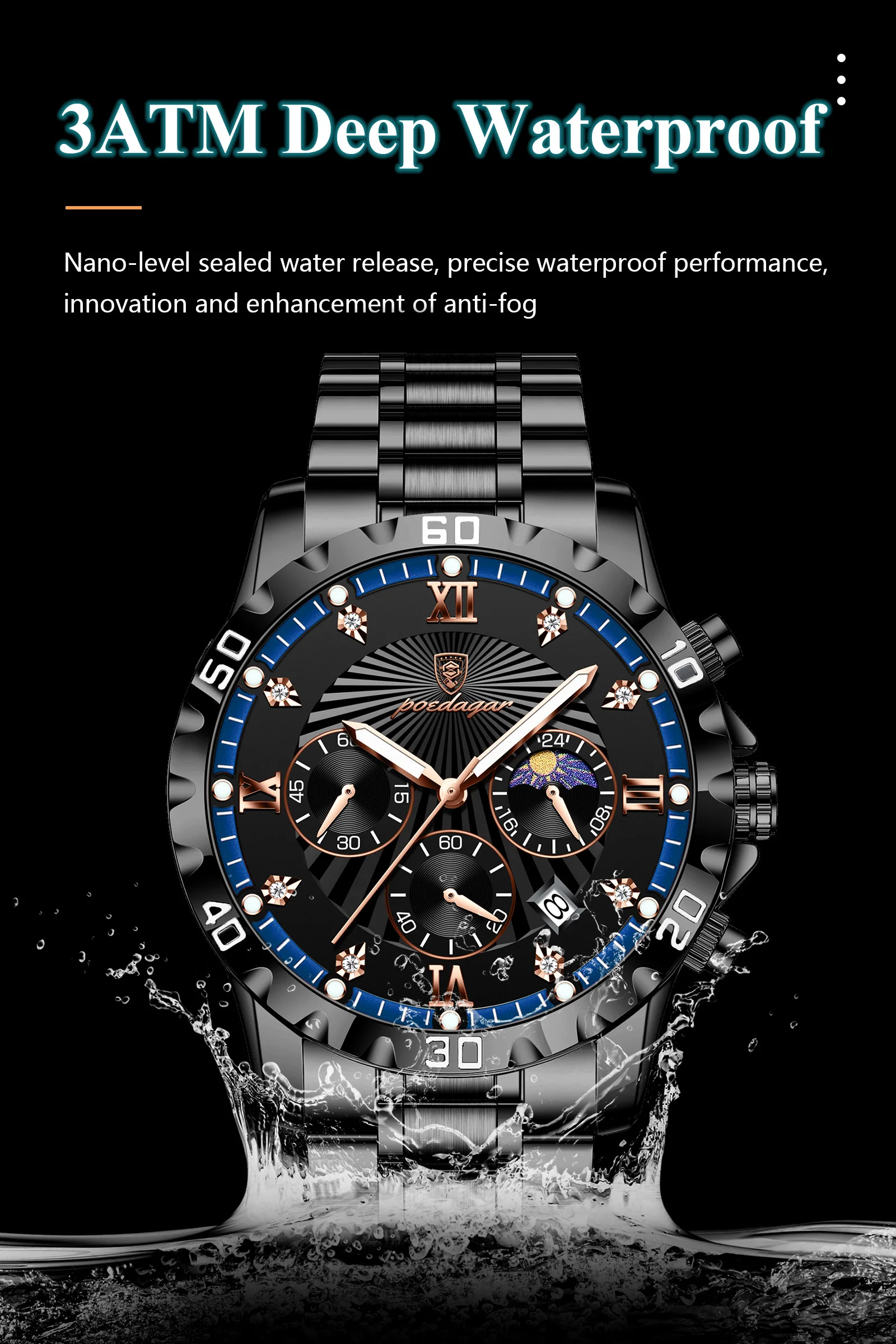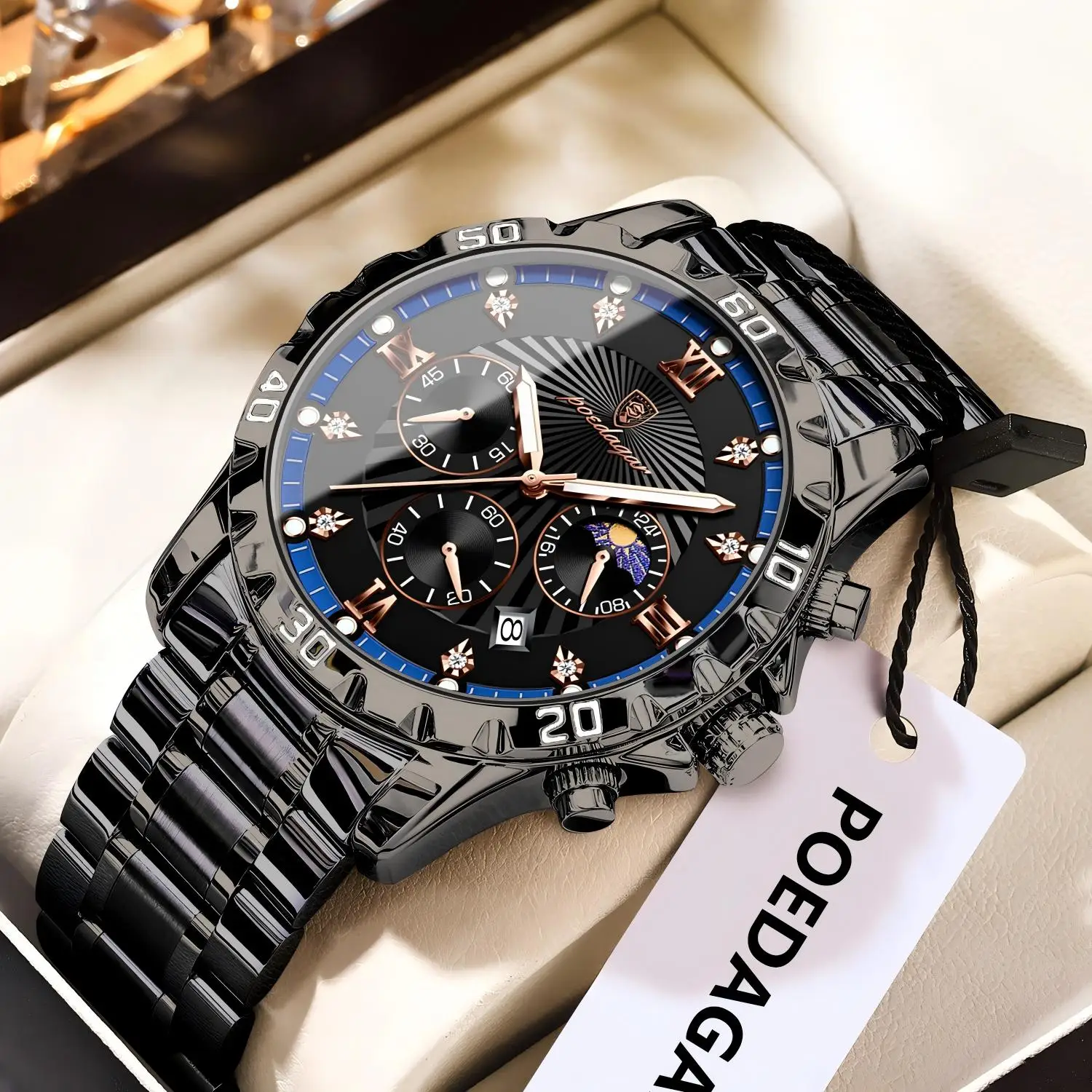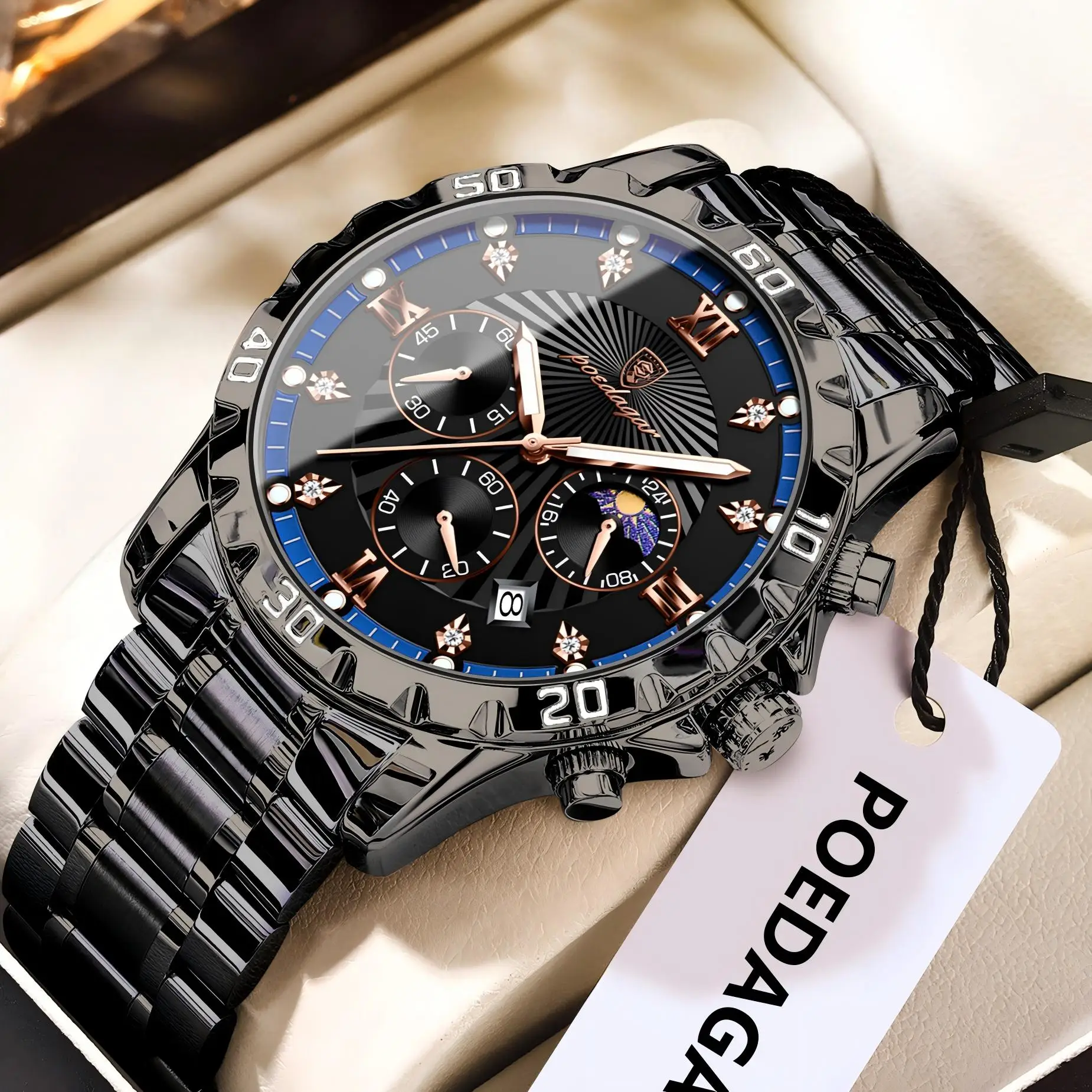 POEDAGAR LUXURY MEN'S STAINLESS STEEL CHRONOGRAPH WRISTWATCH