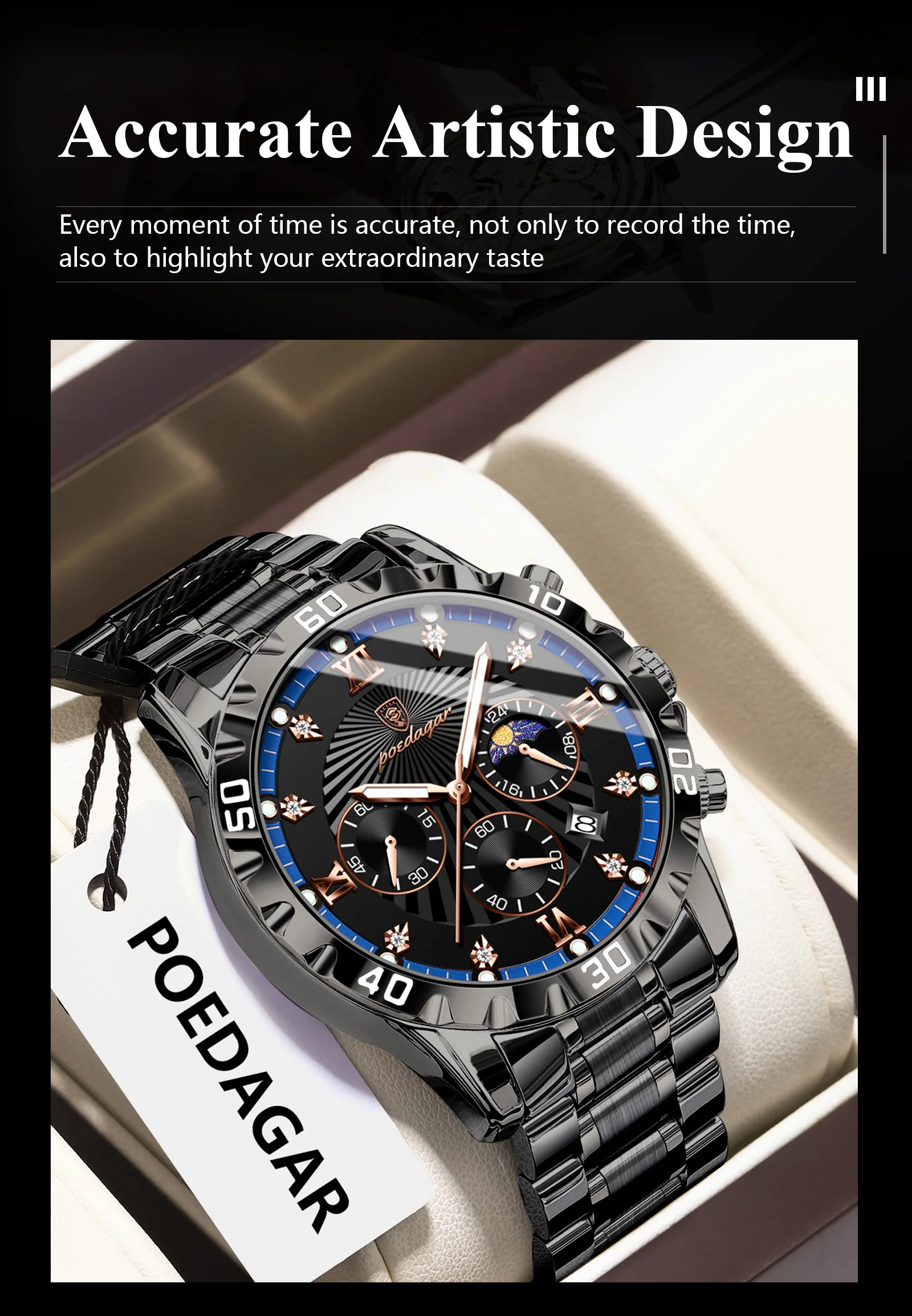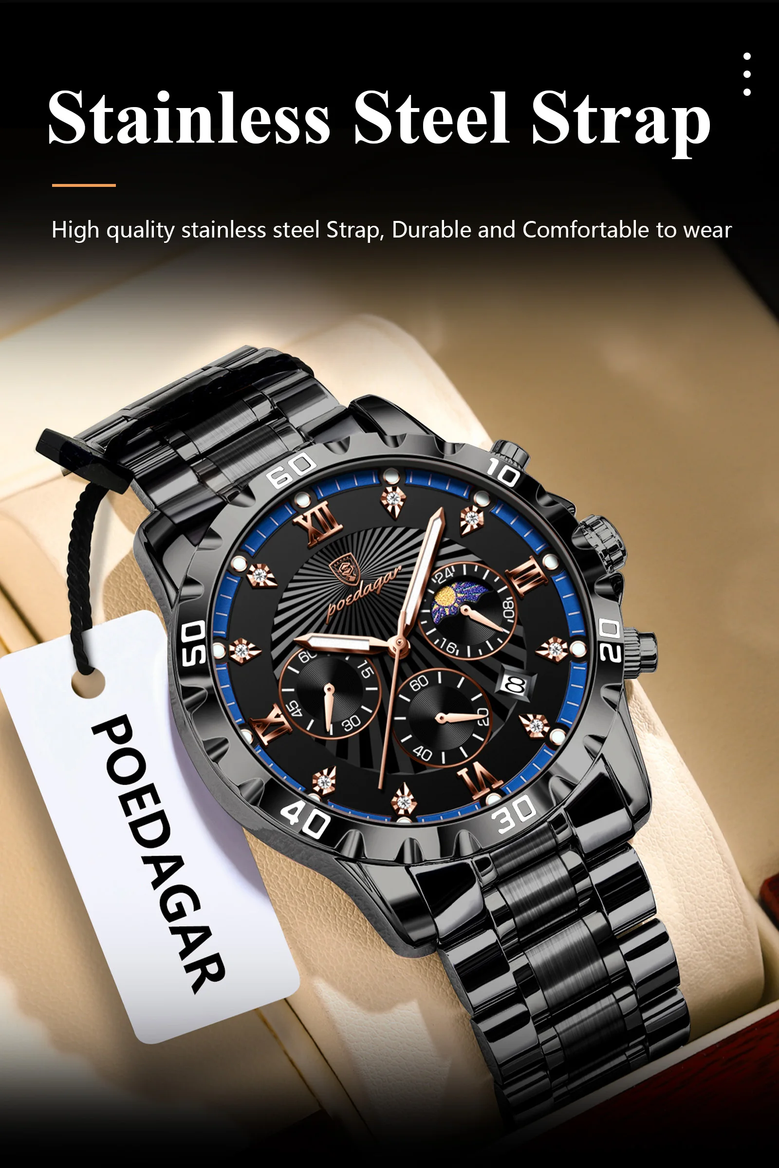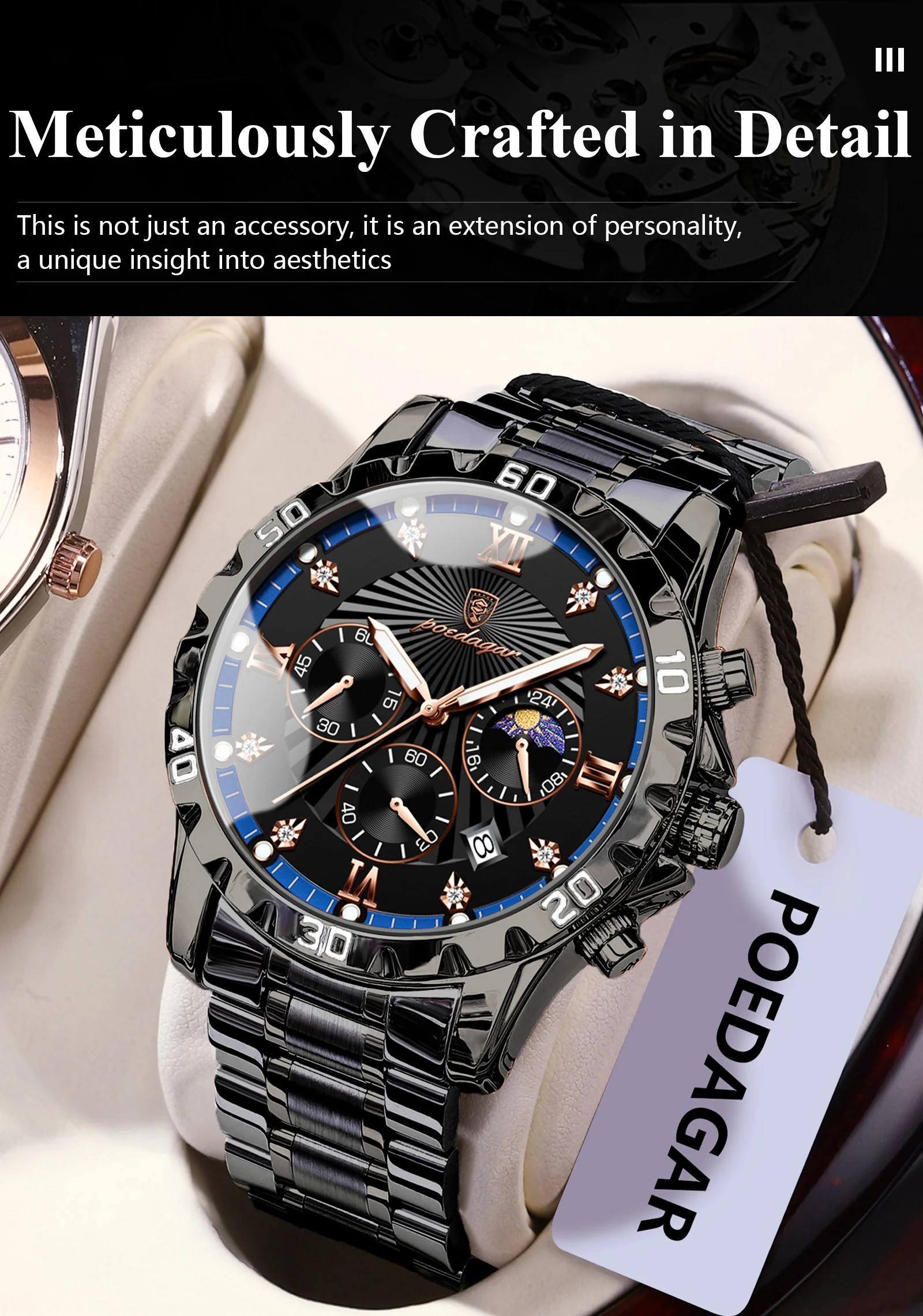 Crafted from high-grade stainless steel with a durable mineral glass dial window, this watch is built to last. Its robust construction ensures longevity, while the quality quartz movement provides consistent accuracy. To maintain its pristine condition, simply wipe the watch with a soft, dry cloth. Avoid exposure to harsh chemicals or extreme temperatures to preserve its luster and functionality for years to come. The POEDAGAR Luxury Men's Wristwatch is an investment in enduring style and dependable performance, making it an ideal gift for yourself or a loved one.