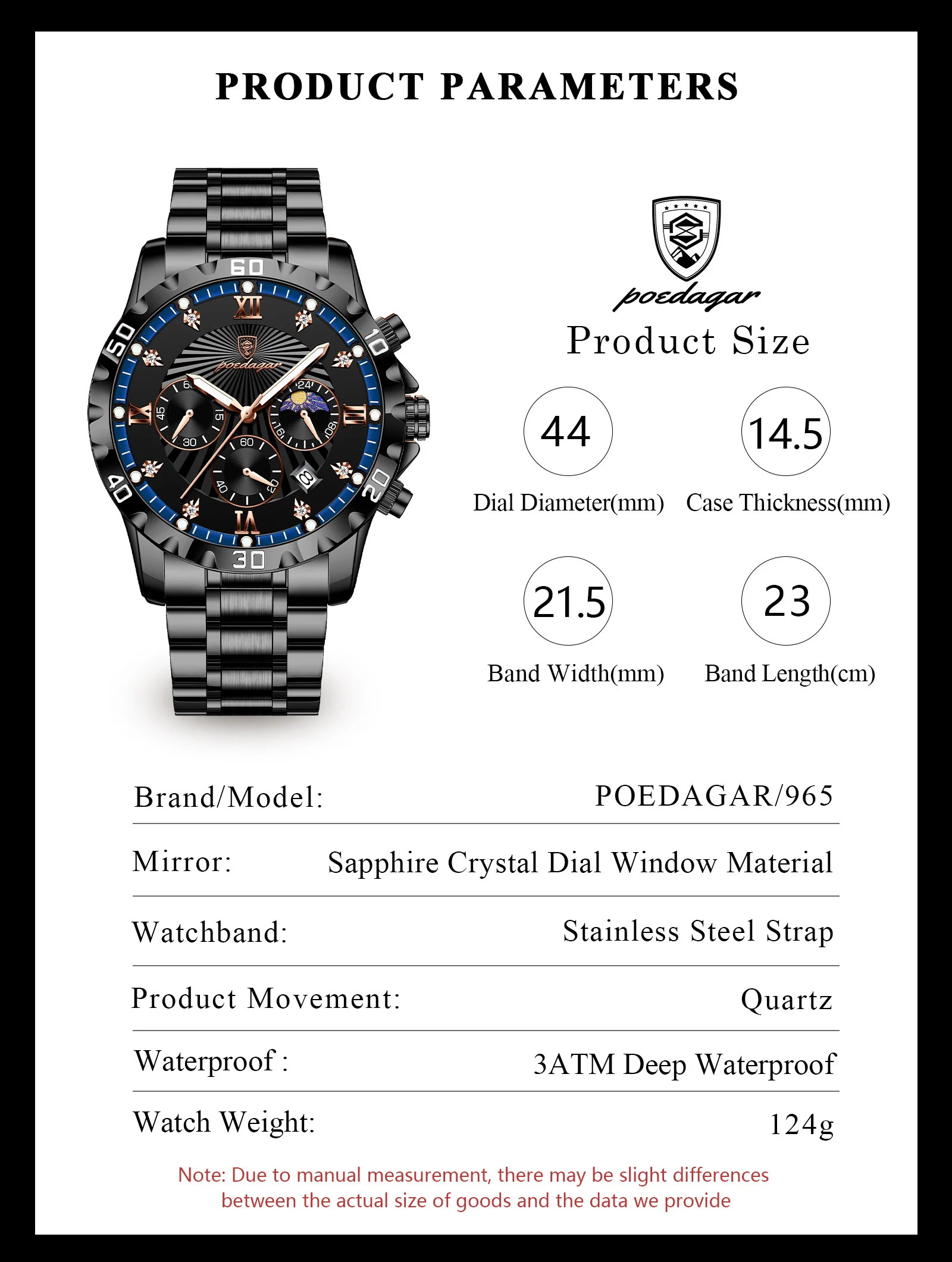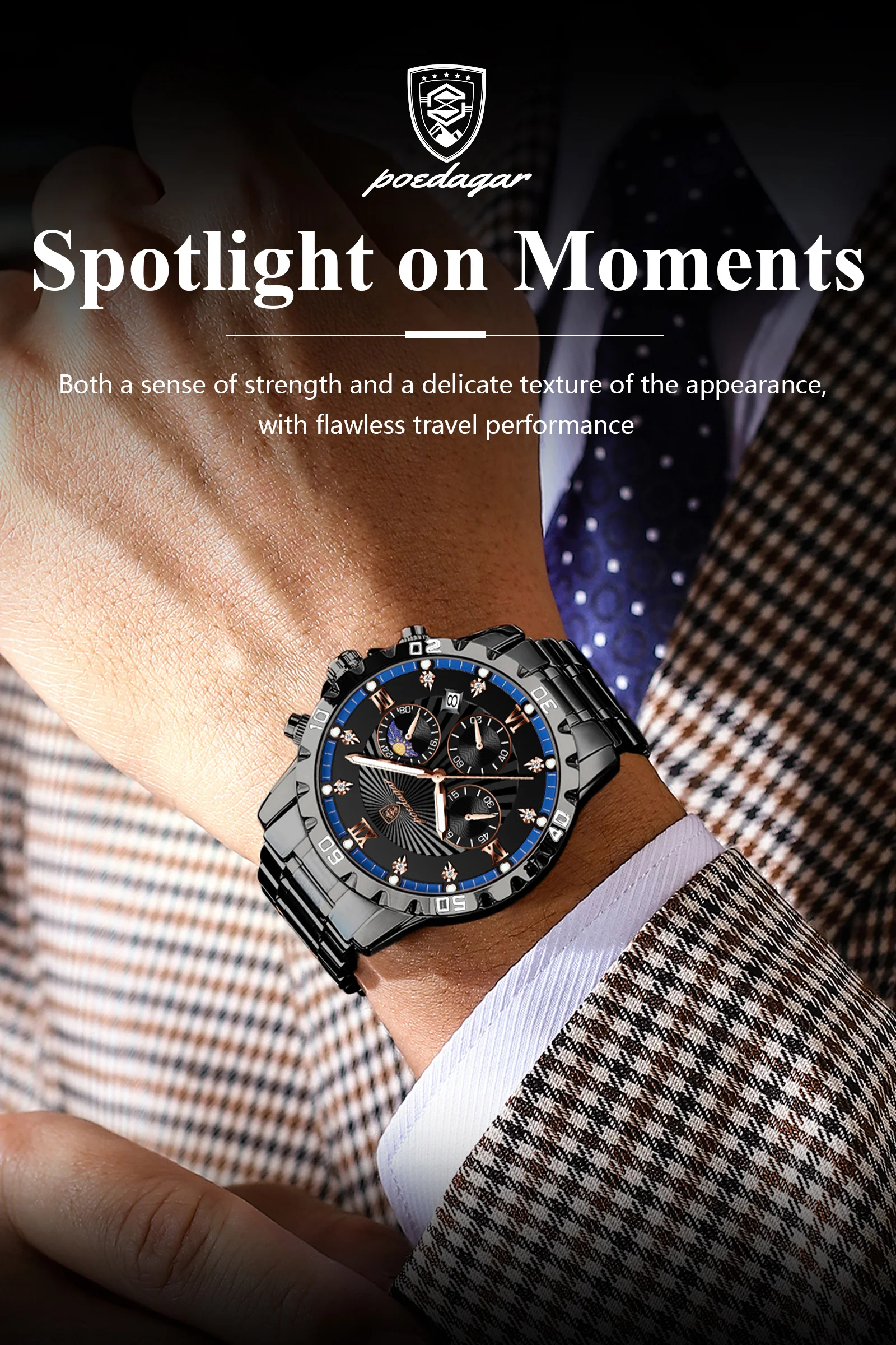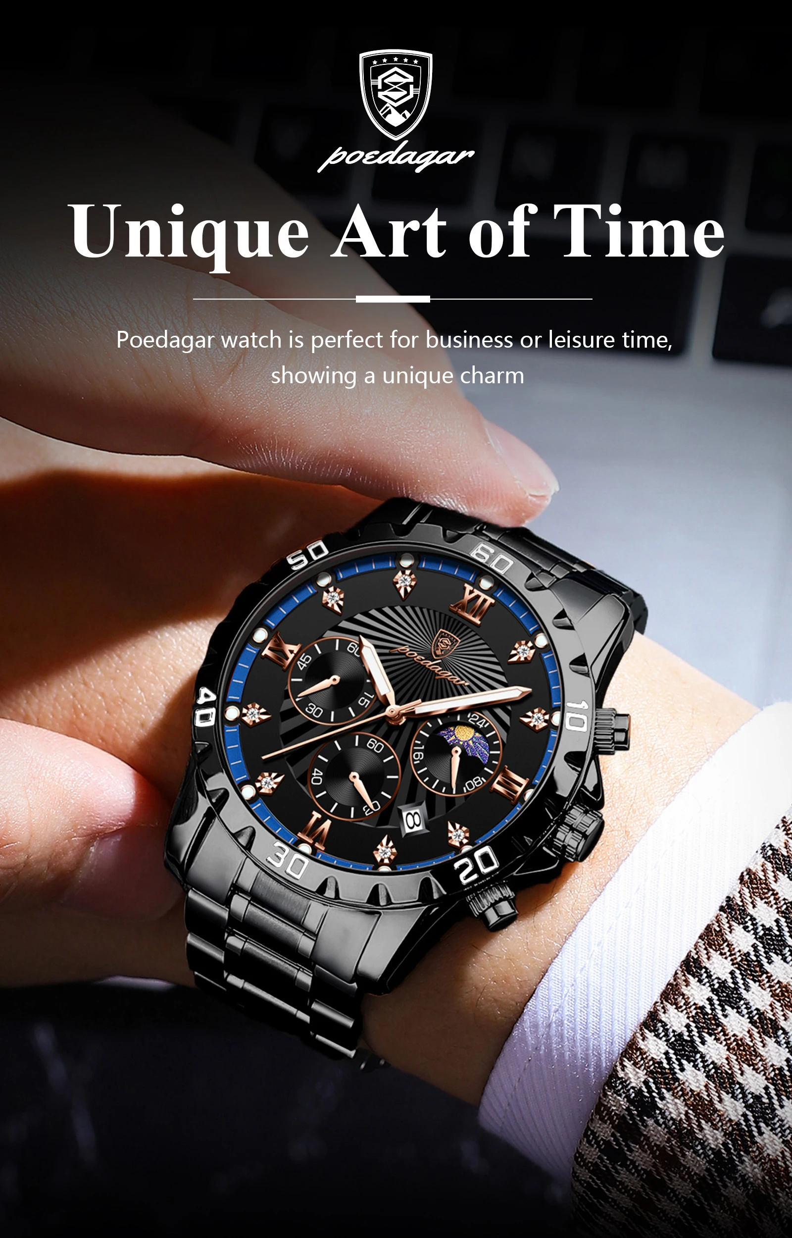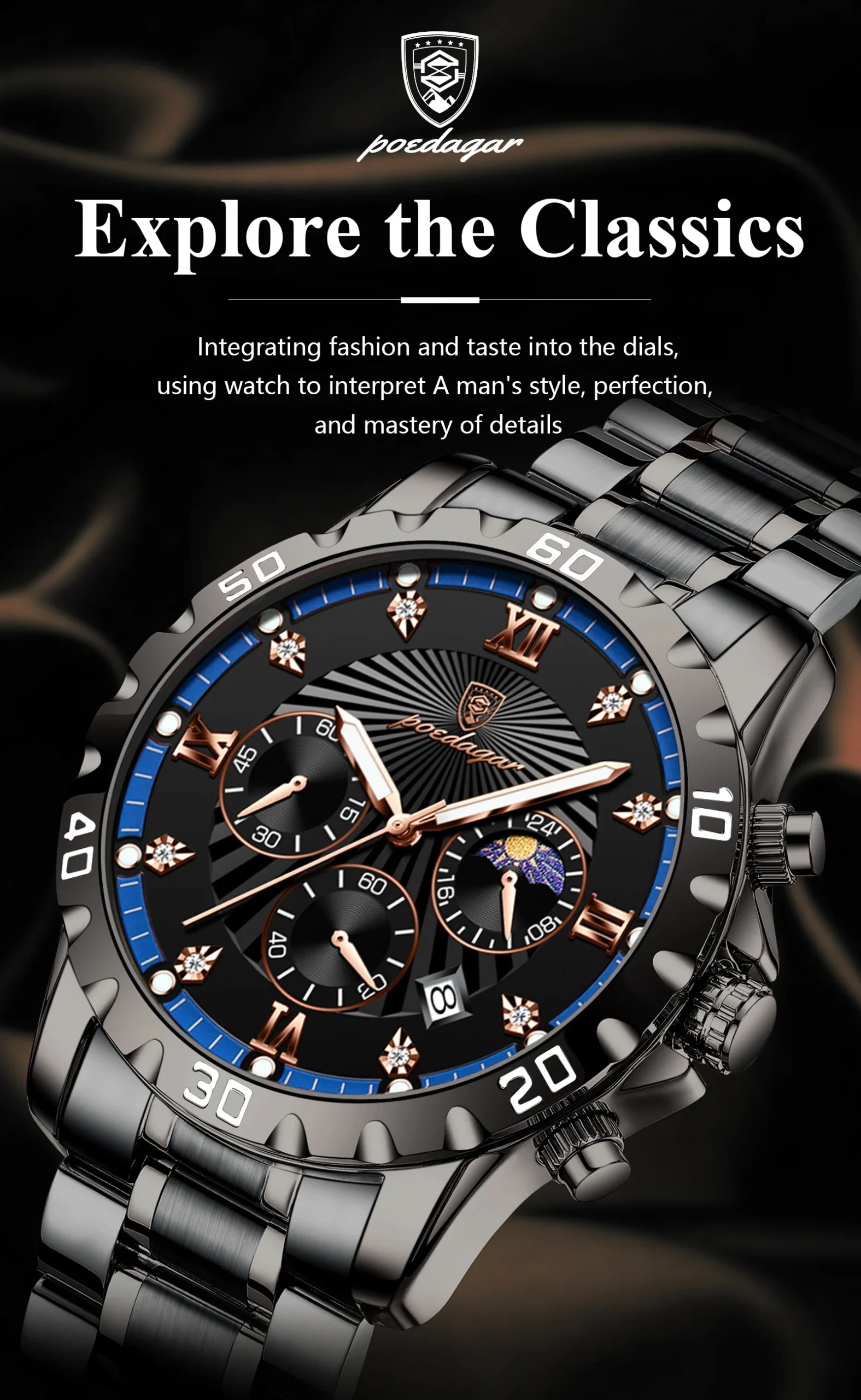 Crafted from high-grade stainless steel with a durable mineral glass dial window, this watch is built to last. Its robust construction ensures longevity, while the quality quartz movement provides consistent accuracy. To maintain its pristine condition, simply wipe the watch with a soft, dry cloth. Avoid exposure to harsh chemicals or extreme temperatures to preserve its luster and functionality for years to come. The POEDAGAR Luxury Men's Wristwatch is an investment in enduring style and dependable performance, making it an ideal gift for yourself or a loved one.