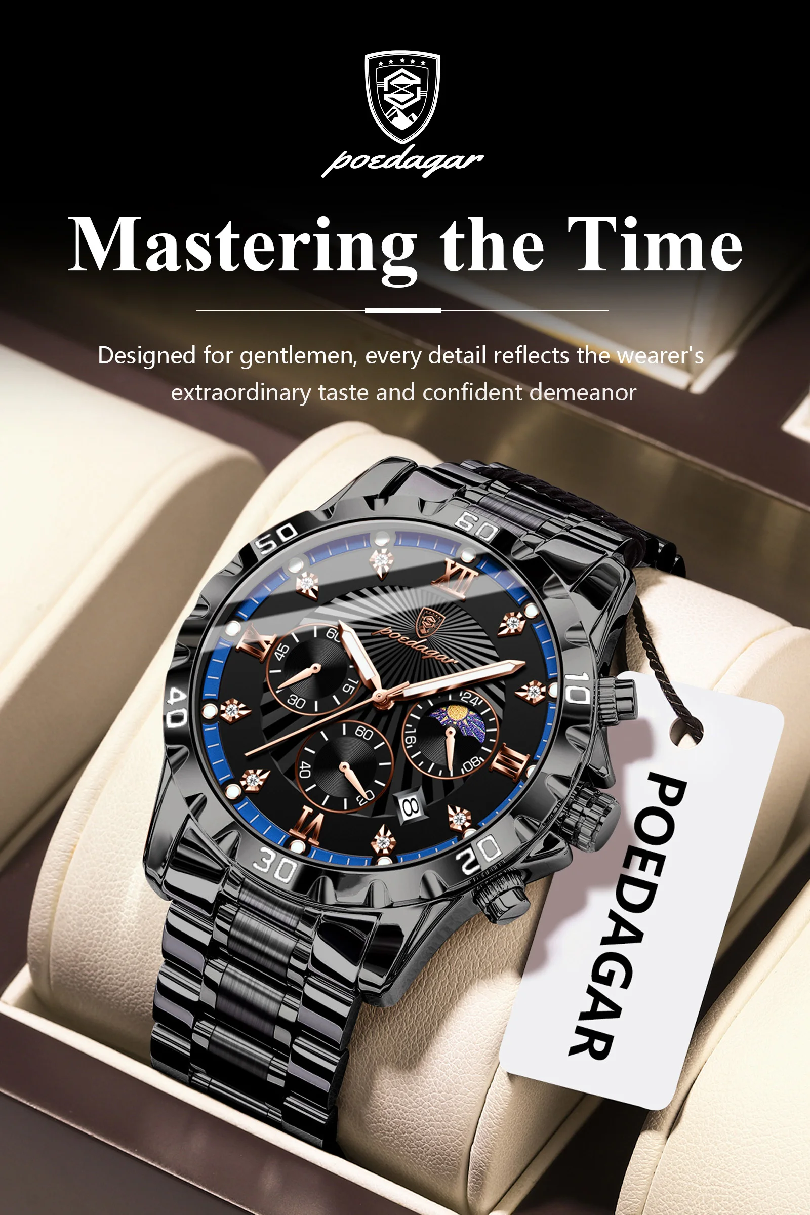 Elevate your personal style and command attention with the POEDAGAR Luxury Men's Stainless Steel Chronograph Wristwatch. More than just a timepiece, this sophisticated 'Reloj' is a testament to precision engineering and timeless design, crafted for the discerning gentleman who values both form and function. It's a statement piece designed to complement every facet of your life, from crucial business meetings to casual weekend escapes.