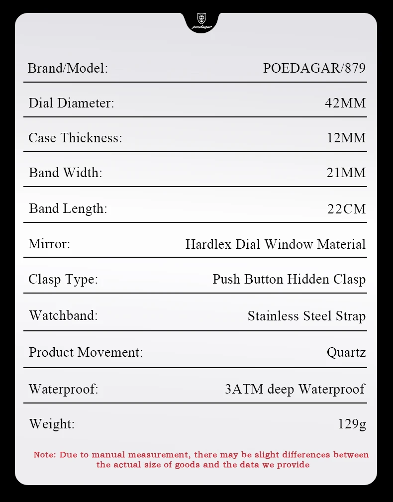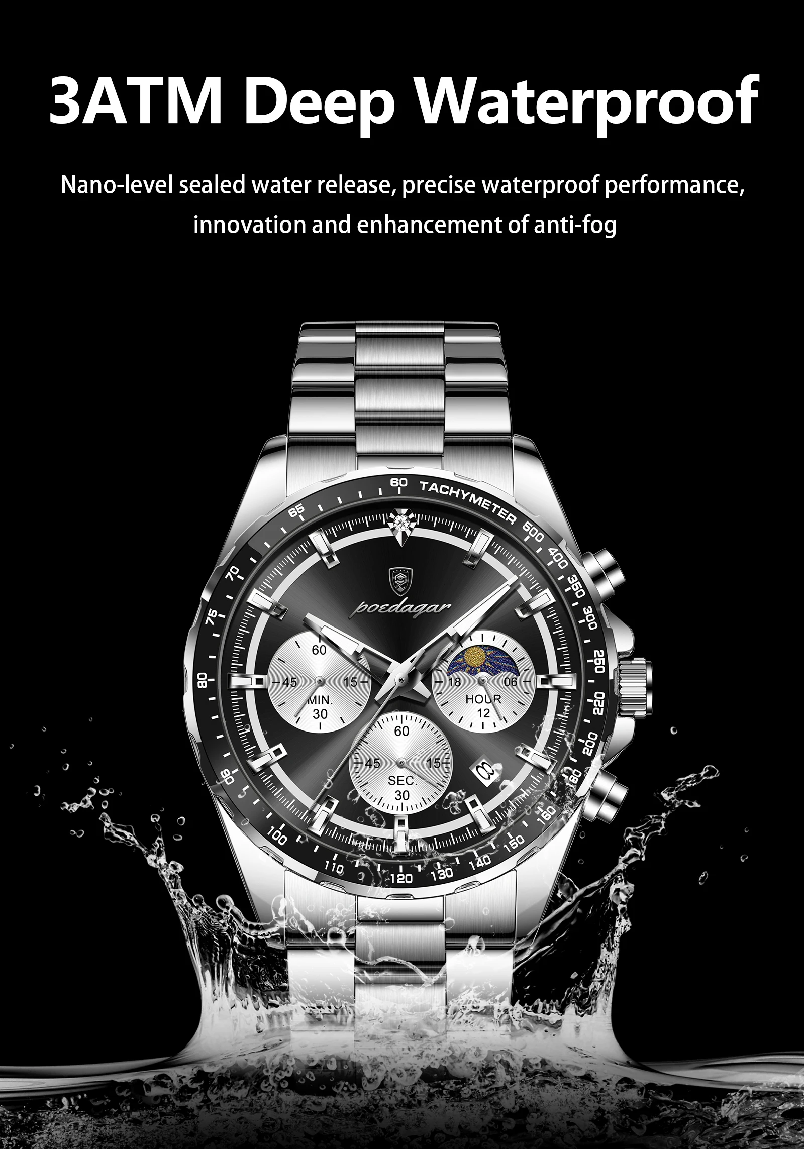 Crafted from high-grade stainless steel, this watch is built to withstand the rigors of daily life while maintaining its pristine appearance. The precise quartz movement ensures consistent accuracy, requiring minimal upkeep. While designed for water resistance suitable for splashes and rain, it is advisable to avoid hot water or steam to preserve its integrity. To maintain its lustrous finish, simply wipe the watch regularly with a soft, dry cloth. This POEDAGAR timepiece represents an investment in enduring style and unparalleled reliability.