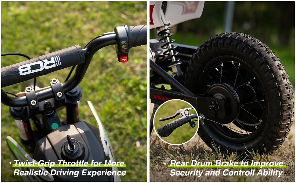– Easy-to-use throttle and brake controls designed for young riders’ safety and comfort