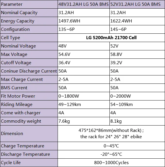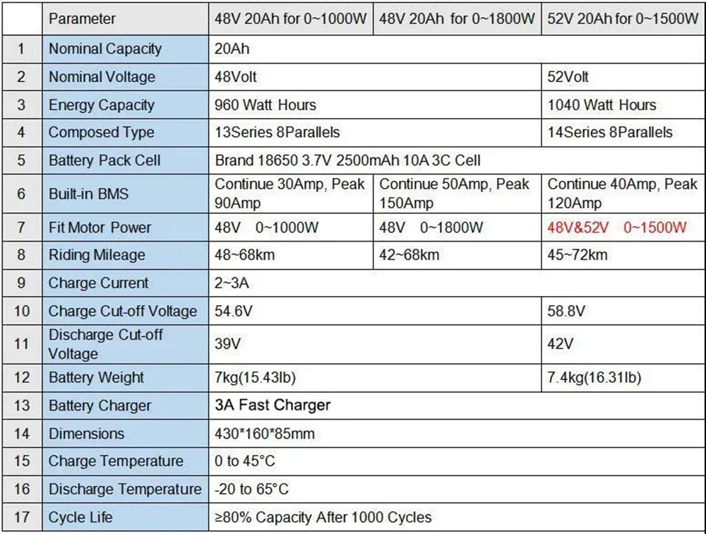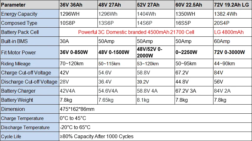 – High Capacity Variants: Choose from capacities such as 18 Ah, 20 Ah, 27 Ah, 28.8 Ah, 31.2 Ah, and up to 36 Ah for extended range and longer ride times.