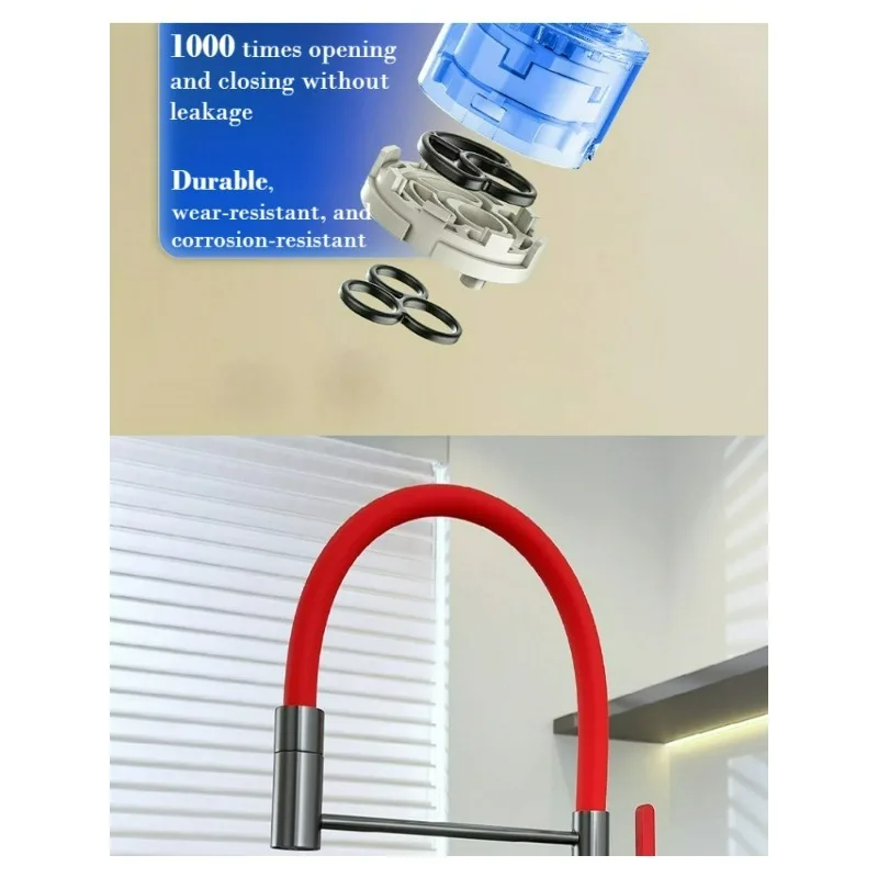 The Red Kitchen Faucet is engineered to simplify your daily routine. The pull-out sprayer, with its generous reach, makes rinsing vegetables, filling large pots, and cleaning the sink basin incredibly easy. The 360-degree swivel function ensures no corner of your sink is out of reach, enhancing your cleaning efficiency. Adjusting water temperature and flow is a breeze with the single-handle design, allowing for precise control and quick transitions between tasks. This faucet isn’t just about aesthetics; it’s about creating a more enjoyable and efficient kitchen environment where functionality meets flawless design.