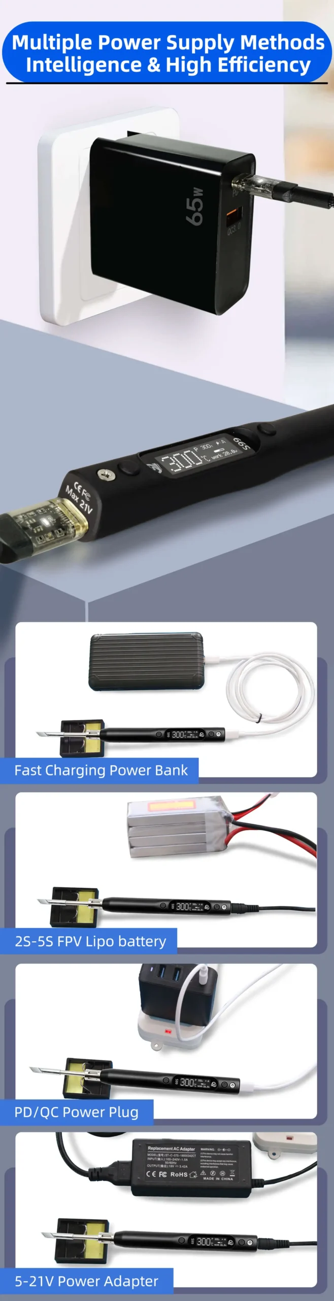 – Support for PD (Power Delivery), QC (Quick Charge), DC, and PPS power supplies for flexible and efficient operation.