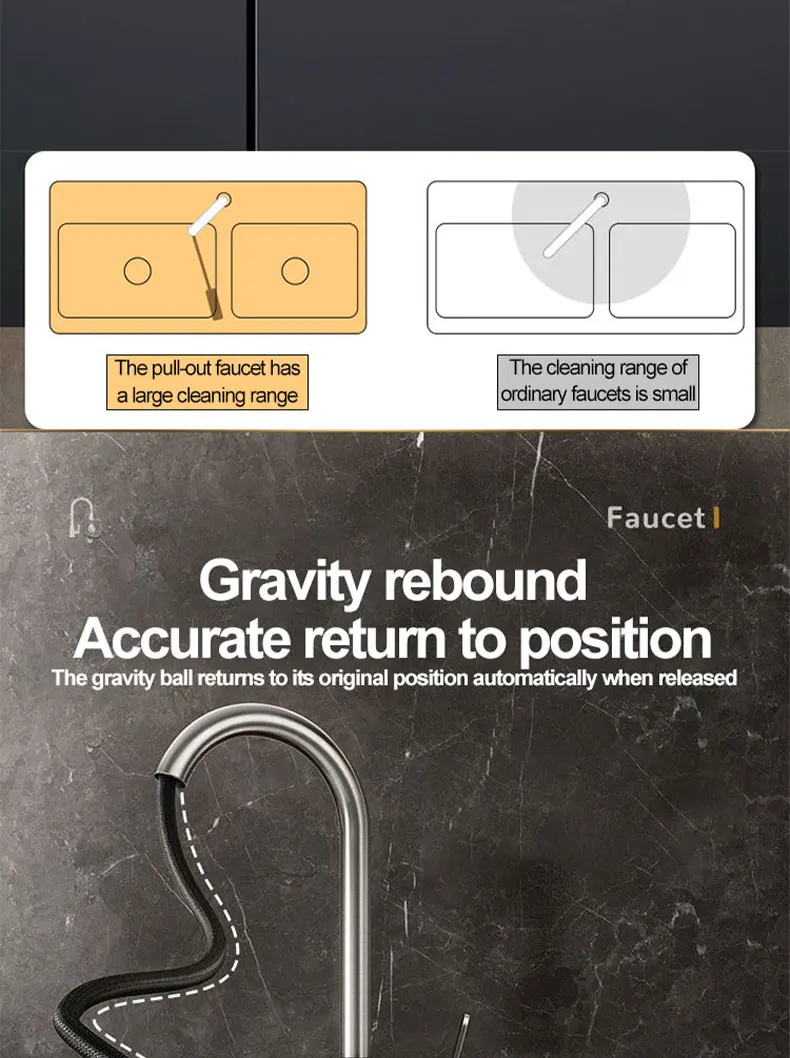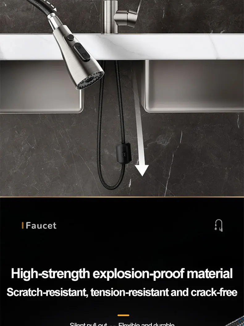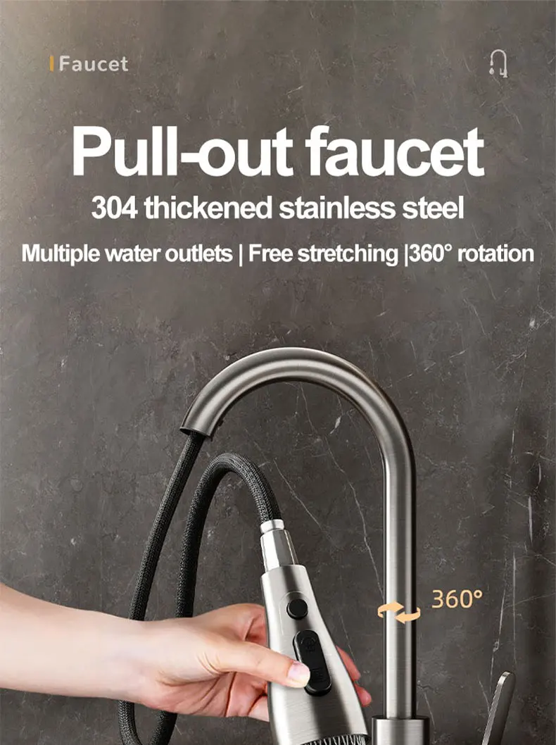 Introducing a revolutionary addition to your kitchen: our state-of-the-art Stainless Steel Kitchen Pull-Out Faucet. Designed to seamlessly blend advanced functionality with sophisticated aesthetics, this faucet is engineered to transform your daily kitchen tasks into a smooth, efficient, and enjoyable experience. Say goodbye to water splashes and limited reach, and welcome a new era of convenience and elegance.