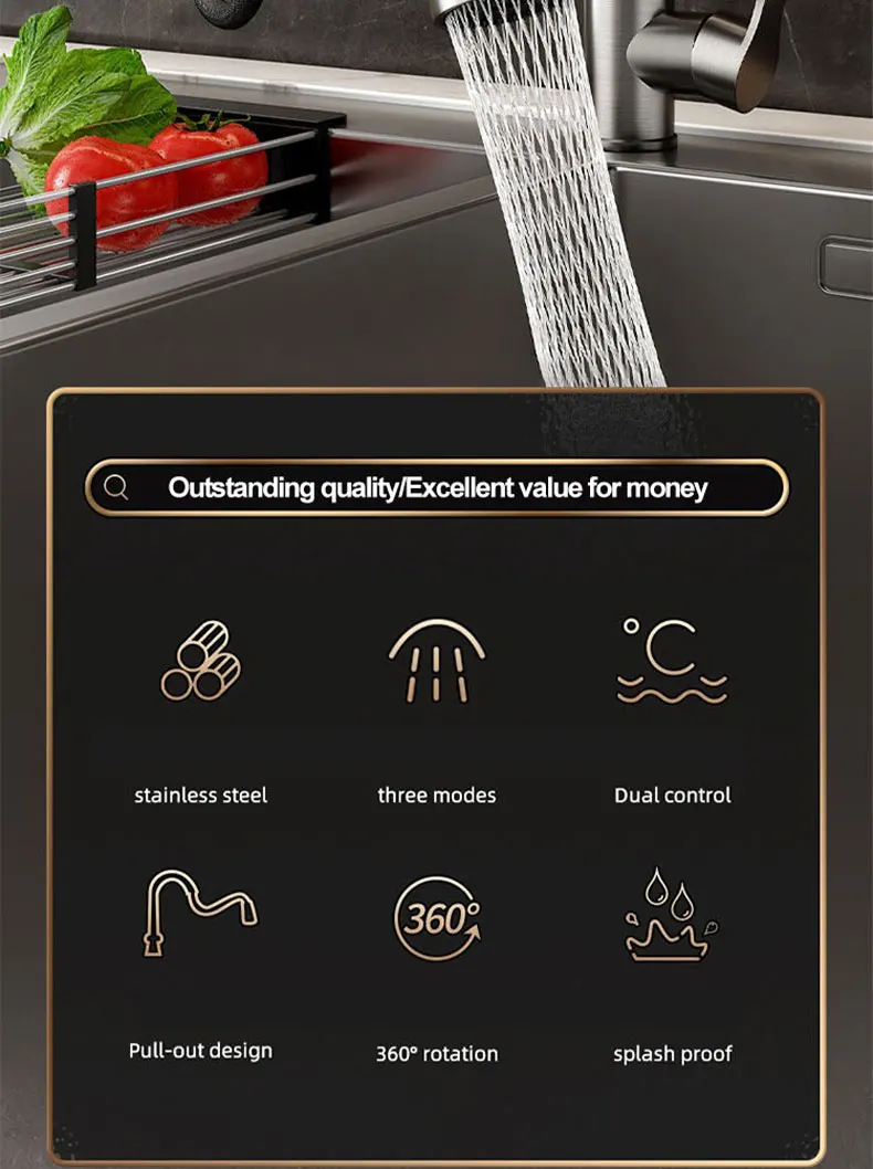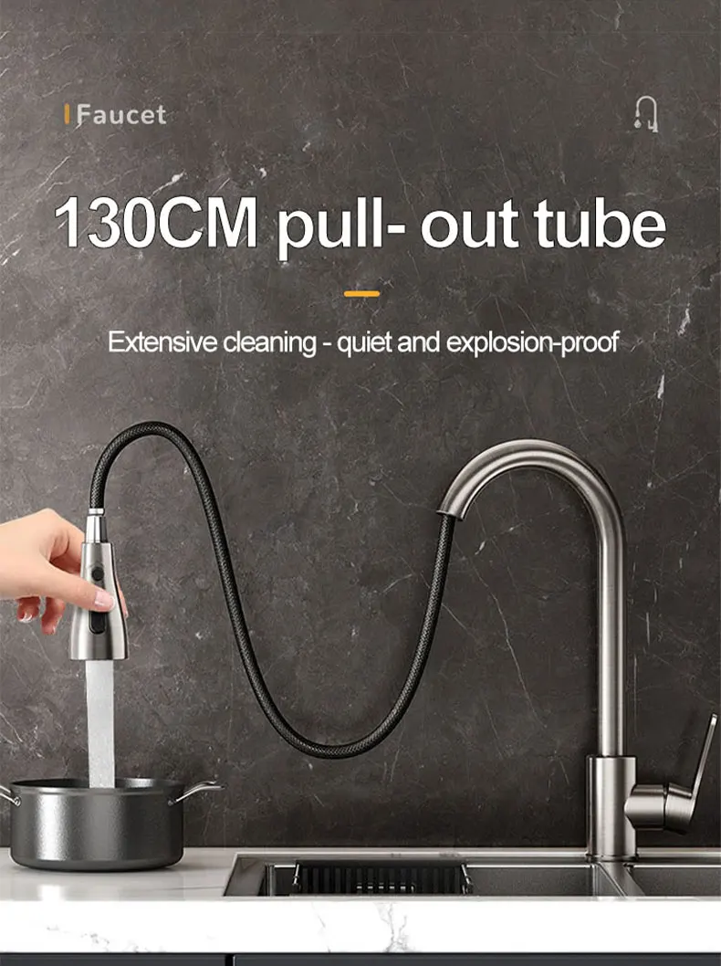Transform your kitchen sink into a hub of efficiency. The pull-out functionality makes washing large pots and pans effortless, while the versatile spray modes offer precision for tasks like rinsing fruits and vegetables or cleaning the sink itself. Reduce water waste and keep your kitchen tidy with the splash-proof design, enhancing both hygiene and convenience. Its ergonomic design ensures comfortable use, making even mundane chores feel more manageable. This faucet is ideal for busy households, home chefs, and anyone seeking to upgrade their kitchen's performance and style.