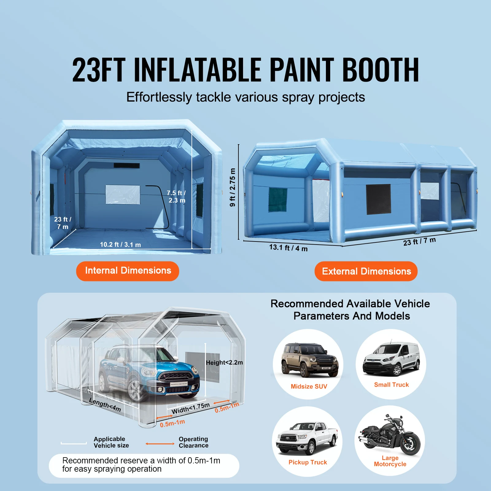This inflatable spray booth creates an ideal workspace that protects your paint job from dust, debris, and environmental pollutants. Its portability allows you to set up the booth virtually anywhere, providing flexibility for on-site repairs or mobile painting services. The powerful blower system ensures a constant flow of clean air, promoting faster drying times and smoother finishes. Whether you are painting a car, motorcycle, or large equipment, the booth’s spacious interior and customizable size options cater to diverse needs, enhancing productivity and ensuring professional results every time.