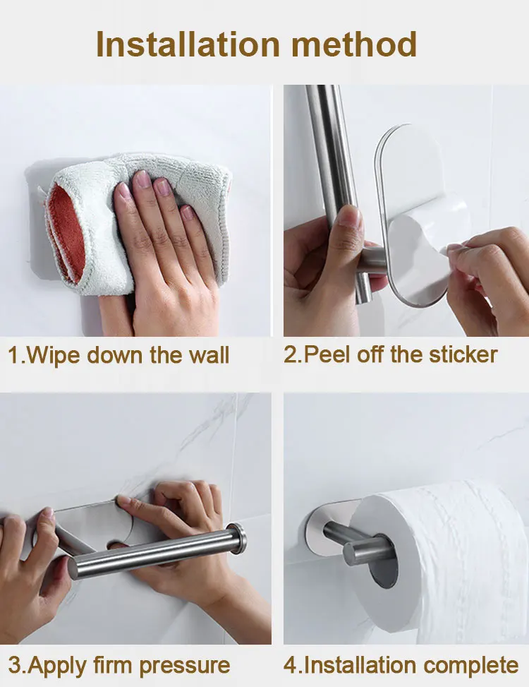 This toilet paper holder is more than just an accessory; it's a smart upgrade that simplifies your life. The strong adhesive backing provides a reliable hold on tiles, glass, wood, and painted walls, so you can trust it to stay put. Its minimalist aesthetic ensures it won't overpower your existing design, instead offering a subtle yet impactful enhancement. Enjoy the convenience of having your paper products readily accessible, keeping your surfaces clear and your space looking its best. The stainless steel material guarantees hygienic use and easy cleaning, making it a practical and long-term investment for any home.