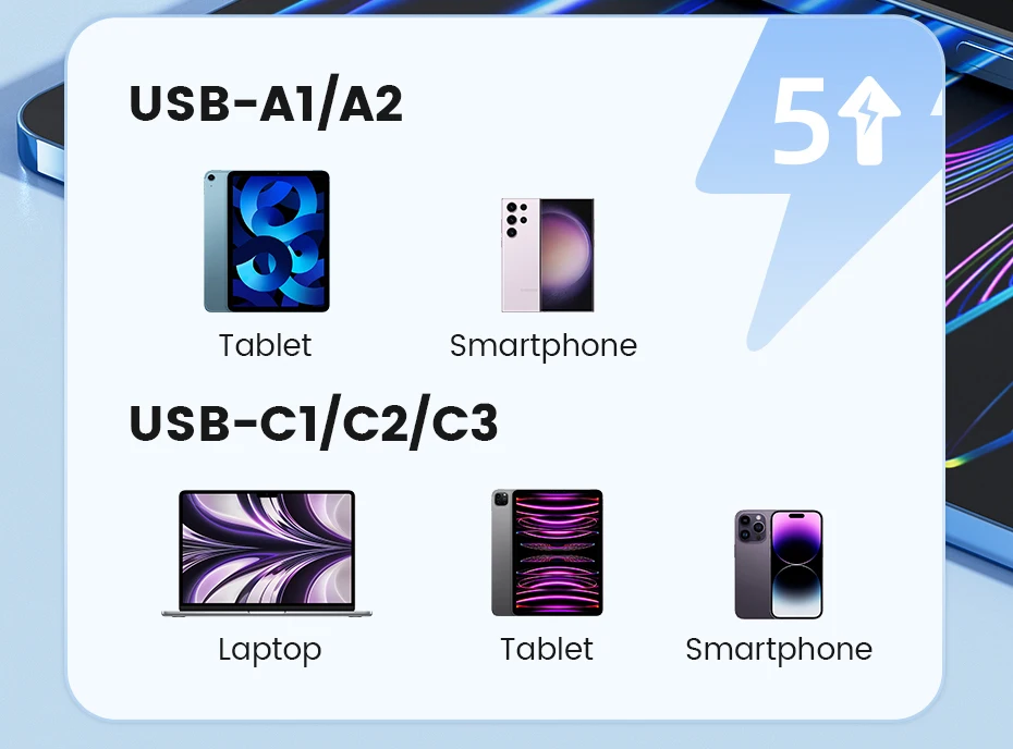 – 5-in-1 charging ports including multiple USB Type-C and USB-A outputs for versatile connectivity