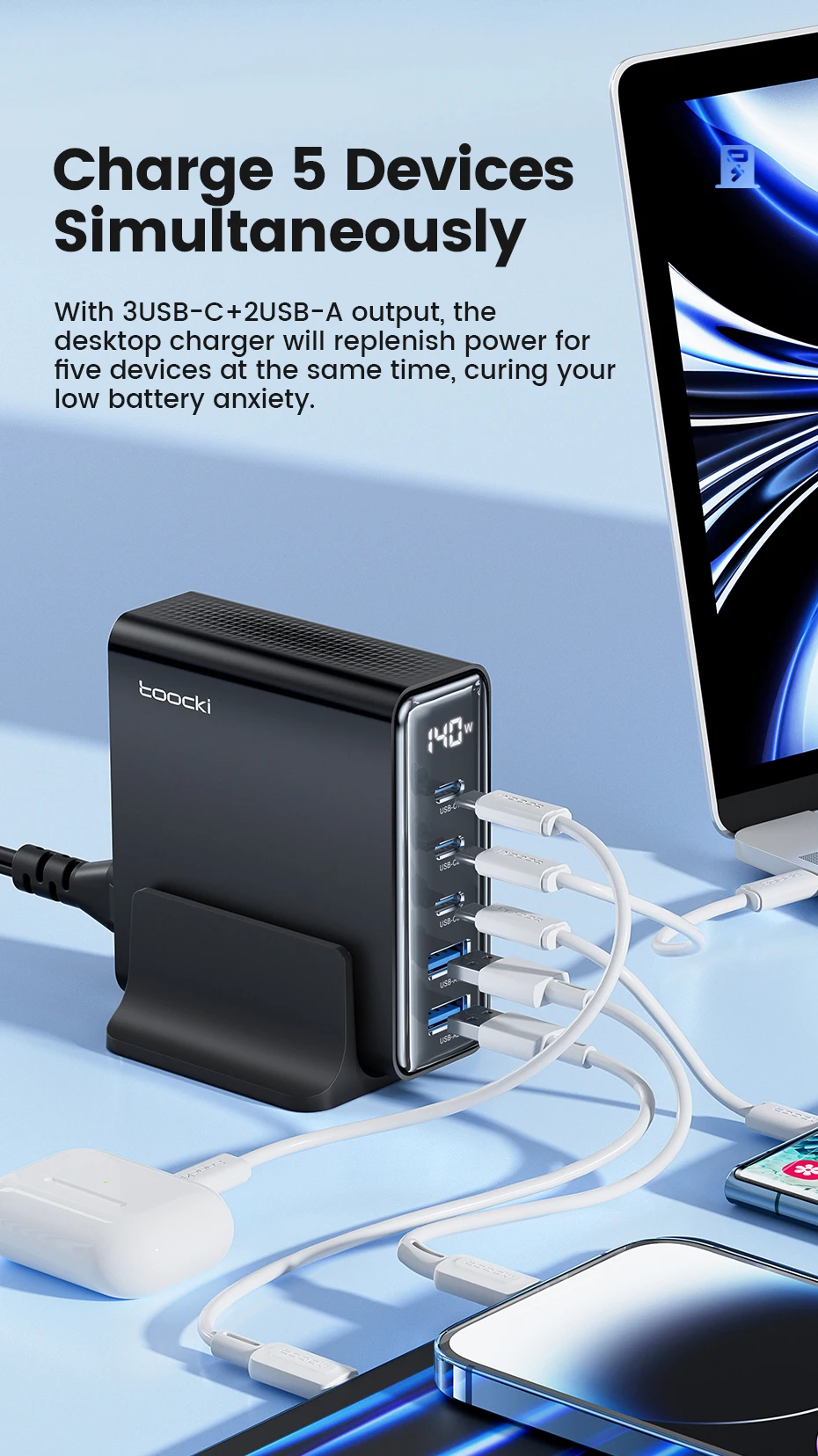 Experience the ultimate charging convenience with the Toocki 140W GaN USB Charger. Designed to efficiently power multiple devices simultaneously, this 5-in-1 desktop charger is perfect for users who demand fast, reliable, and safe charging for their smartphones, laptops, and other USB Type-C compatible electronics. Its sleek design and advanced Gallium Nitride (GaN) technology make it an essential accessory for home, office, or travel use.